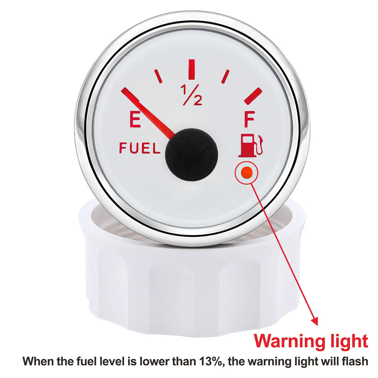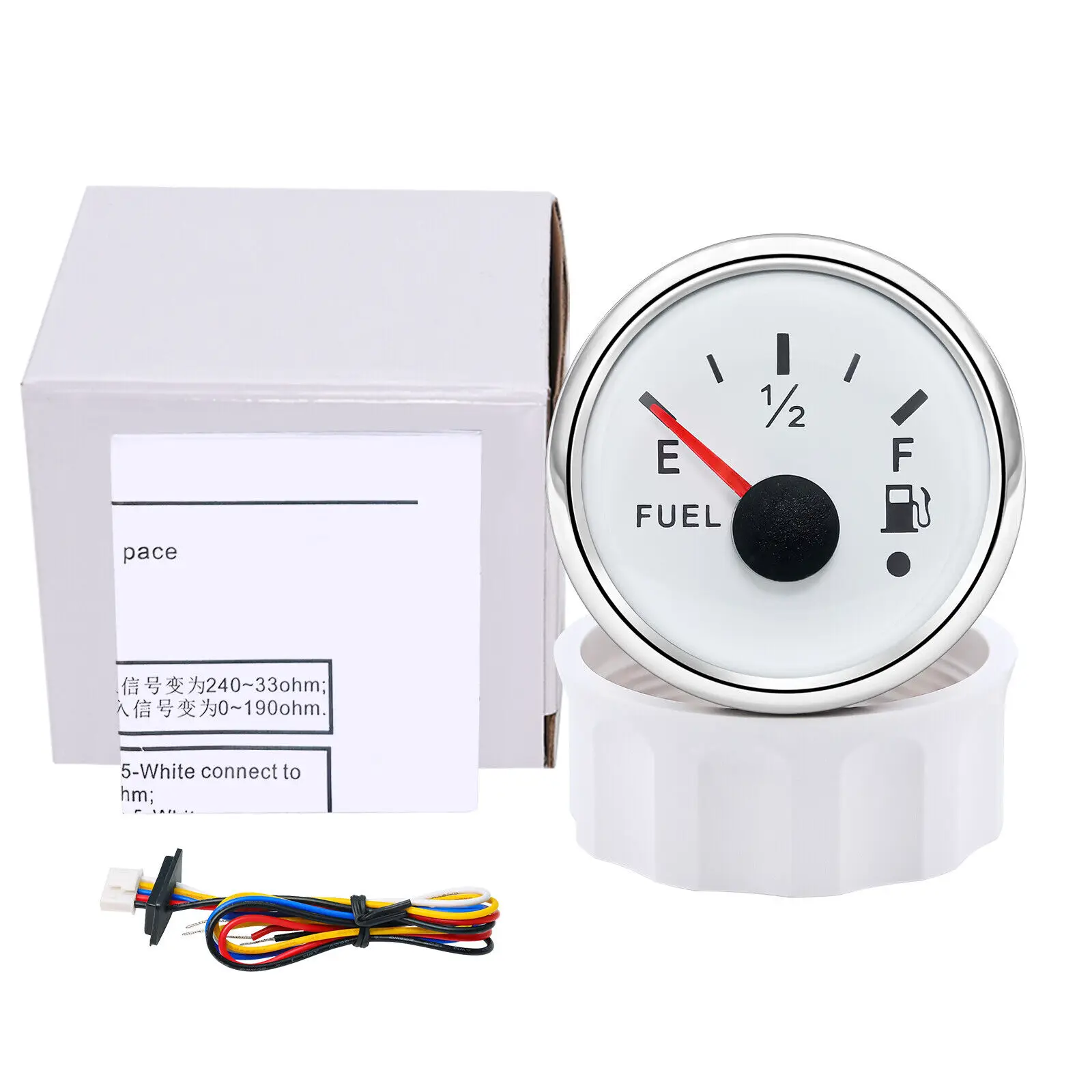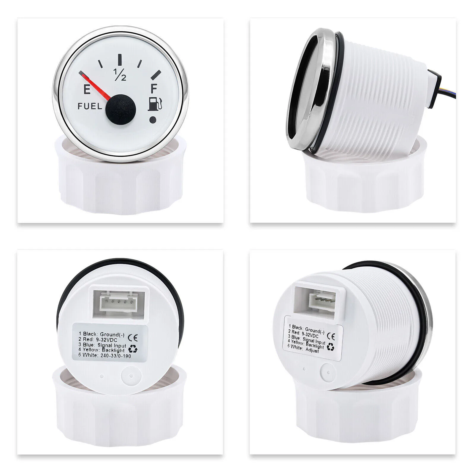 Fuel gaugeThis is a high quality fuel level gauge.for most fuel level sensors Description:Fit For: Car Truck Motorcycle ATV UTV Marine BoatFace Color: WhiteBezel Materials: Stainless SteelIndicating Range: 240-33ohms (240–empty 33–full)Operating Voltage: 9-30VDCOperating Current: ≤60mAOperating Temperature: -30~+75 ??Storage Temperature: -40~+85 ??Install Diameter: 52mm(2-1/16'')Grade Of Protection: IP67Package Method: Neutral boxWhen the fuel level is lower than 13%. the warning light will flash Features:-100% Brand new and high quality.-Excellent anti-fogging performance.-316L Stainless steel bezel with curve glass.-Easy installation with multi-plug socket connection design.-White ground design with red backlightInstallation instructions:1.Before installation. firstly. to open a hole 52mm of the panel .make sure there is a space with (55mm backyard of panel)as well.2. Put the gauge in the hole and screw down.Connection: Red–+9-30VDCBlue–Signal InputYellow–Backlight(+)Black–Ground(-) Package List:1x Fuel Level Gauge1x Wiring Harness1x Instruction Manual