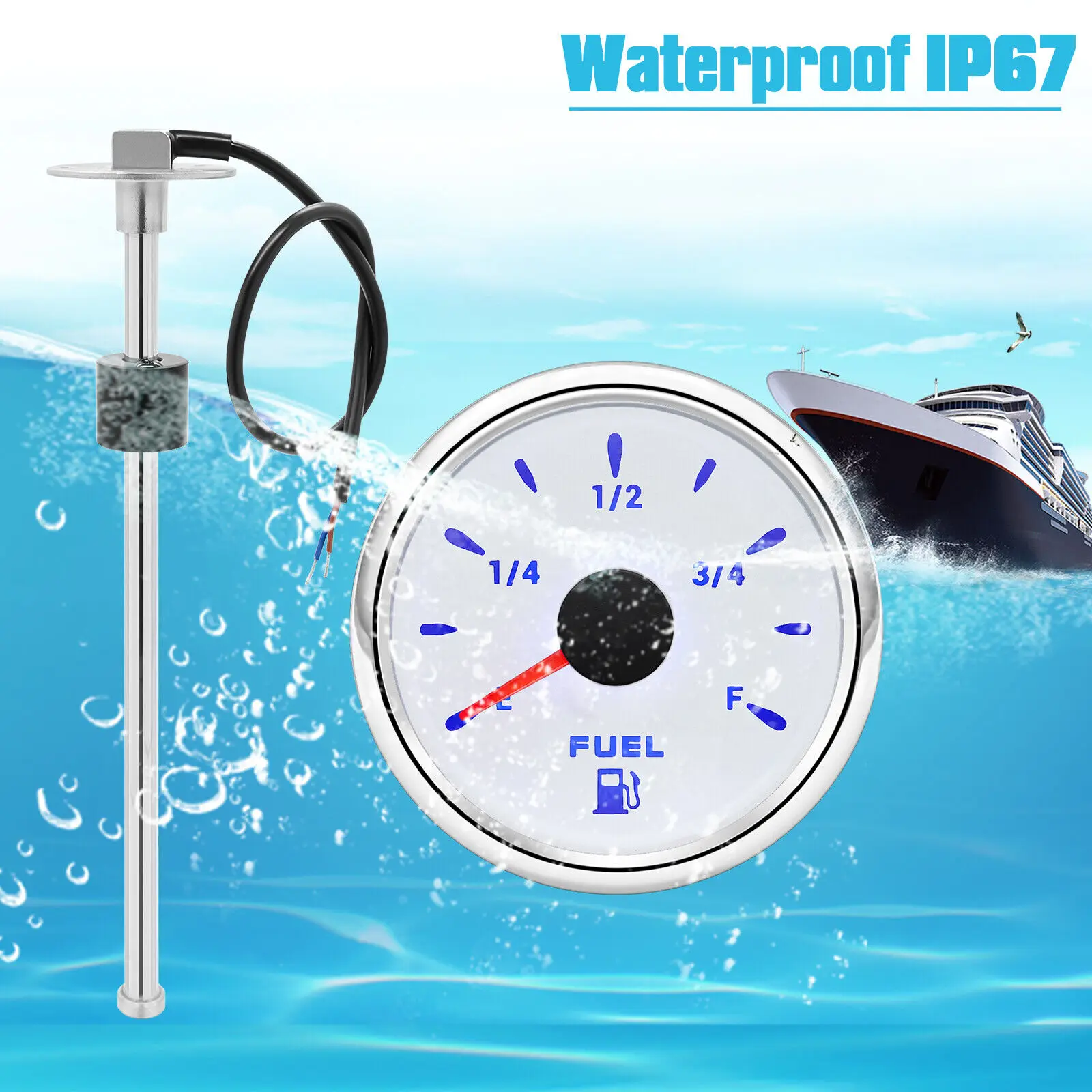 FeaturesThis gauge have 7 backlight color : red??green??blue??yellow??olivine??orange??purple. totally 7kinds different backlight color. it will change automatically every 1 minute.Fantastic waterproof Function: Can work in the water.You can fix only one color you like by pressing the gauge back "set" buttonGauges front cover use stainless steel 316L for long-term use even in acid-base and humid environmentIP67 waterproof and dustproof gradeStepper motors used for full range of stepping gauges.great feature with its less power consumption.longer life.higher precision etc.With curved glass (with anti-fog function)With ultra-wide working voltage design (long-term operating voltage:9-32v.maximum up to:36v)There is a snap together with the harness connector.for best and firmly connected.in order that the gauges could work even in strongviberation.products can be used for the engines/generating units.ships.construction machinery.agricultural machinery.automotive modification etc. Specifications:Material:stainless steel 316L+anti-fog glassInstall diameter:Φ52mm or 2-1/16"Indication range:E-FBacklight color:red.yellow.orange.green.blue.purple.yellow green. You can choose what you need color that press the gauge back buttonWorking voltage:9-32VDCInput signal:240-33ohmWorking current:≤60mAOperating temperature:-30??~+75??Storage temperature:-40??~+85??Grade of protection:IP67 Sensor Specification:Please attention we have 20 models Level Sensor Length Range for choice:100mm.125mm.150mm. 200mm.225mm. 250mm. 300mm. 350mm….Material: 316 Stainless SteelProtection Rank: IP67Resistance output signal:  240-33ohmsOperational Temperature: -40°F ~ +185°F (-40?? ~ +85??)Screw size: M5*16Level Sensor Support Water Level Gauge and Fuel Level Gauge INSTRUCTIONSBlue – GroundBrown- connect to instrument signal lineThe sensor can not be connected to the power supply. can not be connected to the positive electrode. does not need to be connected to the powersupply. it is connected with the gauge signal directlyEmpty oil level 240 ohmFull oil level 33ohm Package included1 x Fuel level gauge1 x Wiring harness1 x Instruction manual