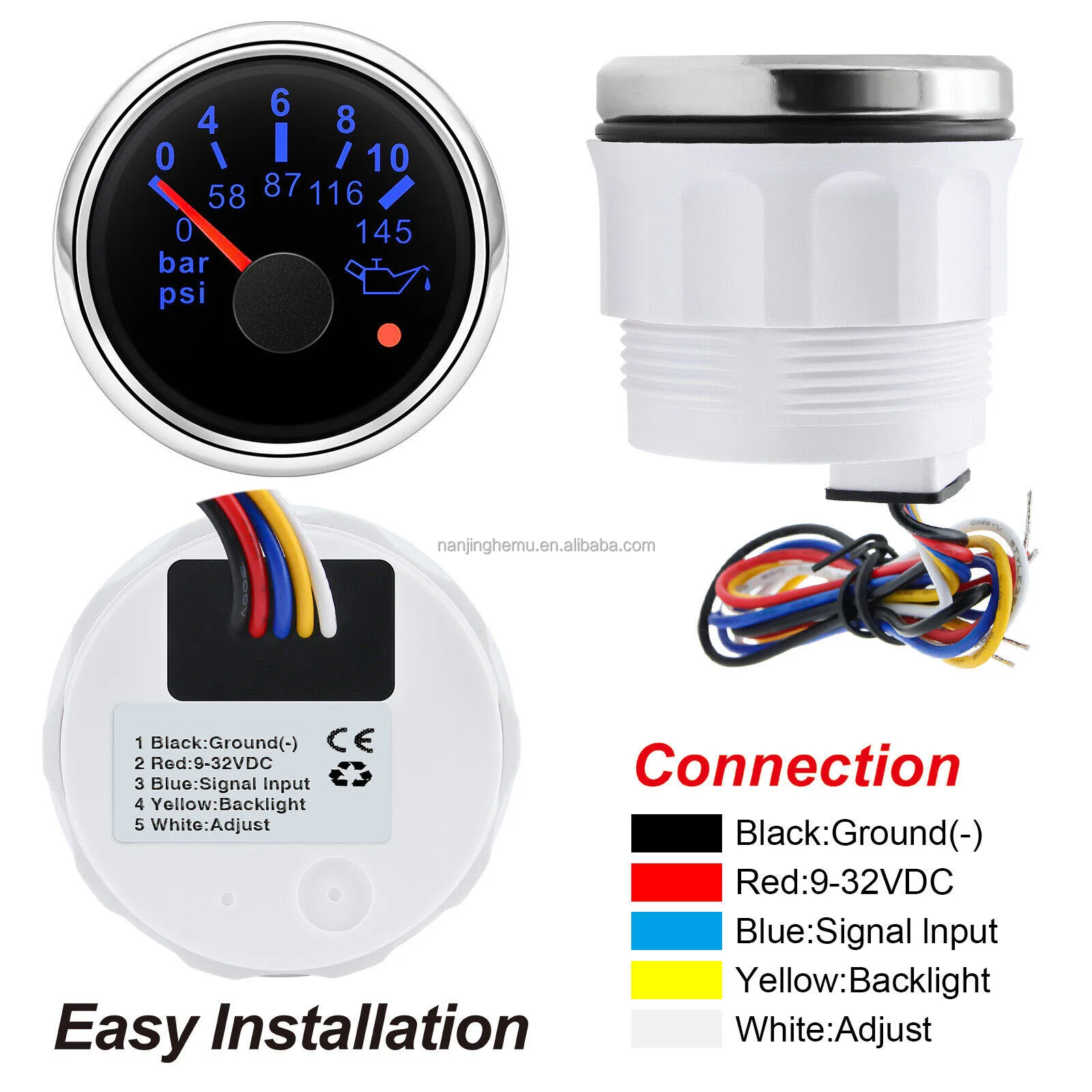 Feature:IP67 waterproof and dustproof grade.With curved glass (with anti-fogging function).With ultra-wide working voltage design.PC material dial.The meter comes with an alarm signal anddoes not require an additional alarm signal from the sensor.Using a high-precision stepper motor. the pointer acceleration and deceleration curve motion can extend the life of the motor.High-brightness LEDs are used for backlighting. which has high brightness and long life.Specification:Color: BlackMaterial: PC polycarbonateSize: 8x8x7cm/3.1×3.1×2.75 inchWorking Temperature: -40~85??Protection Level: IP67Working Voltage: 9~32 VOutput Signal:10~185 ohmsWorking Current:<100mADisplay Accuracy:<3°Indicating Range:0~5 Bar(0-73psi)Mounting hole:52mm (2")Backlight:7 Colors LED Sensor SpeceficaitionOperating Voltage:6~24VConducting Power: < 5WOperating Temperature: -25 ~120°C(120°C MAX 1H)Please attention we have 2 model Oil Pressure Gauge Sensor Measuring Range: 0~10Bar2 Model Thread fitting: NPT-1/8Alarm: 0.8BarStandard Resistance Value: 10~184 ohmsProtection Rank: IP66Sensor wiring: G-termination is conected to signal . WK termination is connnected to alarmConnection1: Black: Ground(-)2: Red: 9-32VDC(+)3: Blue: Sensor Signal4: Yellow: Backlight(+)Package Included:1 x 52mm Oil pressure gauge1 x 1/8NPT Oil pressure sensor1 x Wiring harness1 x Instruction manual