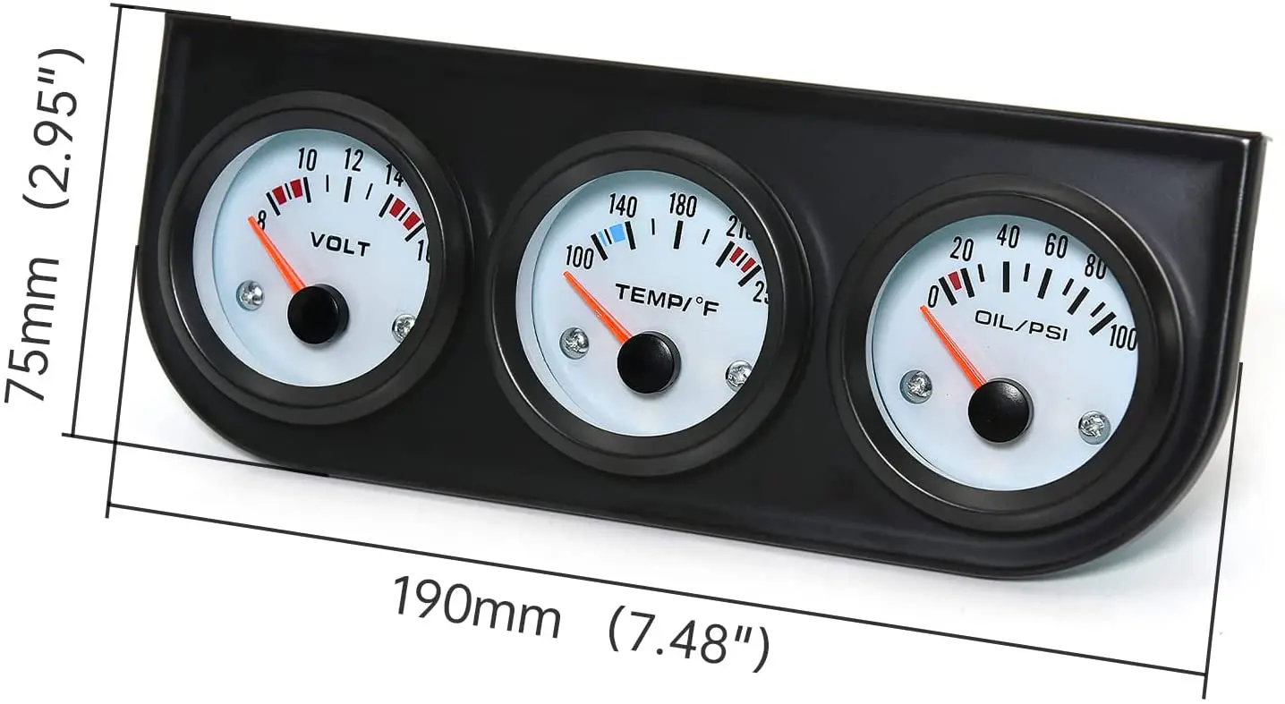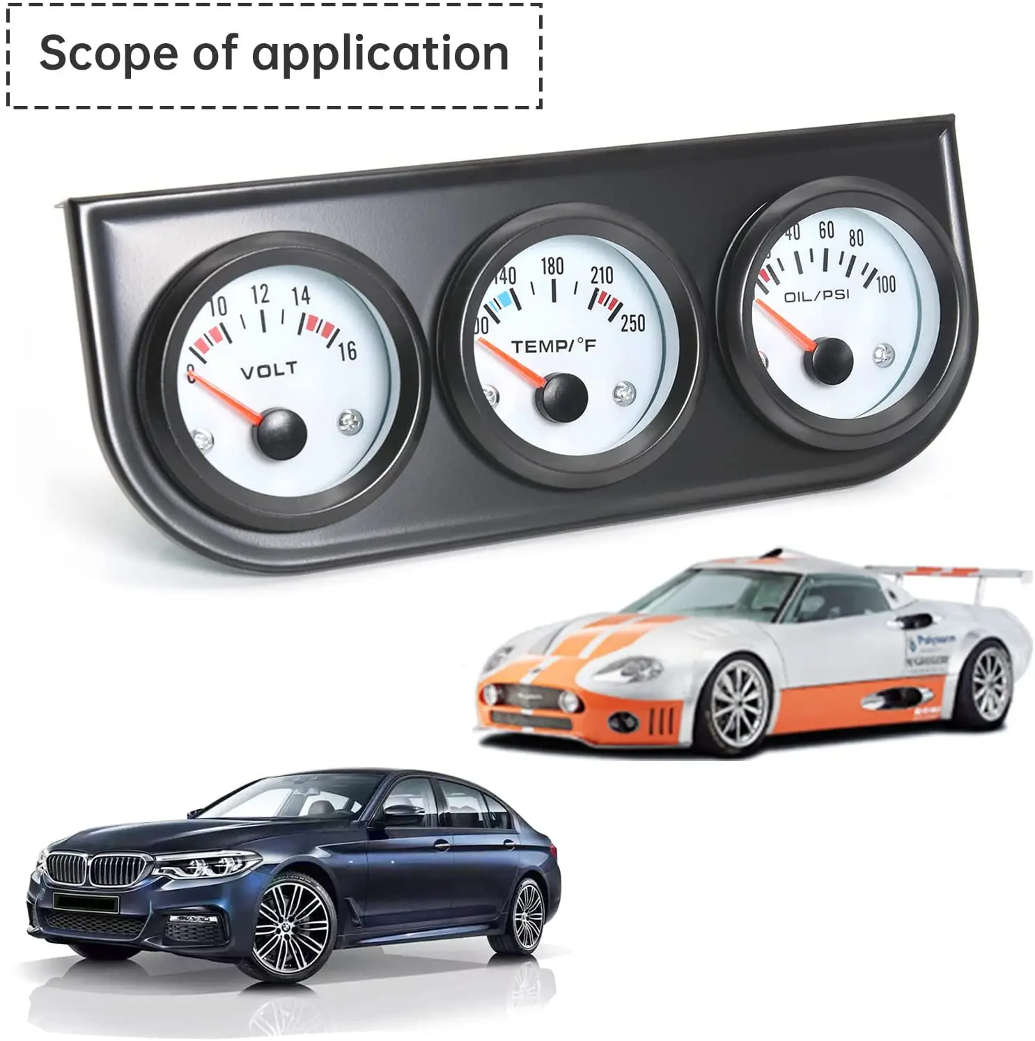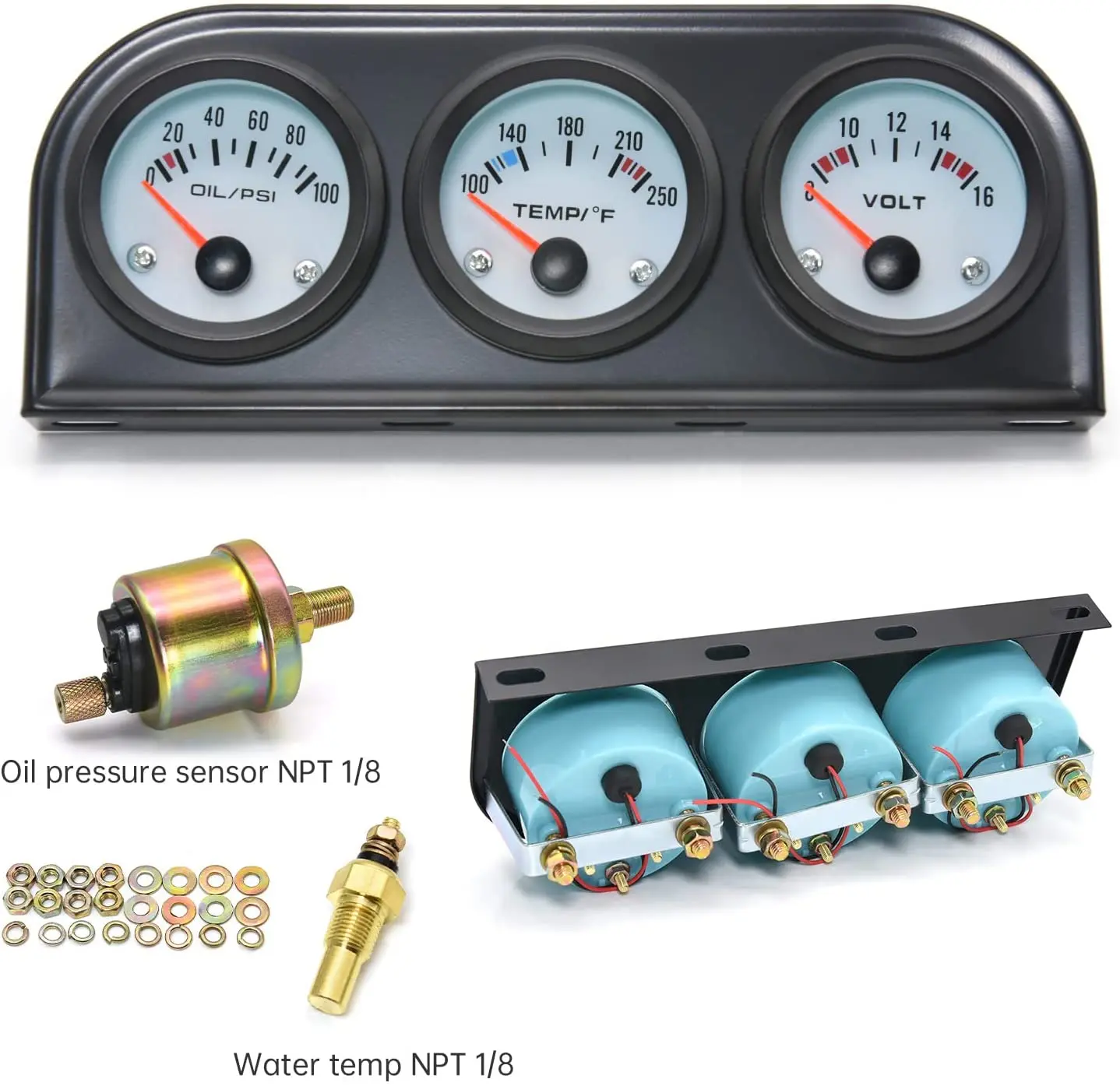 ??Multi-function kit??The 3-in-1 kit from left to right are voltmeter. oil pressure gauge. water temperature gauge. it constantly monitors the value changes of oil and water temperature to ensure driving safety.??Material??The black dial shell is made of ABS and metal material. durable and strong. Numbers and pointer clearly show; The dial has an illuminating devicel for easy reading in the darkness.??Wide Applicability??Applicable to most 12V cars. High sensitivity and easy operation. It can be used in place of. or in addition to. presently operating indicator lights. Gauge insures greater accuracy and provide a wider margin of safety than indicator lights.??Package Included??1 x Volt Meter+Water Temp+Oil Pressure Meter Gauge .1 x three hole gauge bracket .1 x sensor. 1 x 1/8" NPT sensor thread. 1 x installation instructions.Easy installation. suitable for professional use.??After-Sale Guarantee??Please contact us if you are dissatisfied with our products. the response will be taken in 24 hours and provide proper solutions.Note: Products with electrical plugs are designed for use in the US. Outlets and voltage differ internationally and this product may require an adapter or converter for use in your destination. Please check compatibility before purchasing.