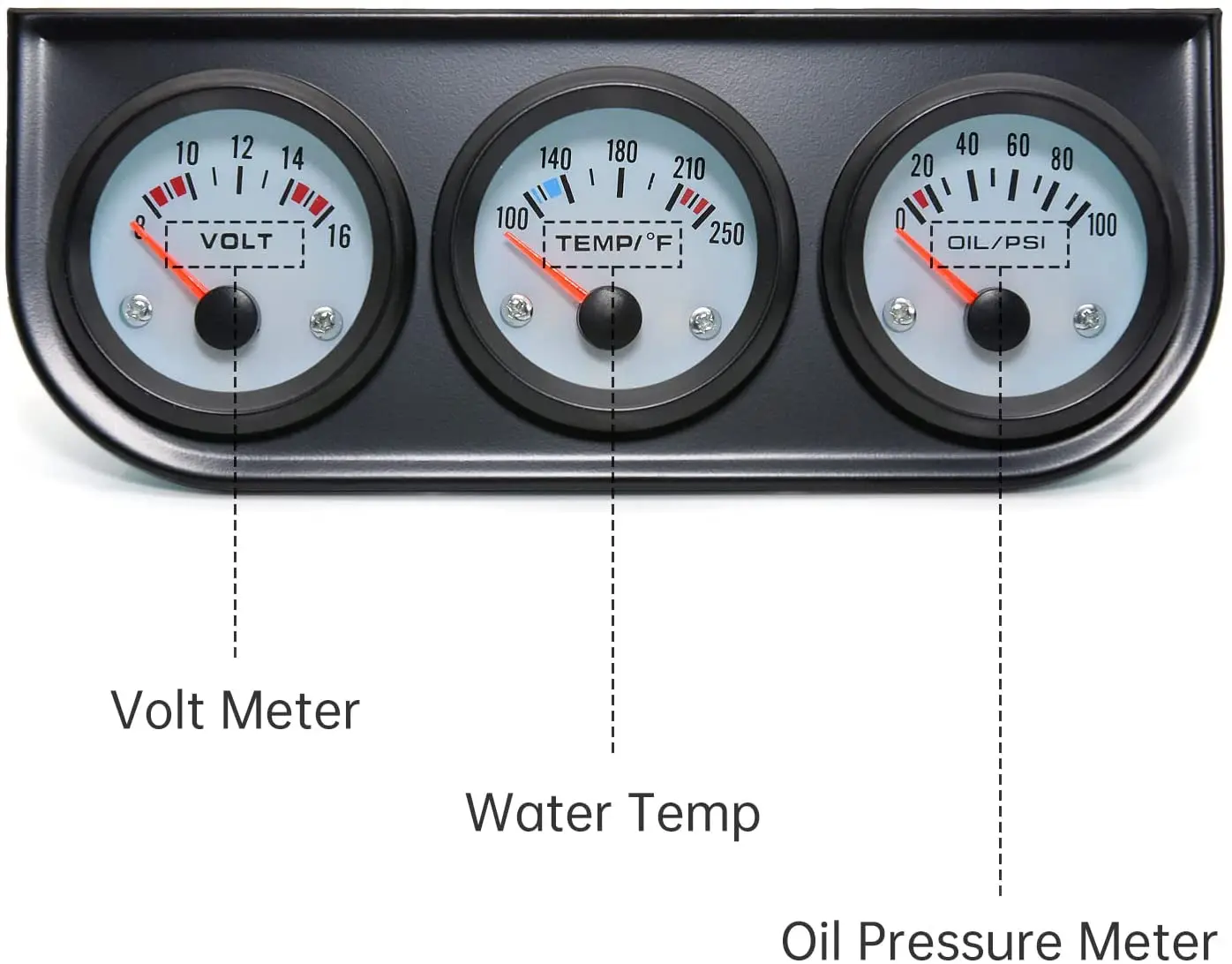 The 3-in-1 kit from left to right are voltmeter. oil pressure gauge. water temperature gauge. it constantly monitors the value