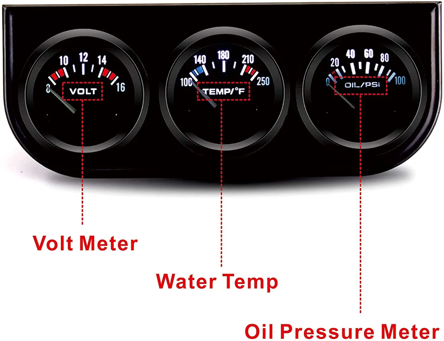 The 3-in-1 kit from left to right are voltmeter. oil pressure gauge. water temperature gauge. it constantly monitors the value
