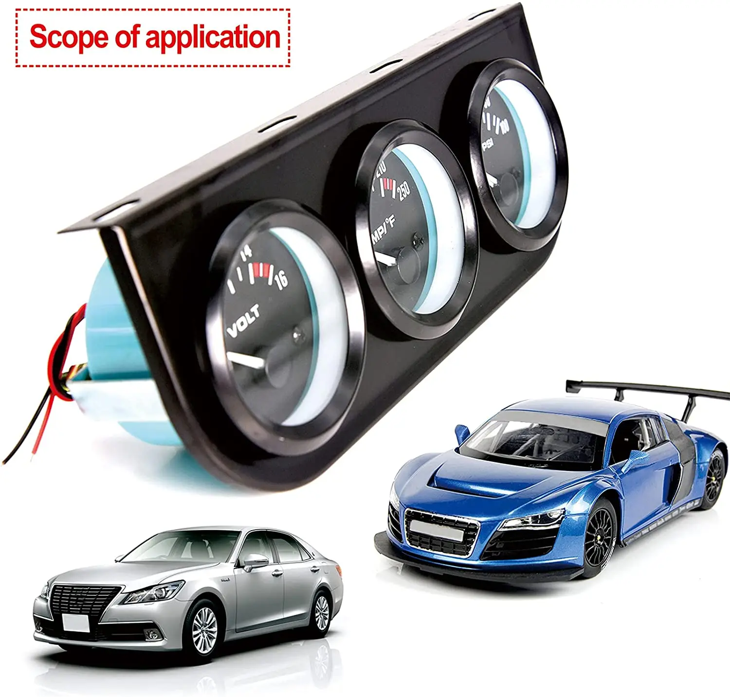 ??Multi-function kit??The 3-in-1 kit from left to right are voltmeter. oil pressure gauge. water temperature gauge. it constantly monitors the value changes of oil and water temperature to ensure driving safety.??Material??The black dial shell is made of ABS and metal material. durable and strong. Numbers and pointer clearly show; The dial has an illuminating devicel for easy reading in the darkness.??Wide Applicability??Applicable to most 12V cars. High sensitivity and easy operation. It can be used in place of. or in addition to. presently operating indicator lights. Gauge insures greater accuracy and provide a wider margin of safety than indicator lights.??Package Included??1 x Volt Meter+Water Temp+Oil Pressure Meter Gauge .1 x three hole gauge bracket .1 x sensor. 1 x 1/8" NPT sensor thread. 1 x installation instructions.Easy installation. suitable for professional use.??After-Sale Guarantee??Please contact us if you are dissatisfied with our products. the response will be taken in 24 hours and provide proper solutions.Note: Products with electrical plugs are designed for use in the US. Outlets and voltage differ internationally and this product may require an adapter or converter for use in your destination. Please check compatibility before purchasing.