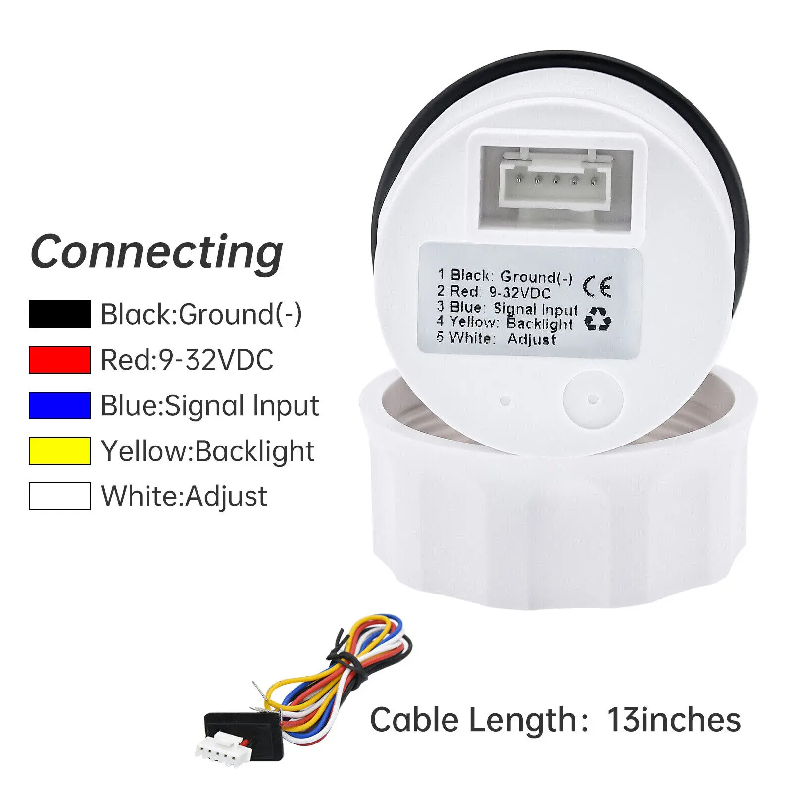 Feature:Be suitable for all kinds of water temperature sensors . and display the temperature of the water tankUse moving-magnet principle to drive the needle. featuring good endurance and anti-vibration.Stepper motors used for full range of stepping gauges. great feature with its less power consumption. longer life. higher precision. etc.With curved glass (with anti-fogging function)With ultra-wide working voltage design( long-term operating voltage: 9-32V. Maximum up to: 36V (<1 min)) Specifications:Working current: ≤60mAWorking voltage: 9~32 VInstall diameter: Φ52mmIndication range: 0~120??Input signal: 287.4~22.4 ohmStorage temperature: -40??~+85??Operating temperature: -30??~+75??Waterproof: front cover IP67.back cover IP5Backlight: 7 Colors .red.yellow.orange.green.blue.purple.white. you can chose the color that press the gauge back button Connection:Black: Ground(-)Red: 9-32VDCBlue: Signal InputYellow: BacklightWhite: Reserve Package Includes:1 x Wiring Harness1 x Water Temp. Gauge1 x Instruction Manual
