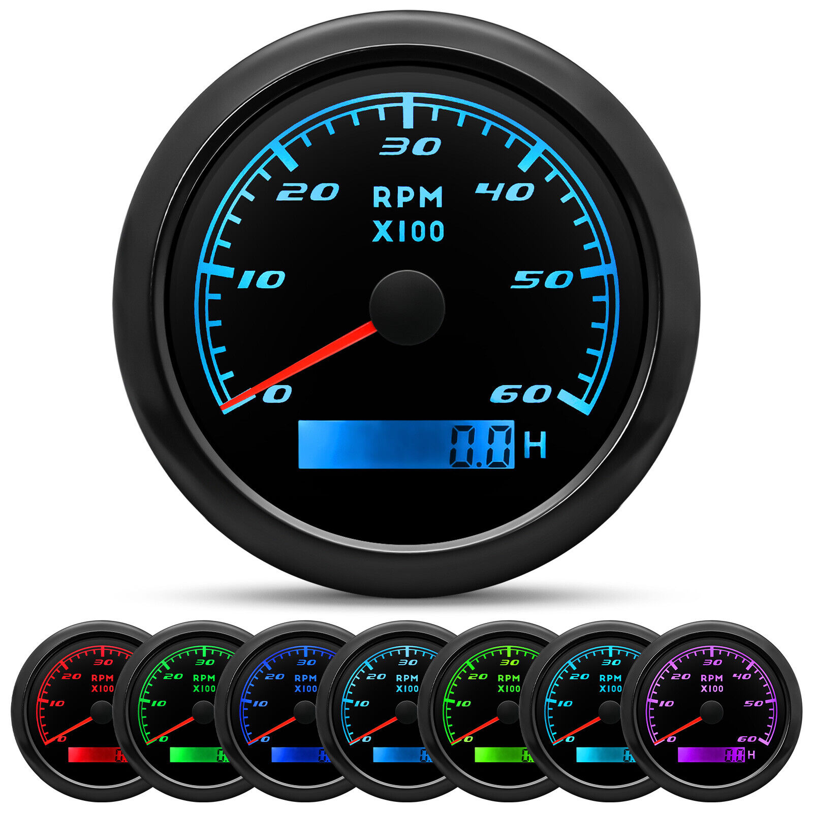 uD83DuDE976 Gauge Kit- Includes GPS Speedometer. Tachometer. Fuel Gauge. Water Temperature. Volt and Oil Pressure Gauge. 7 color backlight : red??green??blue??yellow??olivine??orange??purple.uD83DuDE8C[ GPS Speedometer Gauge Set ]: GPS Speedometer gauge indicating Range: 0 – 80 MPH. Tachometer indicating Range: 0 – 8000 RPM. Volt gauge indicating Range: 8 – 16V. Fuel Level gauge indicating Range: E – F & Resistance 240-33 ohms. Water Temperature gauge indicating Range: 30 – 250°F (0 – 120°C). Oil Pressure gauge indicating Range: 0 – 150 PSI (0 -10 BAR).uD83DuDE99 GPS Speedometer and Tachometer: Standard 85mm (3 3/8") hole in the panel (II) and allow a clearance of 55mm (2 3/16") behind the panel to fit the gauge. The Fuel Gauge. Water Temperature. Volt and Oil Pressure Gauge diameter is 2-1/16 inch (52mm).uD83EuDDED??Material??The boat gauge are made of 316L Metal. Rubber and Plastic. Scratch resistant curved glass lenses. IP67 waterproof and dustproof grade.?????[Attention]: Package just gauges & Installation Instructions . Please contact us if you are dissatisfied with our products. the response will be taken in 24 hours and provide proper solutions.