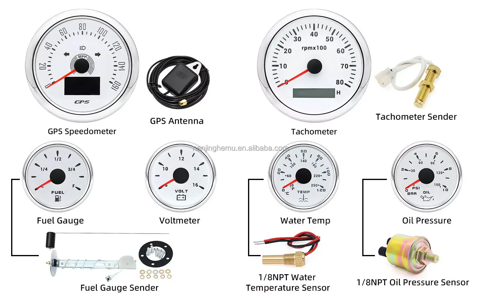 Features:GPS Speedometer: 160MPHTotal mileage: (can't be adjusted )TRIP: Short mileage(can be adjusted )1. Save when power off2. Long press the button to resetCOG: Course Over GroundBacklight: 7 Colors backlightOLED LCD screen: working temperature -40??~+80??Tachometer High PrecisionSize:85mmSignal : PulseWorking voltage: 9-32VDCWorking current: ??120mABacklight :7 Color backlightEngine hours: 0.0-99999.9HWorking temperature: -30-70??Storage temperature: -40-85??Indicating Range:0-8000RPMWaterproof and dustproof grade IP67.Functions: current tacho/RPM and hour Operation mode: LCD display. stepper motorTachometer fit for Car /Truck/ Boat /Diesel Generator Engine /Gasoline EngineVolt GaugeSizes:52 mm (2-1/16")Measuring Range:8-16 (V)Backlight:7 ColorsFuel Level GaugeSizes:52 mm (2-1/16")Measuring Range:Empty – FullResistance:240 (E) – 33 (F) ohmsBacklight: 7 ColorsWater Temperature GaugeInstall diameter: Φ52mmIndication range: 0~120??/30-250?HInput signal: 287.4~22.4 ohmStorage temperature: -40~+85Backlight: 7 ColorsOil Pressure GaugeInstall diameter:Φ52mm or 2-1/16"Indication range:0~10bar / 0-150 PSIOperating temperature:-30~+75Storage temperature:-40~+85Backlight: 7 ColorsPackage Includes:1X 85MM Digital GPS Speedometer Gauge1X GPS Antenna1x Tachometer1X Voltmeter1x Fuel level gauge1X Water temp gauge1X Oil pressure gauge 1x Fuel level Sending Units (240-33ohms)1X Oil pressure Sensor (1/8NPT)1X water temp Sensor (M14) 1X Tachometer Sensor(M16*1.5)Installation InstructionNOTES: The Sending units will be included