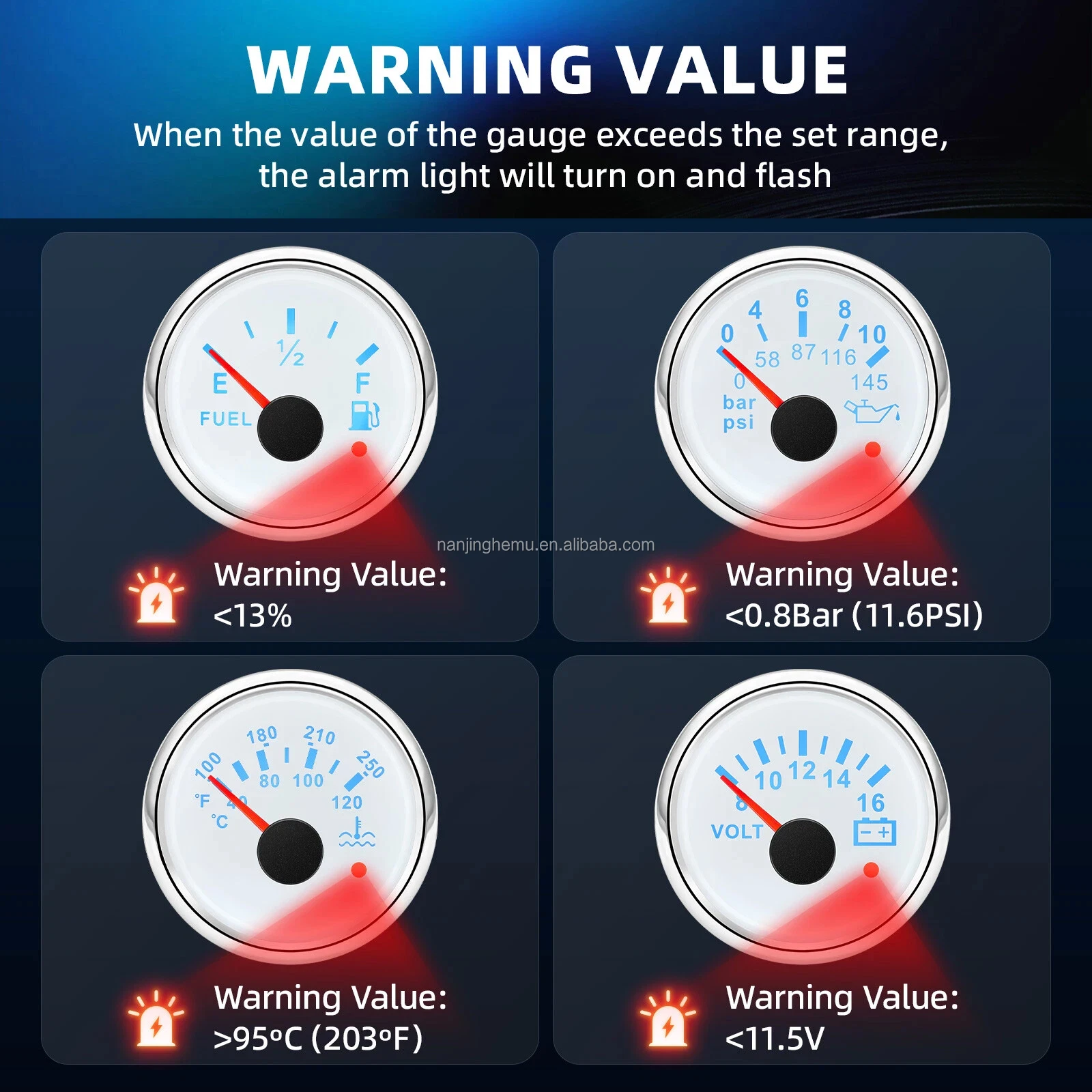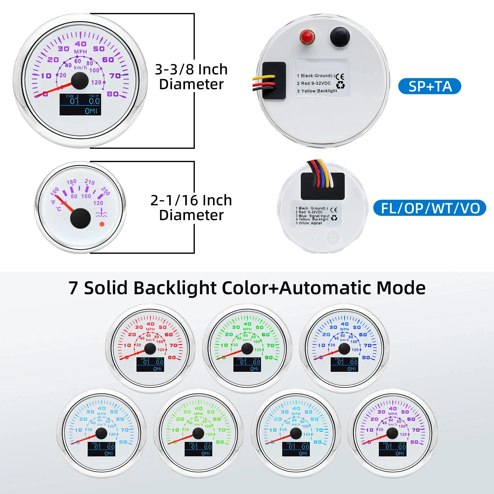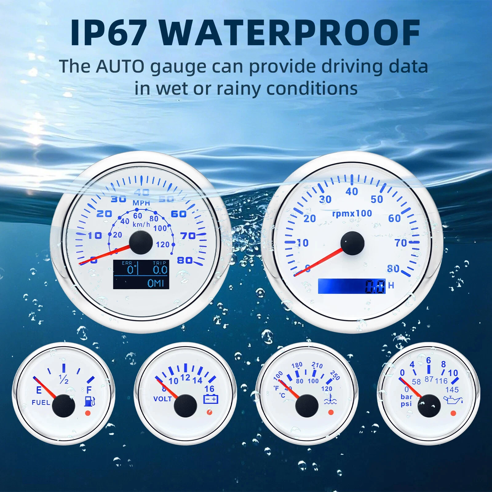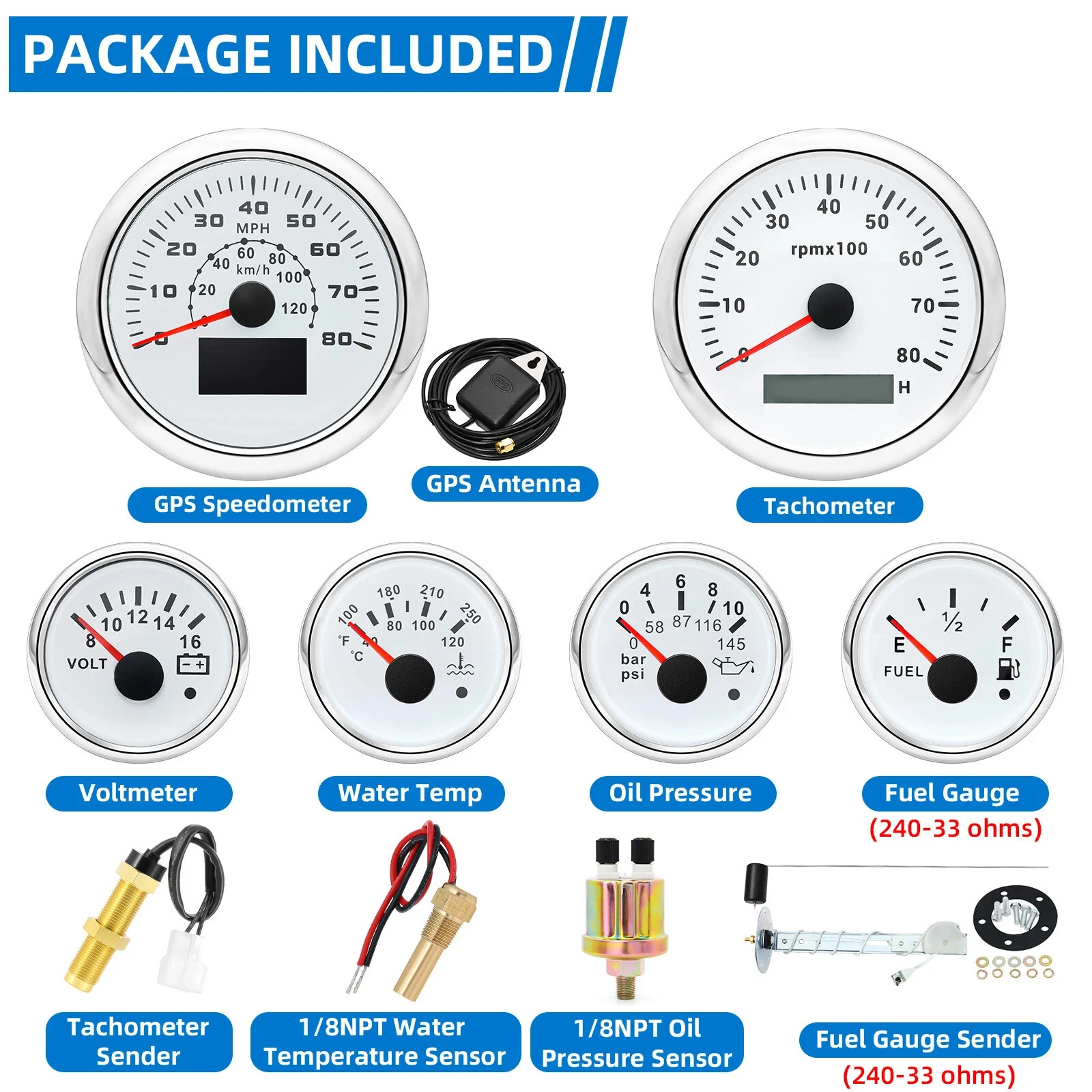 Feature:High-brightness LED backlight.316 stainless steel for long-term use even in acid-base. humid environment.IP67 waterproof and dust-proof grade.With curved glass( with anti-fog function).Suitable for all kinds of vehicle modification.Using stepper motor drive pointer. accurate display of the engine speed. and with the LCD display clear display mileage.Gauges have many kinds backlight color (red.yellow.orange.green.blue.purple.white).customers can adjust any color that you likeGPS Speedometer GaugeInstall Diameter:Φ85mm or 3-3/8"Signal:GPSWorking Voltage:9~32V DCIndication Range:0-80MPH 0-120Km/HBacklight:7 Colors BacklightTachometer Install Diameter:Φ85mm or 3-3/8"Engine hours:0.0-99999.9HBacklight:7 Color backlightIndicating Range:0~8000 RPMSignal:PulseVolt GaugeSizes:52 mm (2-1/16")Measuring Range:8-16 (V)Backlight:7 ColorsFuel Level GaugeSizes:52 mm (2-1/16")Measuring Range:Empty – FullResistance: 240 (E)-33 (F) ohmsBacklight:7 ColorsWater Temperature GaugeInstall diameter: Φ52mmIndication range: 0~120??/100-250?HInput signal: 287.4~22.4 ohmStorage temperature: -40~+85Backlight: 7 ColorsOil Pressure GaugeInstall diameter:Φ52mm or 2-1/16"Indication range:0~10bar/0-145 PSIOperating temperature:-30~+75Storage temperature:-40~+85Backlight: 7 ColorsPackage Includes1X 85MM Digital GPS Speedometer Gauge1X GPS Antenna1X 85MM Tachometer1X 52MM Fuel Level gauge1X 52MM Voltmeter1X 52MM Water temp gauge1X 52MM Oil Pressure gauge 6X Installation InstructionThe sending units will be included