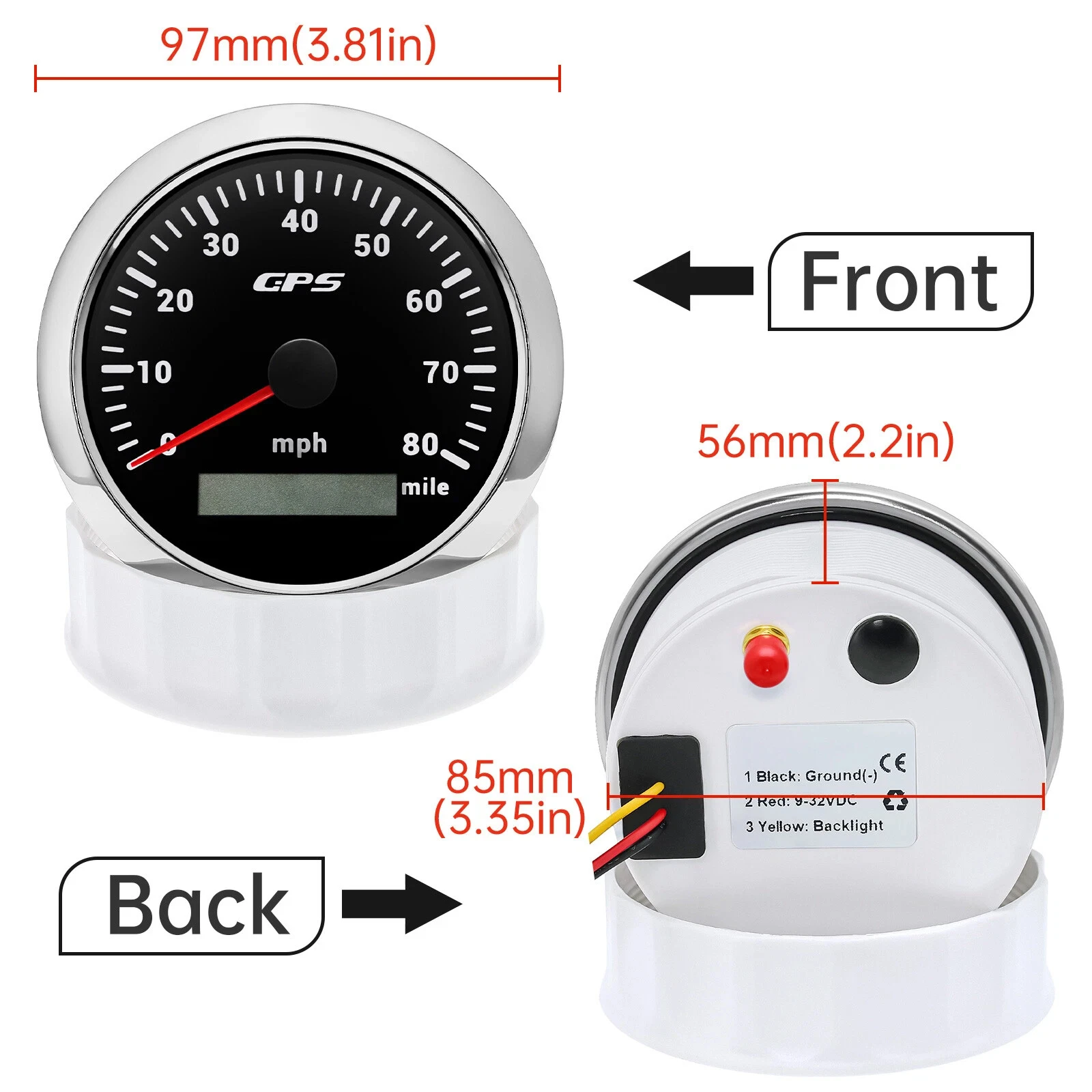 Features:Suitable for all cars.tractors.vans.vessels.boats.yachts.etc.The signal comes directly from the satellite signal receiver (GPS Speed Sensor)The gauge has the advantages of high precision. quick location confirmation and short start up time.IP67 waterproof and dustproof grade.Stepper motors used for full range of stepping gauges. great feature with its less power consumption.longer life.higher precision.etc.With curved glass (with anti-fogging function).With ultra-wide working voltage design( long-term operating voltage:9-32V.Maximum up to: 36V (≤ 1 min)).GPS Speedometer:Fixing dimension:85mm(3-3/8 inches)Indicating Range:0-80MPHItem: Black&SiliverWorking Voltage:9-32VDC(12VDC/24VDC)7 Backlight color:red.green.blue.white.yellow.cyan.purpleTachometer Engine hours:0.0-99999.9HBacklight :7 Color backlightIndicating Range:0~6000 RPMSignal :PulseFor Tachometer.you can substitute for different unit.please contact us before/after purchase or note on the order.Tachometer:0-3000rpm/0-4000RPM/6000RPM/7000RPMVolt GaugeSizes: 52 mm (2-1/16")Measuring Range:8 – 16 (V)Backlight:7 ColorsFuel Level GaugeSizes: 52 mm (2-1/16")Measuring Range:Empty – FullResistance: 0 (E)-190 (F) ohmsBacklight: 7 ColorsWater Temperature GaugeInstall diameter: Φ52mmIndication range: 0~120??/30-250?HInput signal: 287.4~22.4 ohmStorage temperature: -40~+85Backlight: 7 ColorsOil Pressure GaugeInstall diameter:Φ52mm or 2-1/16"Indication range:0~10bar / 0-150 PSIOperating temperature:-30~+75Storage temperature:-40~+85Backlight: 7 ColorsPackage Includes:1X 85MM Digital GPS Speedometer Gauge1X GPS Antenna1X Tachometer1X Voltmeter1X Fuel level gauge1X Water temp gauge1X Oil pressure gauge Installation InstructionNOTES: The Sending units will be included
