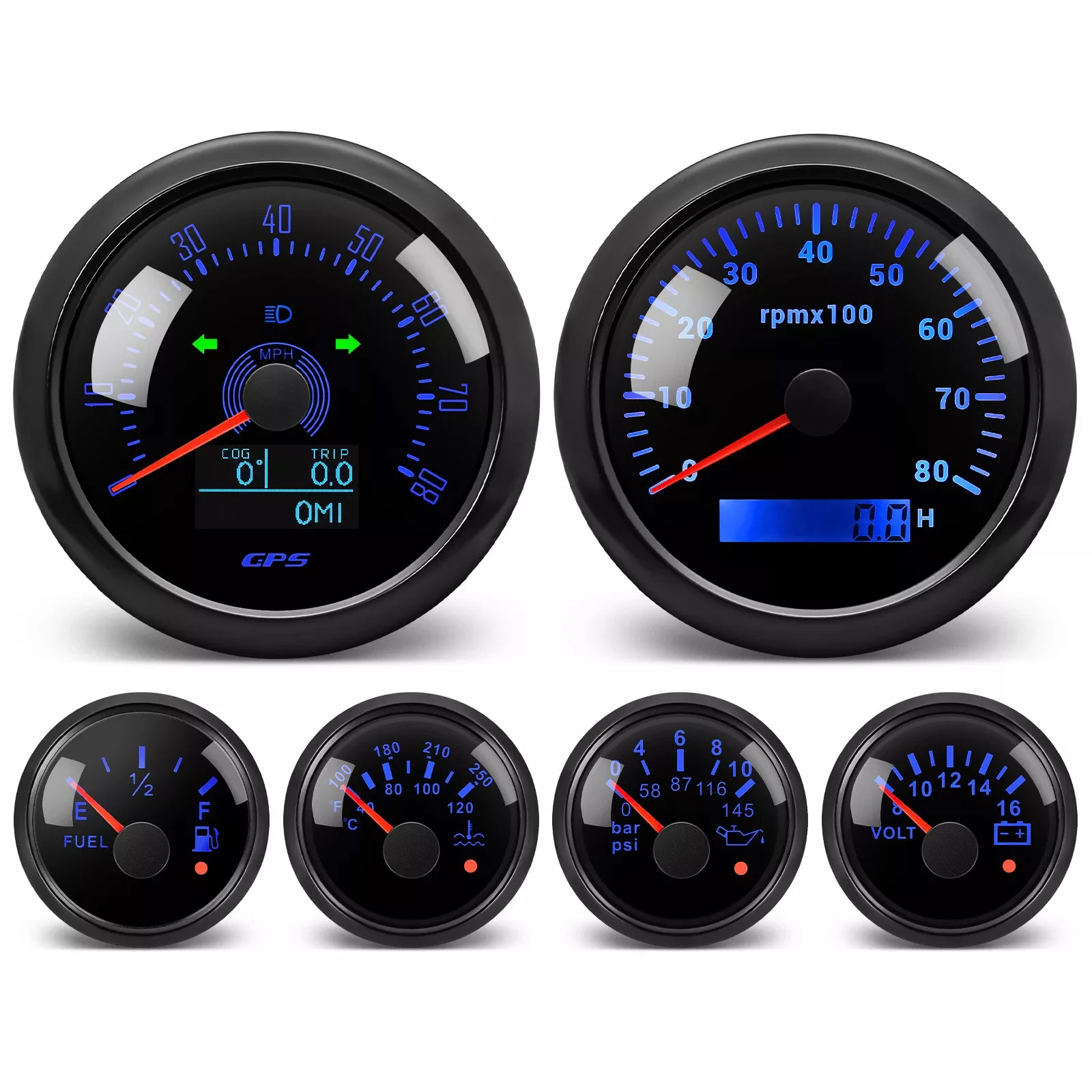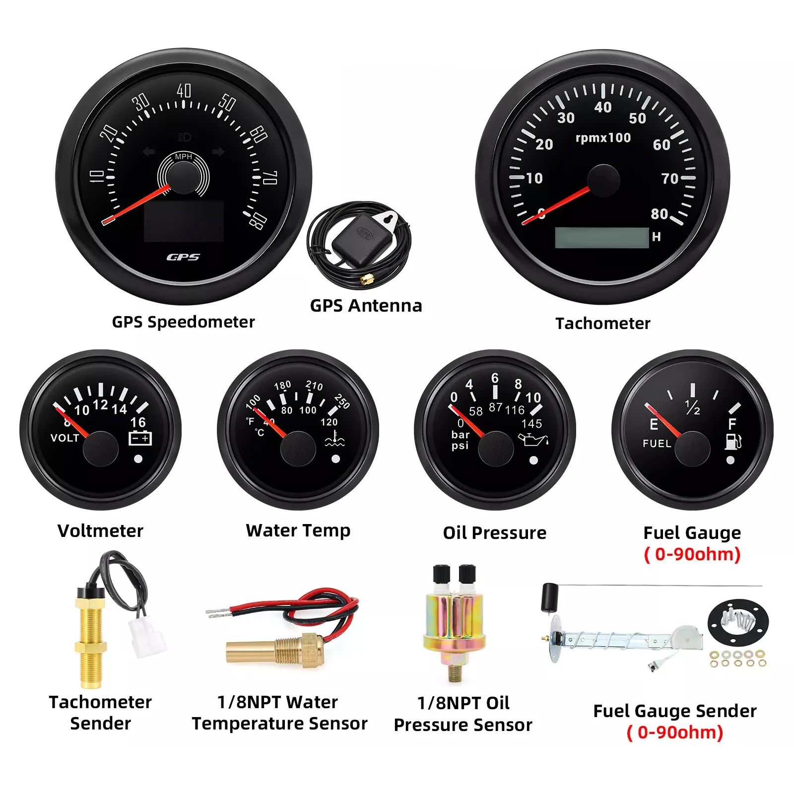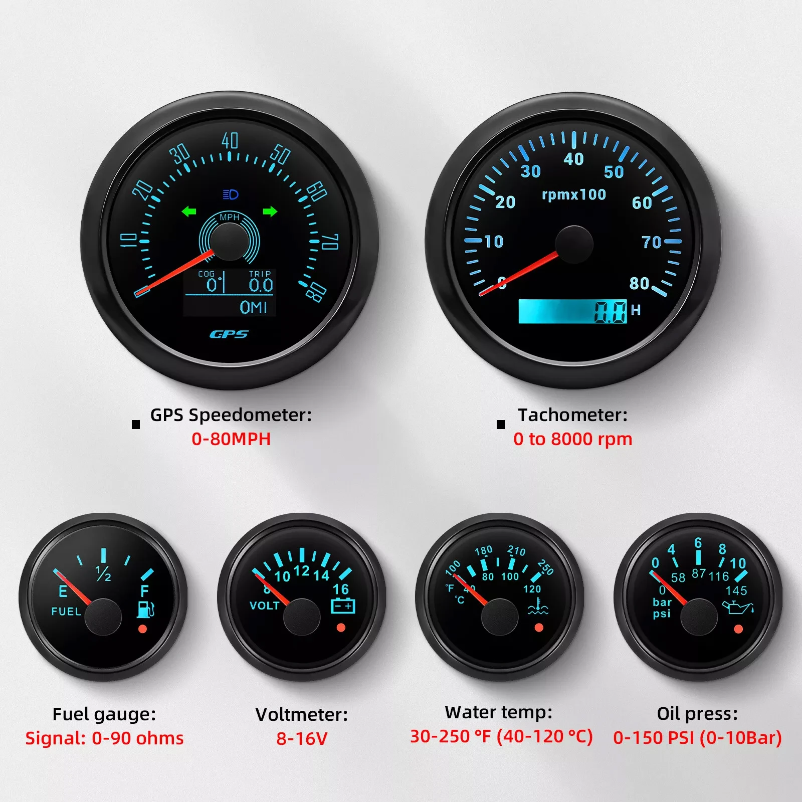 Features:Suitable for all cars.tractors.vans.vessels.boats.yachts.etc.The signal comes directly from the satellite signal receiver (GPS Speed Sensor)The gauge has the advantages of high precision. quick location confirmation and short start up time.IP67 waterproof and dustproof grade.Stepper motors used for full range of stepping gauges. great feature with its less power consumption. longer life. higher precision. etc.With curved glass (with anti-fogging function).With ultra-wide working voltage design( long-term operating voltage: 9-32V.Maximum up to: 36V (≤ 1 min)).Technical Data:Fixing dimension:85mm(3-3/8 inches)Indicating Range:0-80MPHItem: BlackWorking Voltage:9-32VDC(12VDC/24VDC)7 Backlight color:red.green.blue.white.yellow.cyan.purpleTachometer Engine hours: 0.0-99999.9HBacklight:7 Color backlightIndicating Range:0~8000 RPMSignal:PulseFor Tachometer.you can substitute for different unit. please contact us before / after purchase or note on the order.Tachometer:0-3000rpm/0-4000RPM/6000RPM/7000RPMVolt GaugeSizes:52 mm (2-1/16")Measuring Range:8 – 16 (V)Backlight: 7 ColorsFuel Level GaugeSizes:52 mm (2-1/16")Measuring Range:Empty – FullResistance: 0 (E)-90 (F) ohmsBacklight:7 ColorsWater Temperature GaugeInstall diameter: Φ52mmIndication range: 0~120??/100-250?HInput signal: 287.4~22.4 ohmStorage temperature: -40~+85Backlight: 7 ColorsOil Pressure GaugeInstall diameter:Φ52mm or 2-1/16"Indication range:0~10bar/0-145 PSIOperating temperature:-30~+75Storage temperature:-40~+85Backlight: 7 ColorsPackage Includes:1X 85MM Digital GPS Speedometer Gauge1X GPS Antenna1X Tachometer1X Voltmeter1X Fuel level gauge1X Water temp gauge1X Oil pressure gauge 1x Fuel level Sending Units (0-190ohms)1X Oil pressure Sensor (1/8NPT)1X water temp Sensor (1/8NPT) 1X Tachometer Sensor(M16*1.5)Installation InstructionNOTES: The Sending units will be included