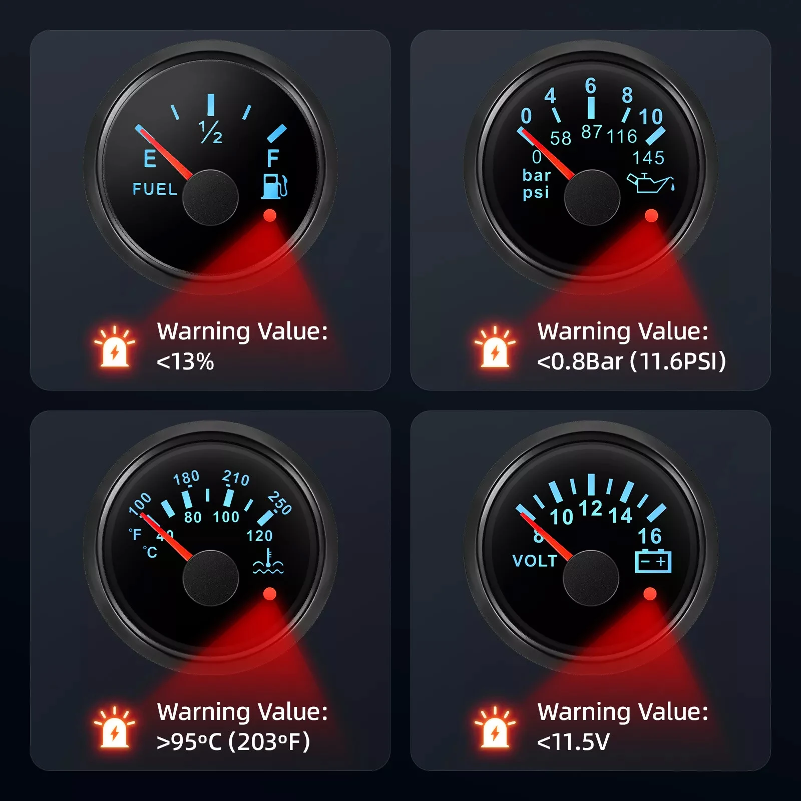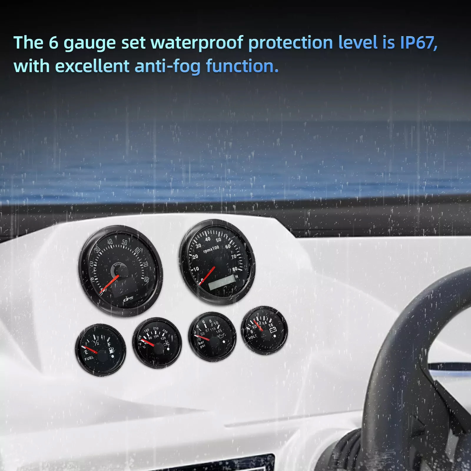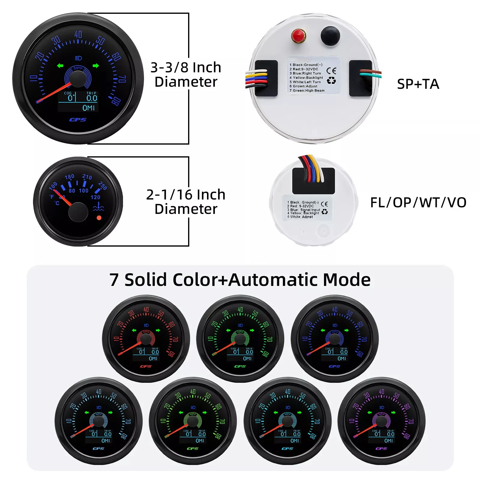 Features:Suitable for all cars.tractors.vans.vessels.boats.yachts.etc.The signal comes directly from the satellite signal receiver (GPS Speed Sensor)The gauge has the advantages of high precision. quick location confirmation and short start up time.IP67 waterproof and dustproof grade.Stepper motors used for full range of stepping gauges. great feature with its less power consumption. longer life. higher precision. etc.With curved glass (with anti-fogging function).With ultra-wide working voltage design( long-term operating voltage: 9-32V.Maximum up to: 36V (≤ 1 min)).Technical Data:Fixing dimension:85mm(3-3/8 inches)Indicating Range:0-80MPHItem: BlackWorking Voltage:9-32VDC(12VDC/24VDC)7 Backlight color:red.green.blue.white.yellow.cyan.purpleTachometer Engine hours: 0.0-99999.9HBacklight:7 Color backlightIndicating Range:0~8000 RPMSignal:PulseFor Tachometer.you can substitute for different unit. please contact us before / after purchase or note on the order.Tachometer:0-3000rpm/0-4000RPM/6000RPM/7000RPMVolt GaugeSizes:52 mm (2-1/16")Measuring Range:8 – 16 (V)Backlight: 7 ColorsFuel Level GaugeSizes:52 mm (2-1/16")Measuring Range:Empty – FullResistance: 0 (E)-90 (F) ohmsBacklight:7 ColorsWater Temperature GaugeInstall diameter: Φ52mmIndication range: 0~120??/100-250?HInput signal: 287.4~22.4 ohmStorage temperature: -40~+85Backlight: 7 ColorsOil Pressure GaugeInstall diameter:Φ52mm or 2-1/16"Indication range:0~10bar/0-145 PSIOperating temperature:-30~+75Storage temperature:-40~+85Backlight: 7 ColorsPackage Includes:1X 85MM Digital GPS Speedometer Gauge1X GPS Antenna1X Tachometer1X Voltmeter1X Fuel level gauge1X Water temp gauge1X Oil pressure gauge 1x Fuel level Sending Units (0-190ohms)1X Oil pressure Sensor (1/8NPT)1X water temp Sensor (1/8NPT) 1X Tachometer Sensor(M16*1.5)Installation InstructionNOTES: The Sending units will be included