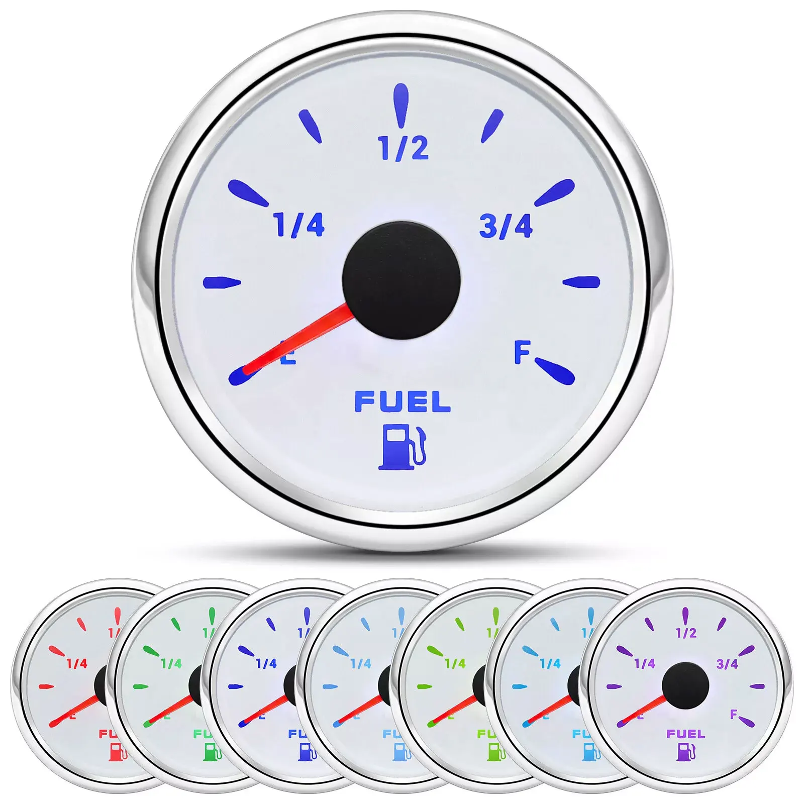 6 Gauge Kit- Includes GPS Speedometer. Tachometer. Fuel Gauge. Water Temperature. Volt and Oil Pressure Gauge. 7 color backlight : red??green??blue??yellow??olivine??orange??purple.[ GPS Speedometer Gauge Set ]: GPS Speedometer gauge indicating Range: 0 – 80 MPH. Tachometer indicating Range: 0 – 8000 RPM. Volt gauge indicating Range: 8 – 16V. Fuel Level gauge indicating Range: E – F & Resistance 240-33 ohms. Water Temperature gauge indicating Range: 30 – 250°F (0 – 120°C). Oil Pressure gauge indicating Range: 0 – 150 PSI (0 -10 BAR). GPS Speedometer and Tachometer: Standard 85mm (3 3/8") hole in the panel (II) and allow a clearance of 55mm (2 3/16") behind the panel to fit the gauge. The Fuel Gauge. Water Temperature. Volt and Oil Pressure Gauge diameter is 2-1/16 inch (52mm).[Material] The boat gauge are made of 316L Metal. Rubber and Plastic. Scratch resistant curved glass lenses. IP67 waterproof and dustproof grade.[Attention]: Package just gauges & Installation Instructions . Please contact us if you are dissatisfied with our products. the response will be taken in 24 hours and provide proper solutions.