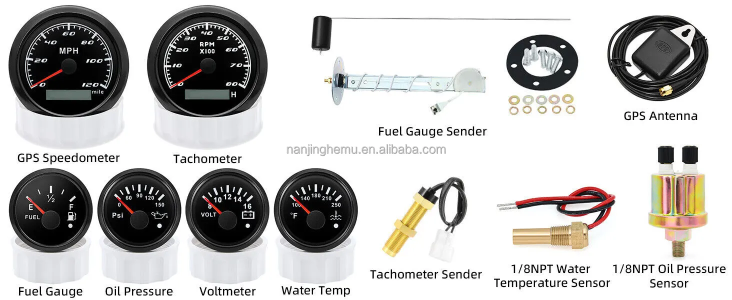 GPS Speedometer:Fixing dimension:85mm(3-3/8 inches)Indicating Range:0-120MPHItem: White&SiliverWorking Voltage:9-32VDC(12VDC/24VDC)7 Backlight color:red.green.blue.white.yellow.cyan.purpleTachometer Engine hours:0.0-99999.9HBacklight:7 Color backlightIndicating Range:0~8000 RPMSignal:PulseFor Tachometer.you can substitute for different unit. please contact us before / after purchase or note on the order.Tachometer: 0-3000rpm/0-4000RPM/6000RPM/7000RPMVolt GaugeSizes:52 mm (2-1/16")Measuring Range:8-16 (V)Backlight: 7 ColorsFuel Level GaugeSizes:52 mm (2-1/16")Measuring Range:Empty – FullResistance: 240 (E)-33 (F) ohmsBacklight:7 ColorsWater Temperature GaugeInstall diameter: Φ52mmIndication range: 0~120??/100-250?HInput signal: 287.4~22.4 ohmStorage temperature: -40~+85Backlight: 7 ColorsOil Pressure GaugeInstall diameter:Φ52mm or 2-1/16"Indication range:0~10bar/0-145 PSIOperating temperature:-30~+75Storage temperature:-40~+85Backlight: 7 ColorsPackage Includes:1X 85MM Digital GPS Speedometer Gauge1X GPS Antenna1X Tachometer1X Voltmeter1X Fuel level gauge1X Water temp gauge1X Oil pressure gauge 1x Fuel level Sending Units (240-33ohms)1X Oil pressure Sensor (1/8NPT)1X water temp Sensor (1/8NPT) 1X Tachometer Sensor(M16*1.5)Installation InstructionNOTES: The Sending units will be included