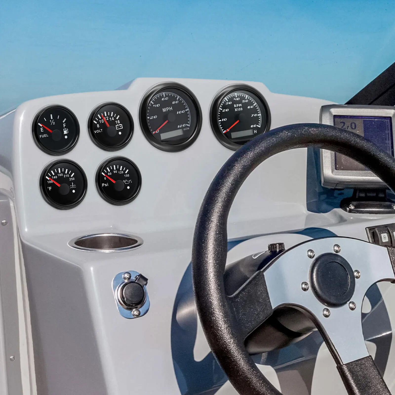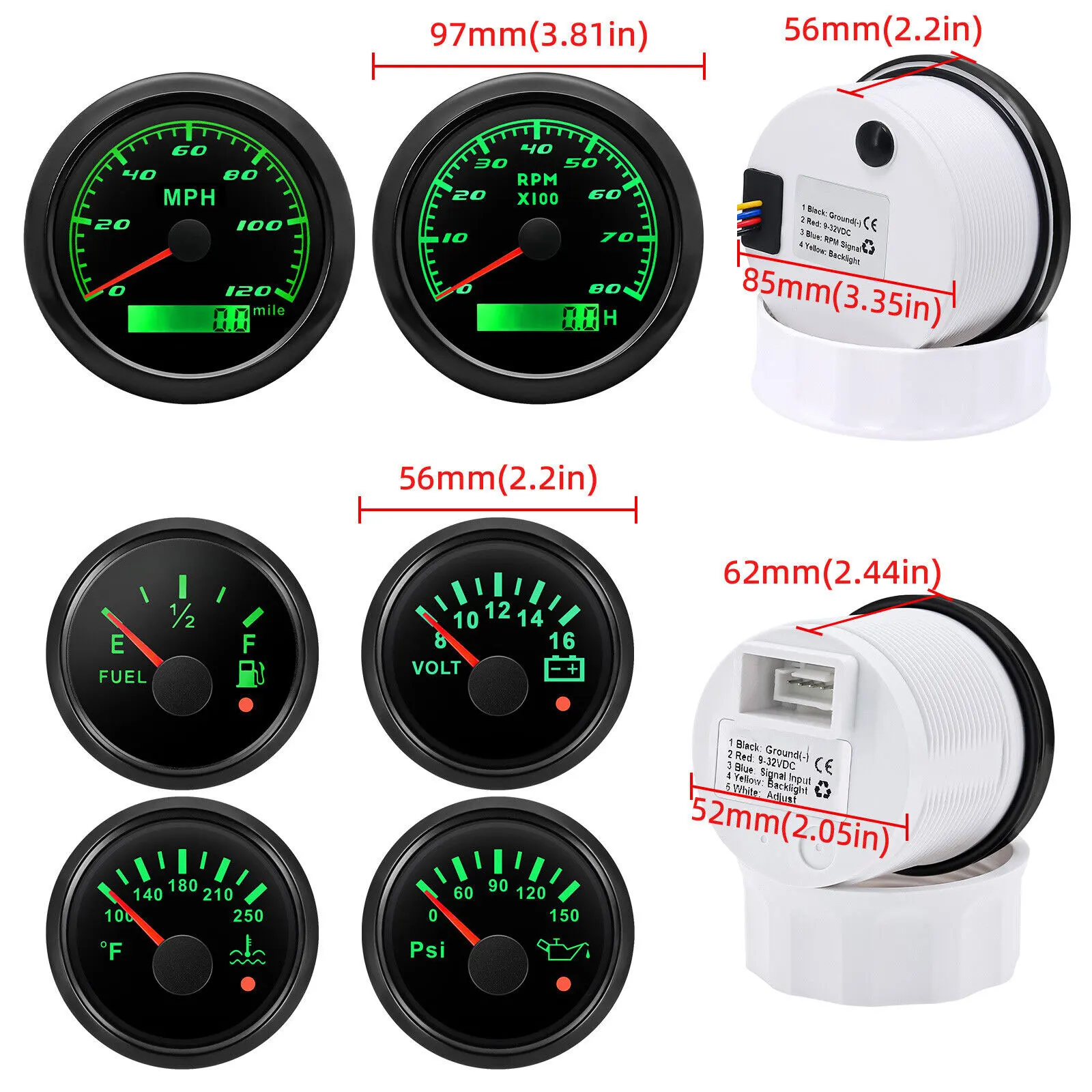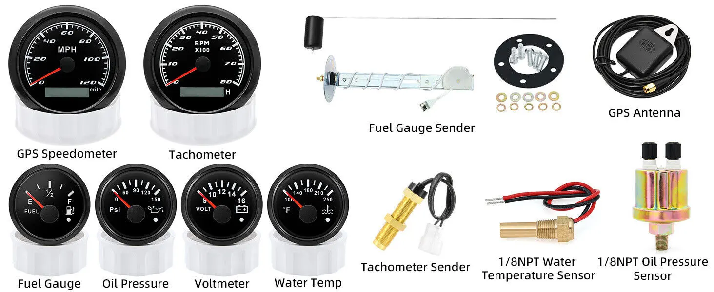 GPS Speedometer:Fixing dimension:85mm(3-3/8 inches)Indicating Range:0-120MPHItem: White&SiliverWorking Voltage:9-32VDC(12VDC/24VDC)7 Backlight color:red.green.blue.white.yellow.cyan.purpleTachometer Engine hours:0.0-99999.9HBacklight:7 Color backlightIndicating Range:0~8000 RPMSignal:PulseFor Tachometer.you can substitute for different unit. please contact us before / after purchase or note on the order.Tachometer: 0-3000rpm/0-4000RPM/6000RPM/7000RPMVolt GaugeSizes:52 mm (2-1/16")Measuring Range:8-16 (V)Backlight: 7 ColorsFuel Level GaugeSizes:52 mm (2-1/16")Measuring Range:Empty – FullResistance: 240 (E)-33 (F) ohmsBacklight:7 ColorsWater Temperature GaugeInstall diameter: Φ52mmIndication range: 0~120??/100-250?HInput signal: 287.4~22.4 ohmStorage temperature: -40~+85Backlight: 7 ColorsOil Pressure GaugeInstall diameter:Φ52mm or 2-1/16"Indication range:0~10bar/0-145 PSIOperating temperature:-30~+75Storage temperature:-40~+85Backlight: 7 ColorsPackage Includes:1X 85MM Digital GPS Speedometer Gauge1X GPS Antenna1X Tachometer1X Voltmeter1X Fuel level gauge1X Water temp gauge1X Oil pressure gauge 1x Fuel level Sending Units (240-33ohms)1X Oil pressure Sensor (1/8NPT)1X water temp Sensor (1/8NPT) 1X Tachometer Sensor(M16*1.5)Installation InstructionNOTES: The Sending units will be included