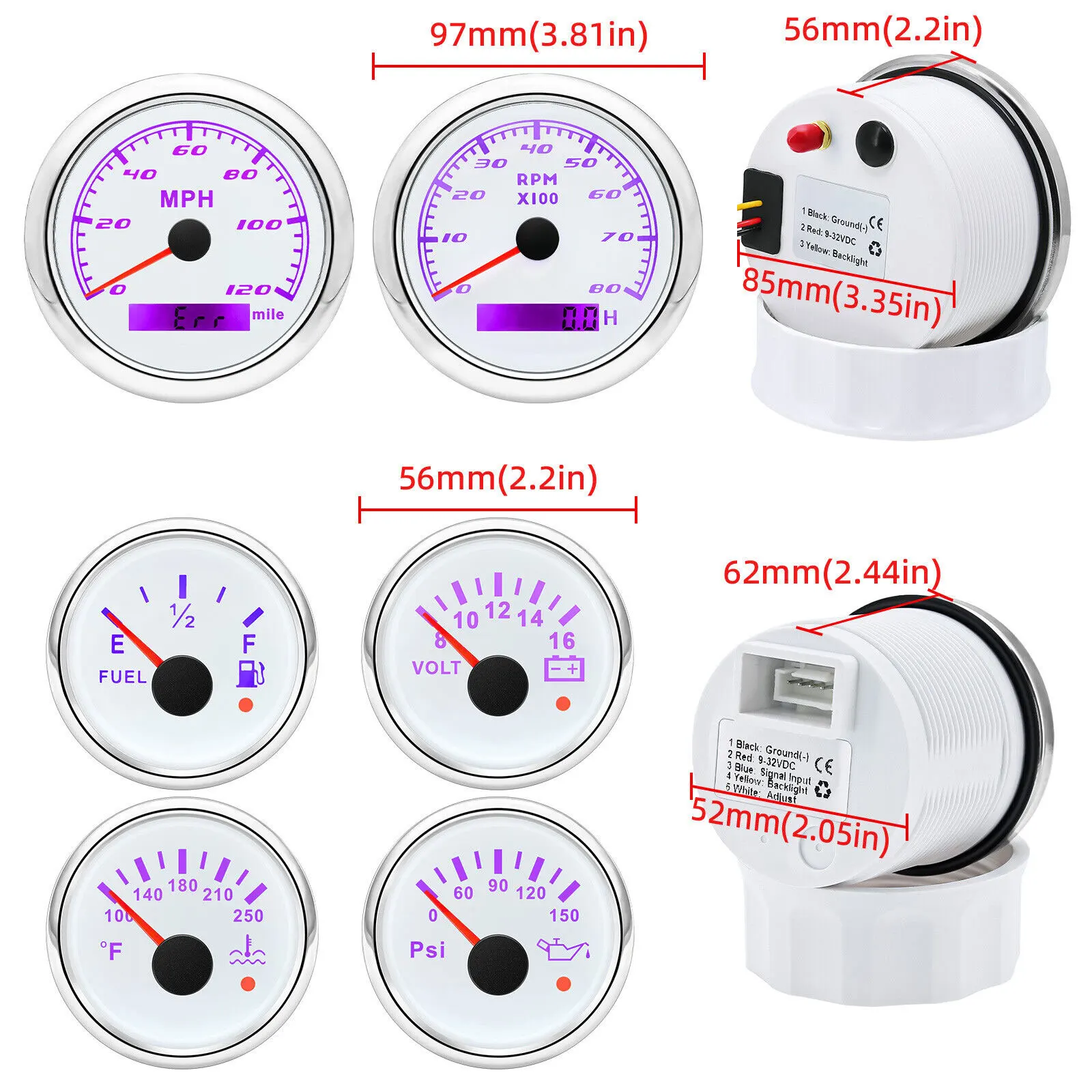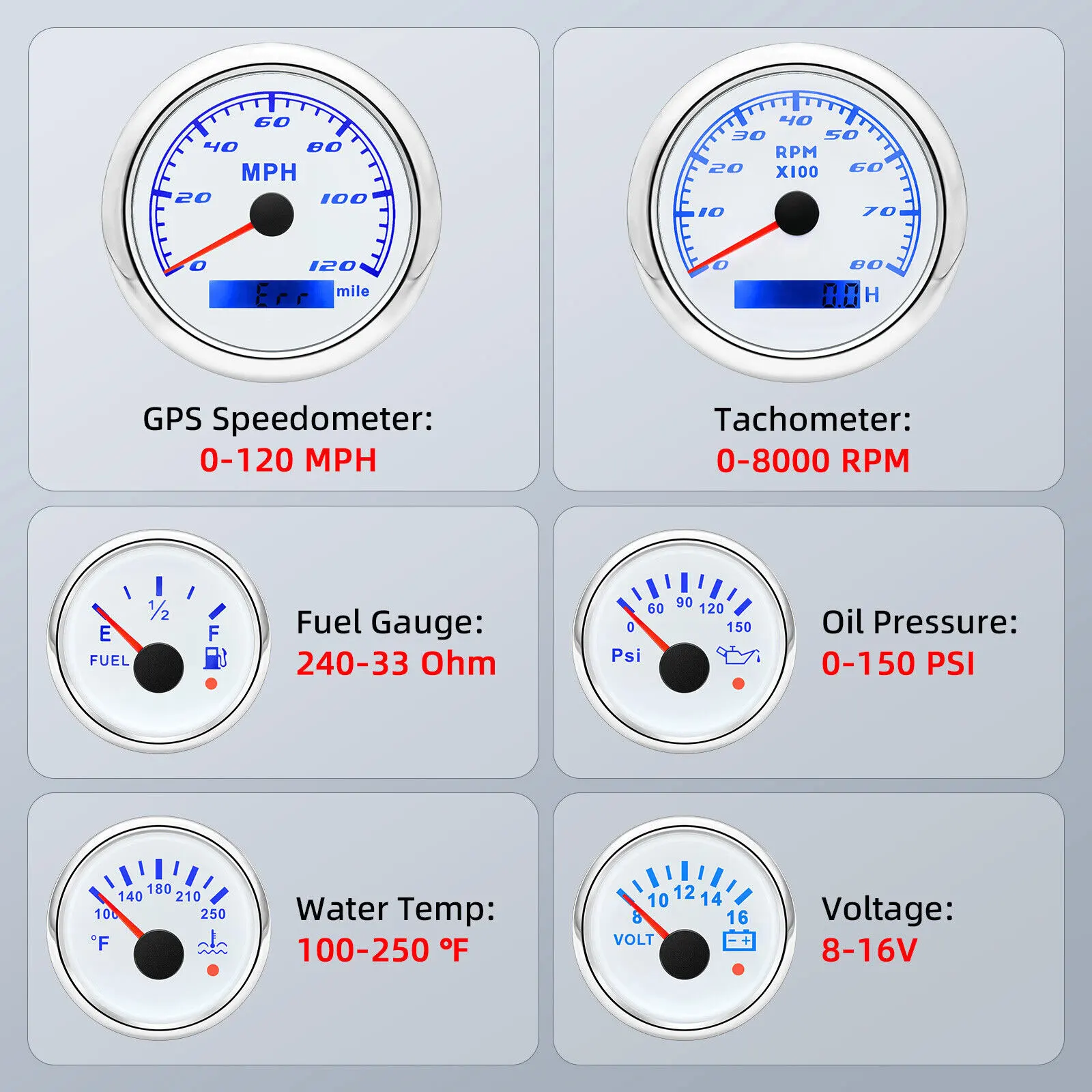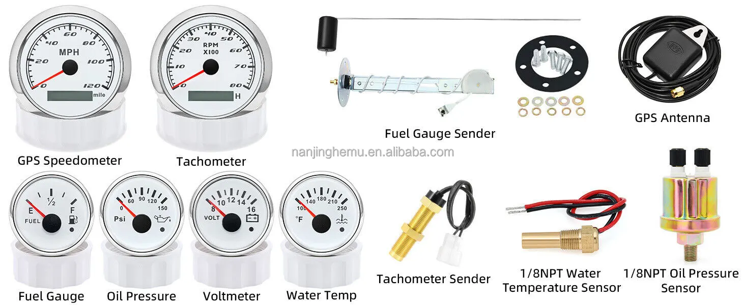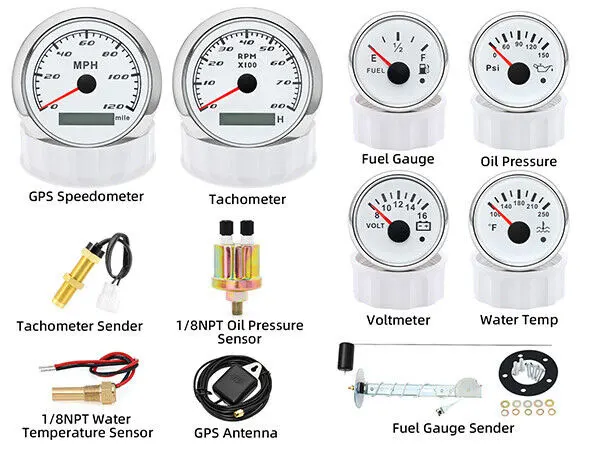 GPS Speedometer:Fixing dimension:85mm(3-3/8 inches)Indicating Range:0-120MPHItem: White&SiliverWorking Voltage:9-32VDC(12VDC/24VDC)7 Backlight color:red.green.blue.white.yellow.cyan.purpleTachometer Engine hours:0.0-99999.9HBacklight:7 Color backlightIndicating Range:0~8000 RPMSignal:PulseFor Tachometer.you can substitute for different unit. please contact us before / after purchase or note on the order.Tachometer: 0-3000rpm/0-4000RPM/6000RPM/7000RPMVolt GaugeSizes:52 mm (2-1/16")Measuring Range:8-16 (V)Backlight: 7 ColorsFuel Level GaugeSizes:52 mm (2-1/16")Measuring Range:Empty – FullResistance: 240 (E)-33 (F) ohmsBacklight:7 ColorsWater Temperature GaugeInstall diameter: Φ52mmIndication range: 0~120??/100-250?HInput signal: 287.4~22.4 ohmStorage temperature: -40~+85Backlight: 7 ColorsOil Pressure GaugeInstall diameter:Φ52mm or 2-1/16"Indication range:0~10bar/0-145 PSIOperating temperature:-30~+75Storage temperature:-40~+85Backlight: 7 ColorsPackage Includes:1X 85MM Digital GPS Speedometer Gauge1X GPS Antenna1X Tachometer1X Voltmeter1X Fuel level gauge1X Water temp gauge1X Oil pressure gauge 1x Fuel level Sending Units (240-33ohms)1X Oil pressure Sensor (1/8NPT)1X water temp Sensor (1/8NPT) 1X Tachometer Sensor(M16*1.5)Installation InstructionNOTES: The Sending units will be included