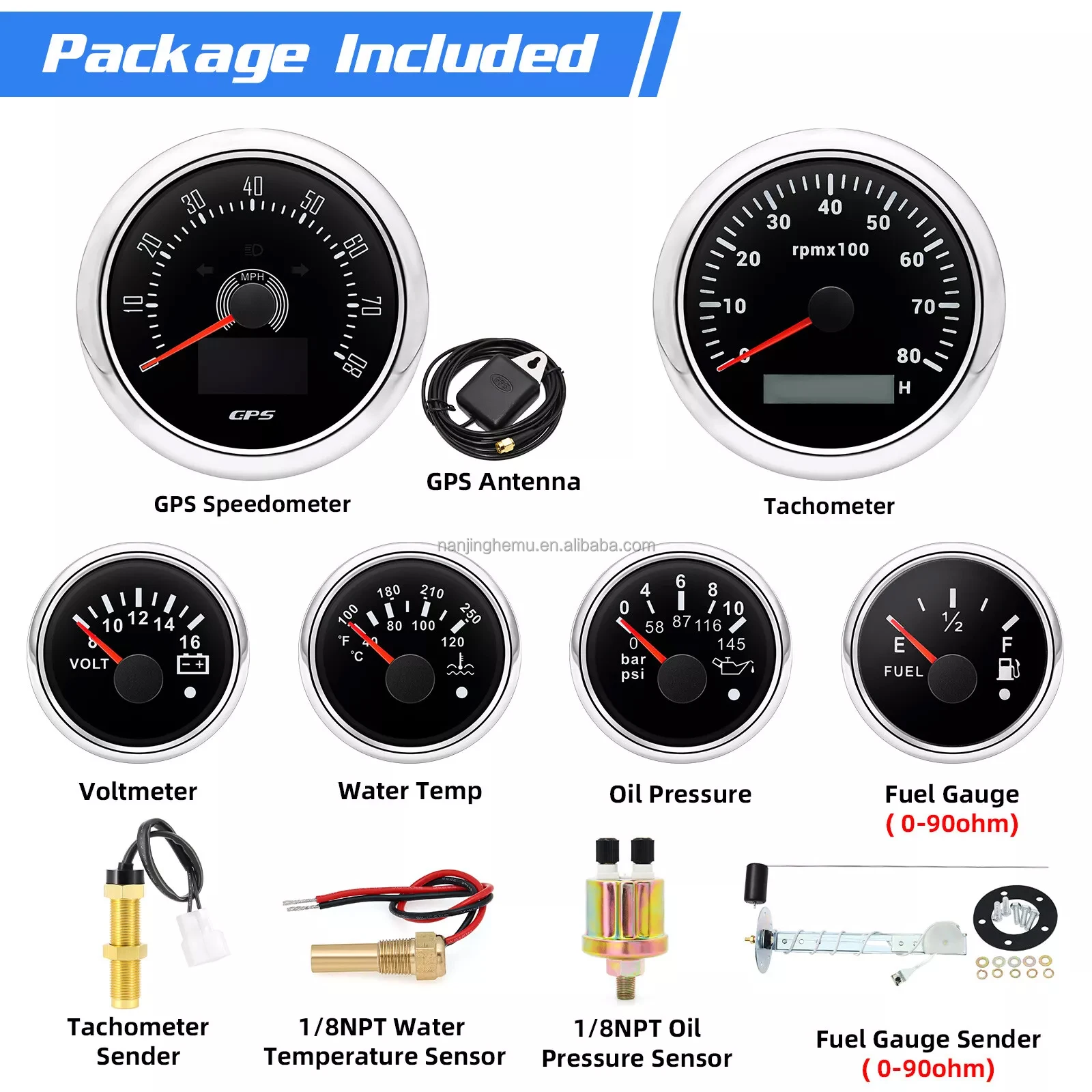 Features:Suitable for all cars.tractors.vans.vessels.boats.yachts.etc.The signal comes directly from the satellite signal receiver (GPS Speed Sensor)The gauge has the advantages of high precision. quick location confirmation and short start up time.IP67 waterproof and dustproof grade.Stepper motors used for full range of stepping gauges. great feature with its less power consumption. longer life. higher precision. etc.With curved glass (with anti-fogging function).With ultra-wide working voltage design( long-term operating voltage: 9-32V.Maximum up to: 36V (≤ 1 min)).Technical Data:Fixing dimension:85mm(3-3/8 inches)Indicating Range:0-80MPHItem: BlackWorking Voltage:9-32VDC(12VDC/24VDC)7 Backlight color:red.green.blue.white.yellow.cyan.purpleTachometer Engine hours: 0.0-99999.9HBacklight:7 Color backlightIndicating Range:0~8000 RPMSignal:PulseFor Tachometer.you can substitute for different unit. please contact us before / after purchase or note on the order.Tachometer:0-3000rpm/0-4000RPM/6000RPM/7000RPMVolt GaugeSizes:52 mm (2-1/16")Measuring Range:8 – 16 (V)Backlight: 7 ColorsFuel Level GaugeSizes:52 mm (2-1/16")Measuring Range:Empty – FullResistance: 0 (E)-90 (F) ohmsBacklight:7 ColorsWater Temperature GaugeInstall diameter: Φ52mmIndication range: 0~120??/100-250?HInput signal: 287.4~22.4 ohmStorage temperature: -40~+85Backlight: 7 ColorsOil Pressure GaugeInstall diameter:Φ52mm or 2-1/16"Indication range:0~10bar/0-145 PSIOperating temperature:-30~+75Storage temperature:-40~+85Backlight: 7 ColorsPackage Includes:1X 85MM Digital GPS Speedometer Gauge1X GPS Antenna1X Tachometer1X Voltmeter1X Fuel level gauge1X Water temp gauge1X Oil pressure gauge 1x Fuel level Sending Units (0-190ohms)1X Oil pressure Sensor (1/8NPT)1X water temp Sensor (1/8NPT) 1X Tachometer Sensor(M16*1.5)Installation InstructionNOTES: The Sending units will be included