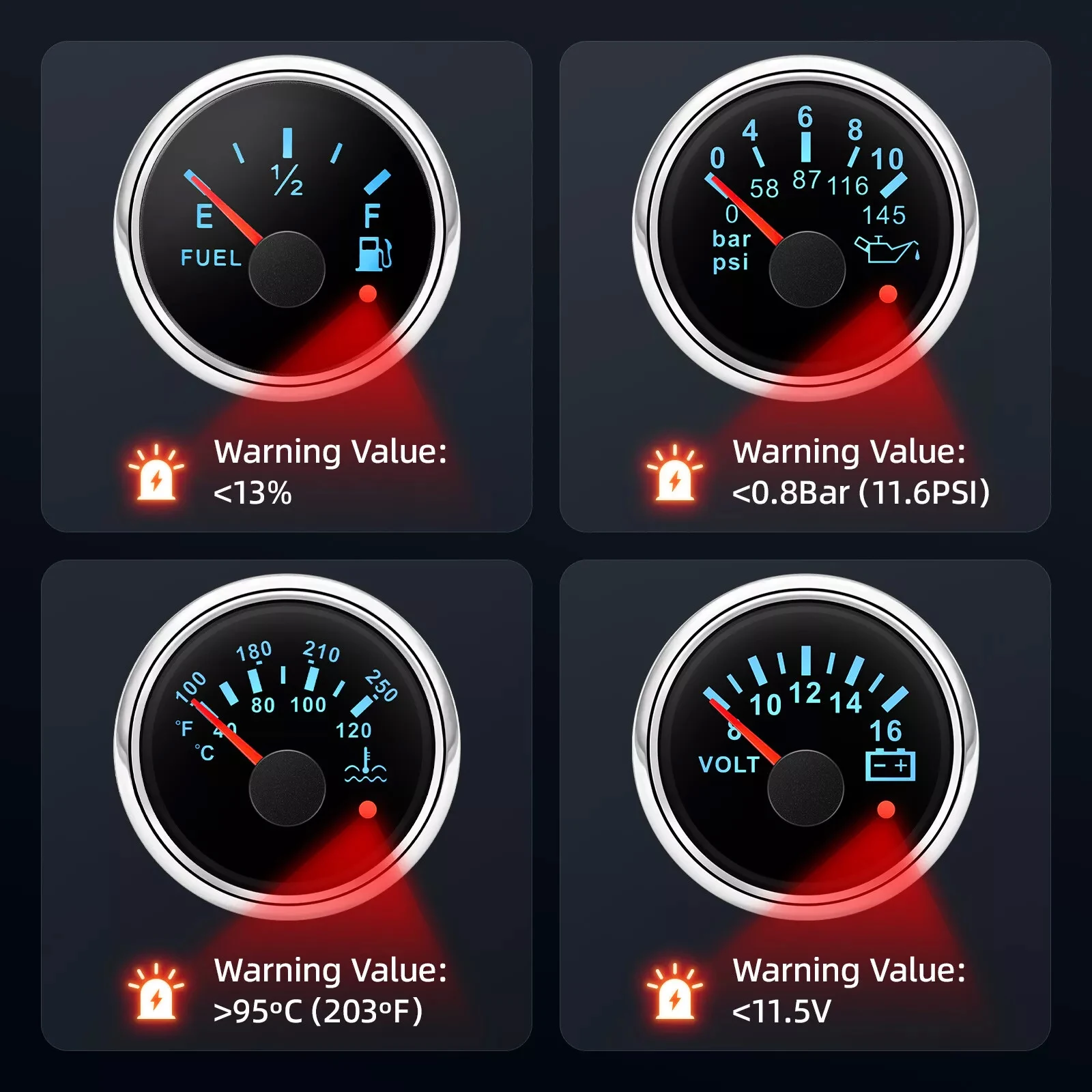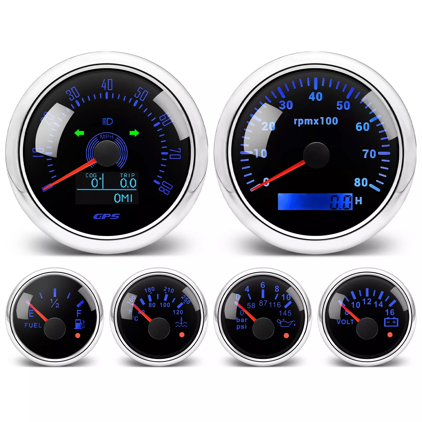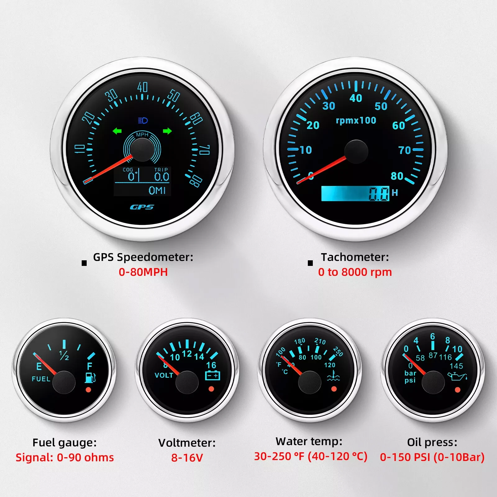 6 Gauge Set With Sensor 85mm GPS Speedometer 80MPH&Tacho 8000RPM Voltage Volt Water Temp Oil Pressure Fuel Level Gauge for Boat