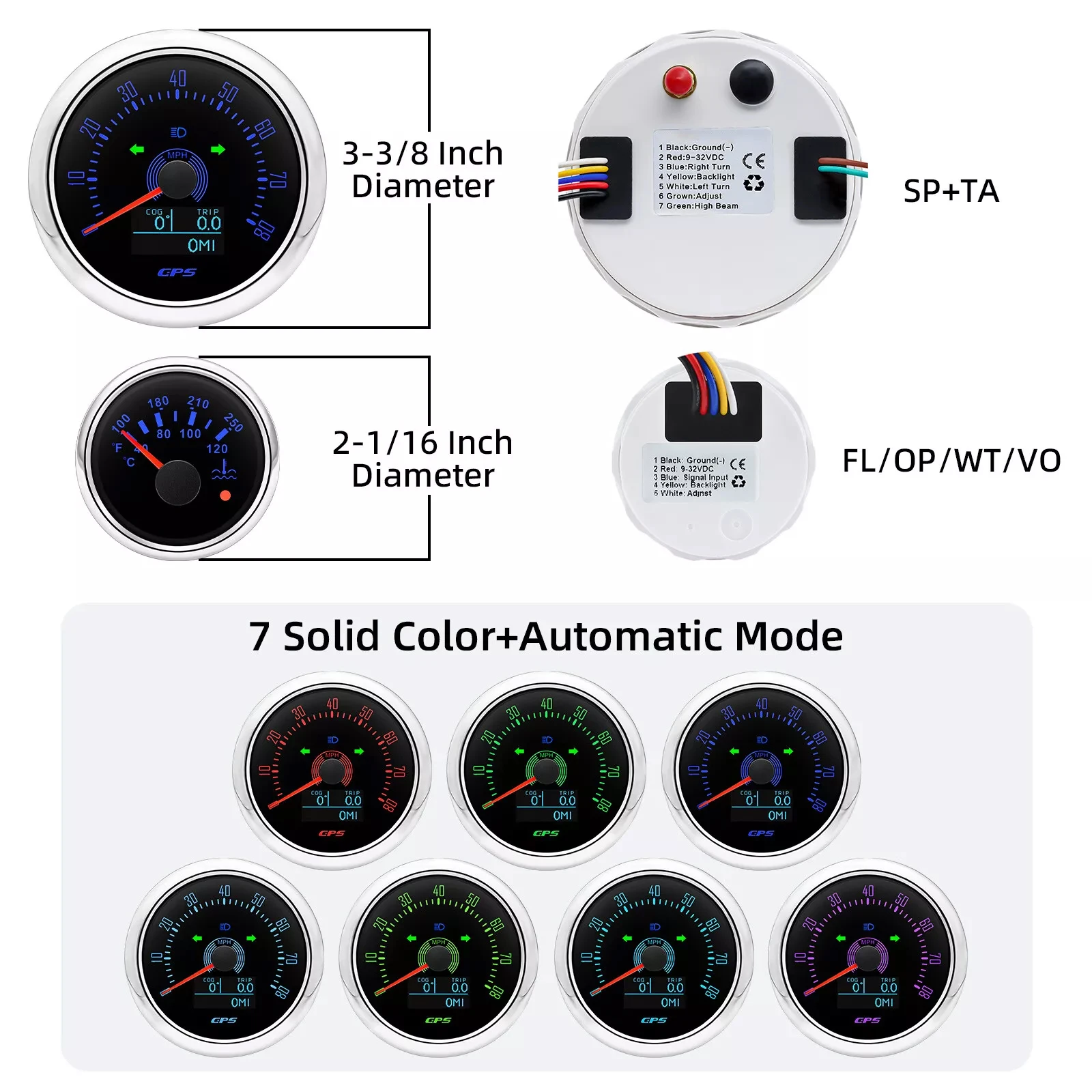 Features:Suitable for all cars.tractors.vans.vessels.boats.yachts.etc.The signal comes directly from the satellite signal receiver (GPS Speed Sensor)The gauge has the advantages of high precision. quick location confirmation and short start up time.IP67 waterproof and dustproof grade.Stepper motors used for full range of stepping gauges. great feature with its less power consumption. longer life. higher precision. etc.With curved glass (with anti-fogging function).With ultra-wide working voltage design( long-term operating voltage: 9-32V.Maximum up to: 36V (≤ 1 min)).Technical Data:Fixing dimension:85mm(3-3/8 inches)Indicating Range:0-80MPHItem: BlackWorking Voltage:9-32VDC(12VDC/24VDC)7 Backlight color:red.green.blue.white.yellow.cyan.purpleTachometer Engine hours: 0.0-99999.9HBacklight:7 Color backlightIndicating Range:0~8000 RPMSignal:PulseFor Tachometer.you can substitute for different unit. please contact us before / after purchase or note on the order.Tachometer:0-3000rpm/0-4000RPM/6000RPM/7000RPMVolt GaugeSizes:52 mm (2-1/16")Measuring Range:8 – 16 (V)Backlight: 7 ColorsFuel Level GaugeSizes:52 mm (2-1/16")Measuring Range:Empty – FullResistance: 0 (E)-90 (F) ohmsBacklight:7 ColorsWater Temperature GaugeInstall diameter: Φ52mmIndication range: 0~120??/100-250?HInput signal: 287.4~22.4 ohmStorage temperature: -40~+85Backlight: 7 ColorsOil Pressure GaugeInstall diameter:Φ52mm or 2-1/16"Indication range:0~10bar/0-145 PSIOperating temperature:-30~+75Storage temperature:-40~+85Backlight: 7 ColorsPackage Includes:1X 85MM Digital GPS Speedometer Gauge1X GPS Antenna1X Tachometer1X Voltmeter1X Fuel level gauge1X Water temp gauge1X Oil pressure gauge 1x Fuel level Sending Units (0-190ohms)1X Oil pressure Sensor (1/8NPT)1X water temp Sensor (1/8NPT) 1X Tachometer Sensor(M16*1.5)Installation InstructionNOTES: The Sending units will be included