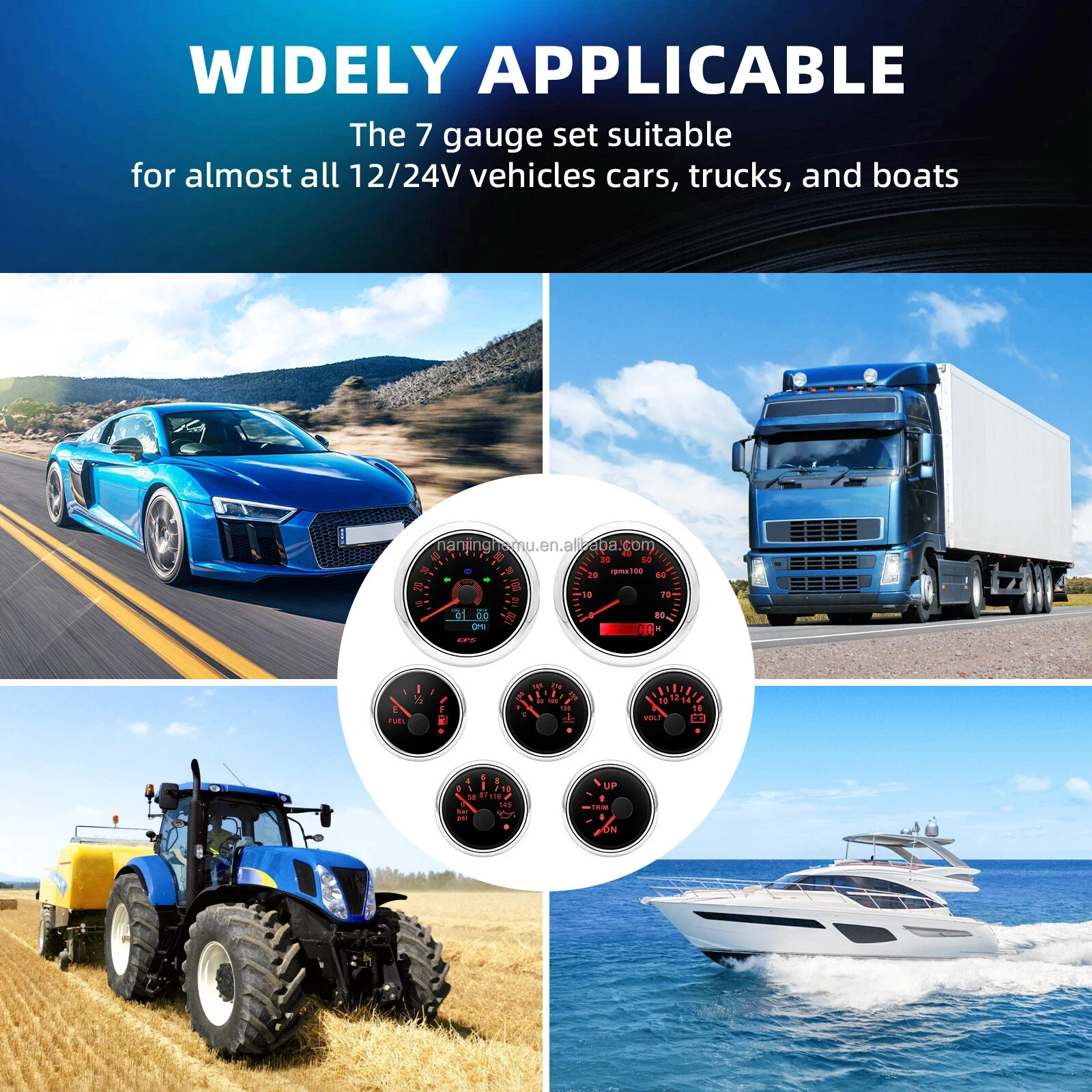 Features:Suitable for all cars.tractors.vans.vessels.boats.yachts.etc.The signal comes directly from the satellite signal receiver (GPS Speed Sensor)The gauge has the advantages of high precision. quick location confirmation and short start up time.IP67 waterproof and dustproof grade.Stepper motors used for full range of stepping gauges. great feature with its less power consumption. longer life. higher precision. etc.With curved glass (with anti-fogging function).With ultra-wide working voltage design( long-term operating voltage: 9-32V.Maximum up to: 36V (≤ 1 min)).Technical Data:Fixing dimension:85mm(3-3/8 inches)Indicating Range:0-120MPHItem: Black&SiliverWorking Voltage:9-32VDC(12VDC/24VDC)7 Backlight color:red.green.blue.white.yellow.cyan.purpleTachometer Engine hours:0.0-99999.9HBacklight:7 Color backlightIndicating Range:0~8000 RPMSignal:PulseFor Tachometer.you can substitute for different unit. please contact us before / after purchase or note on the order.Tachometer:0-3000rpm/0-4000RPM/6000RPM/7000RPMVolt GaugeSizes:52 mm (2-1/16")Measuring Range:8-16 (V)Backlight: 7 ColorsFuel Level GaugeSizes:52 mm (2-1/16")Measuring Range:Empty – FullResistance: 240 (E)-33 (F) ohmsBacklight:7 ColorsTrim gauge7 Color Backlight :Red (default)→green→ blue→ white→yellow→cyan→Purple→(automatic).Fixing dimension: 52mm(2'')Indicating Range: UP-DNSignal: 0-190ohmsWorking Voltage: 9-32V(12V/24V)Operation mode: LCD display. stepper motorWater Temperature GaugeInstall diameter: Φ52mmIndication range: 0~120??/100-250?HInput signal: 287.4~22.4 ohmStorage temperature: -40~+85Backlight: 7 ColorsOil Pressure GaugeInstall diameter:Φ52mm or 2-1/16"Indication range:0~10bar/0-145 PSIOperating temperature:-30~+75Storage temperature:-40~+85Backlight: 7 ColorsPackage Includes:1X 85MM Digital GPS Speedometer Gauge1X GPS Antenna1X 85MM Tachometer1X 52MM Fuel Level gauge1X 52MM Trim gauge1X 52MM Voltmeter1X 52MM Water temp gauge1X 52MM Oil Pressure gauge 7X Installation InstructionThe sending units will be included