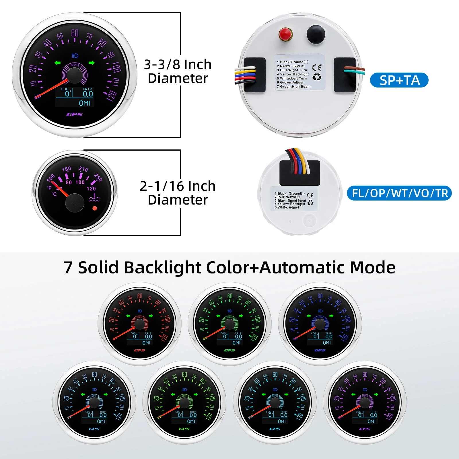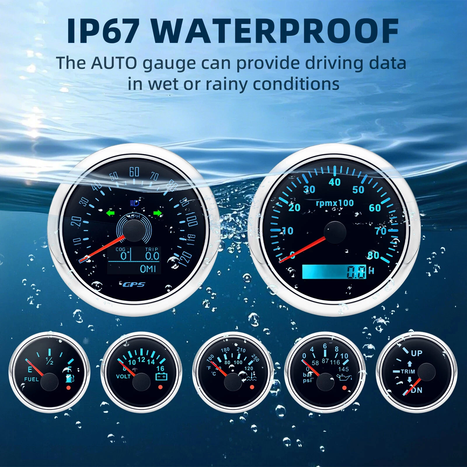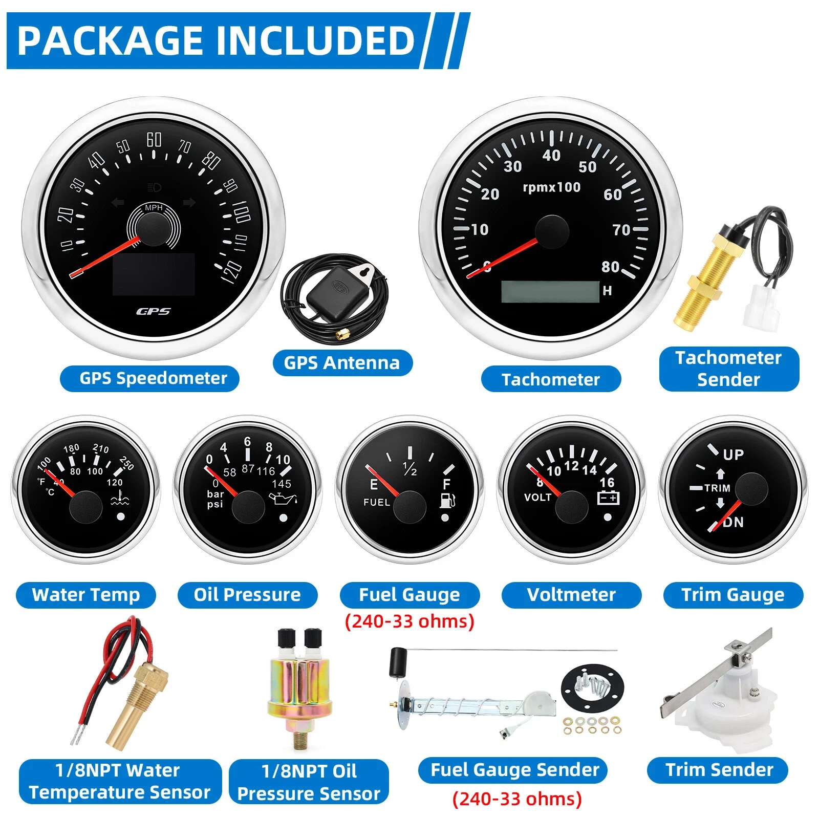 Features:Suitable for all cars.tractors.vans.vessels.boats.yachts.etc.The signal comes directly from the satellite signal receiver (GPS Speed Sensor)The gauge has the advantages of high precision. quick location confirmation and short start up time.IP67 waterproof and dustproof grade.Stepper motors used for full range of stepping gauges. great feature with its less power consumption. longer life. higher precision. etc.With curved glass (with anti-fogging function).With ultra-wide working voltage design( long-term operating voltage: 9-32V.Maximum up to: 36V (≤ 1 min)).Technical Data:Fixing dimension:85mm(3-3/8 inches)Indicating Range:0-120MPHItem: Black&SiliverWorking Voltage:9-32VDC(12VDC/24VDC)7 Backlight color:red.green.blue.white.yellow.cyan.purpleTachometer Engine hours:0.0-99999.9HBacklight:7 Color backlightIndicating Range:0~8000 RPMSignal:PulseFor Tachometer.you can substitute for different unit. please contact us before / after purchase or note on the order.Tachometer:0-3000rpm/0-4000RPM/6000RPM/7000RPMVolt GaugeSizes:52 mm (2-1/16")Measuring Range:8-16 (V)Backlight: 7 ColorsFuel Level GaugeSizes:52 mm (2-1/16")Measuring Range:Empty – FullResistance: 240 (E)-33 (F) ohmsBacklight:7 ColorsTrim gauge7 Color Backlight :Red (default)→green→ blue→ white→yellow→cyan→Purple→(automatic).Fixing dimension: 52mm(2'')Indicating Range: UP-DNSignal: 0-190ohmsWorking Voltage: 9-32V(12V/24V)Operation mode: LCD display. stepper motorWater Temperature GaugeInstall diameter: Φ52mmIndication range: 0~120??/100-250?HInput signal: 287.4~22.4 ohmStorage temperature: -40~+85Backlight: 7 ColorsOil Pressure GaugeInstall diameter:Φ52mm or 2-1/16"Indication range:0~10bar/0-145 PSIOperating temperature:-30~+75Storage temperature:-40~+85Backlight: 7 ColorsPackage Includes:1X 85MM Digital GPS Speedometer Gauge1X GPS Antenna1X 85MM Tachometer1X 52MM Fuel Level gauge1X 52MM Trim gauge1X 52MM Voltmeter1X 52MM Water temp gauge1X 52MM Oil Pressure gauge 7X Installation InstructionThe sending units will be included