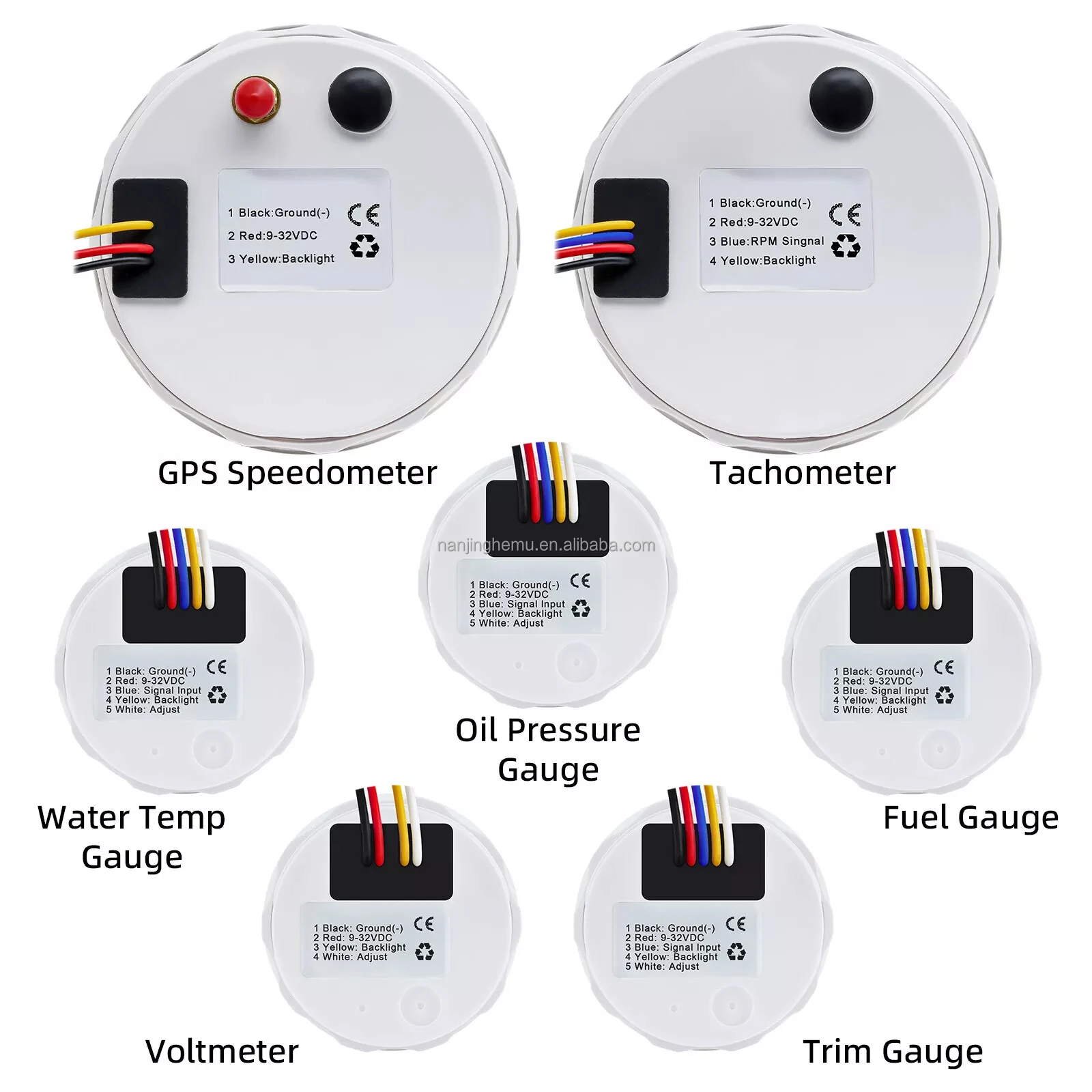 Speedometer:Fixing dimension:85mm(3-3/8 inches)Indicating Range:0-80MPHItem:White&SilverWorking Voltage:9-32VDC(12VDC/24VDC)7 Backlight color:red.green.blue.white.yellow.cyan.purpleTachometer:Engine hours:0.0-99999.9HBacklight:7 Color backlightIndicating Range:0~8000 RPMSignal:PulseFor Tachometer.you can substitute for different unit. please contact us before / after purchase or note on the order.Tachometer:0-3000rpm/0-4000RPM/6000RPM/7000RPMVolt Gauge:Sizes: 52 mm (2-1/16")Measuring Range:8 – 16 (V)Backlight: 7 ColorsFuel Level Gauge:Sizes: 52 mm (2-1/16")Measuring Range: Empty – FullResistance: 240 (E)-33 (F) ohmsBacklight: 7 ColorsWater Temperature Gauge:Install diameter: Φ52mmIndication range: 0~120??/30-250?HInput signal: 287.4~22.4 ohmStorage temperature: -40~+85Backlight: 7 ColorsOil Pressure Gauge:Install diameter:Φ52mm or 2-1/16"Indication range:0~10bar/0-150 PSIOperating temperature:-30~+75Storage temperature:-40~+85Backlight: 7 ColorsTrim Gauge:7 Color Backlight : Red (default)→green → blue → white →yellow→cyan →Purple →(automatic).Fixing dimension: 52mm(2'')Indicating Range: UP-DNSignal: 0-190ohmsWorking Voltage: 9-32V(12V/24V)Operation mode: LCD display. stepper motoPackage Includes:1X 85MM Digital GPS Speedometer Gauge1X GPS Antenna1X Tachometer1X Voltmeter1X Fuel level gauge1XTrim Gauge 1X Water temp gauge1X Oil pressure gauge 1x Rudder Angle Sensor1x Fuel level Sending Units (240-33ohms)1X Oil pressure Sensor (1/8NPT)1X water temp Sensor (1/8NPT) 1X Tachometer Sensor(M16*1.5)Installation InstructionNOTES: The Sending units will be included