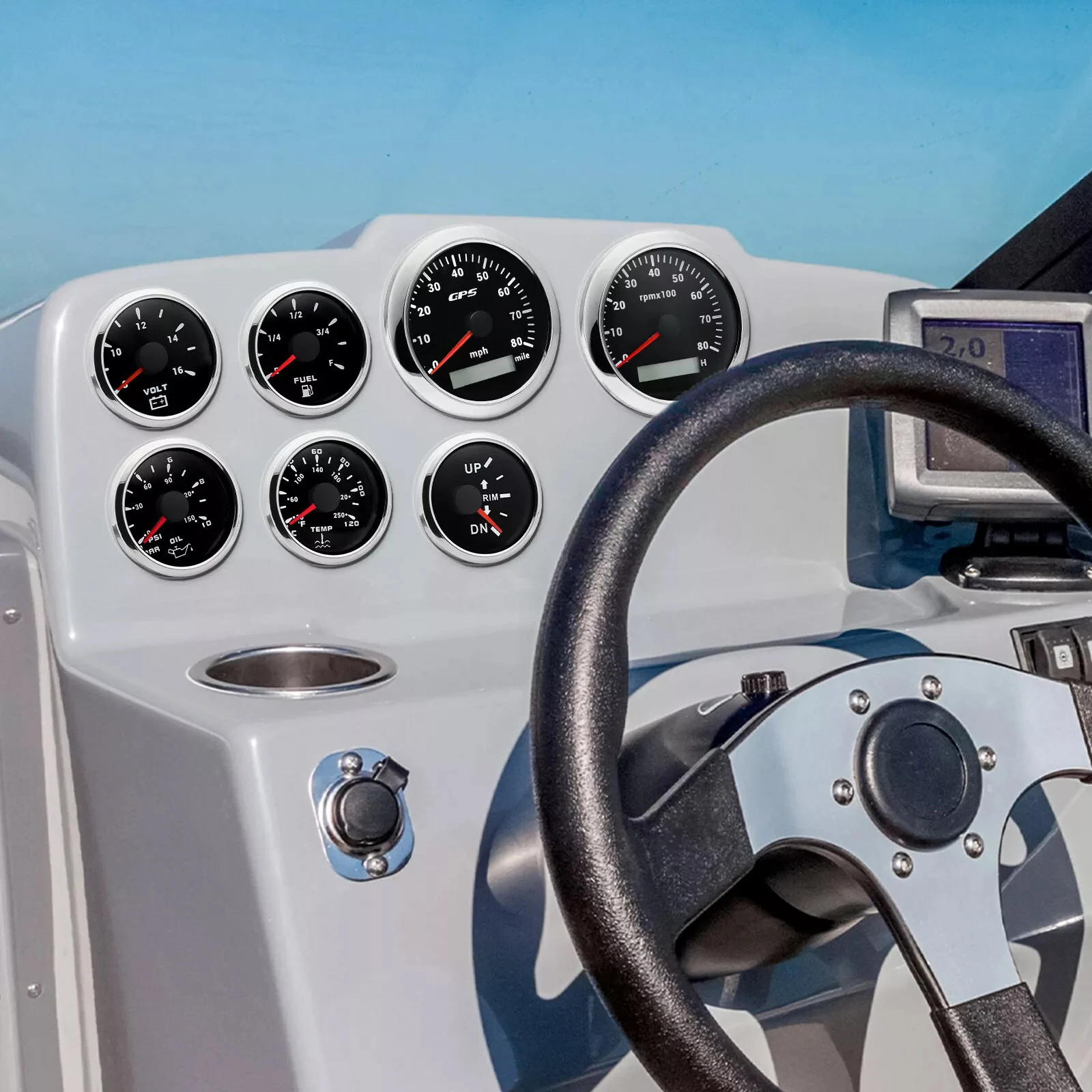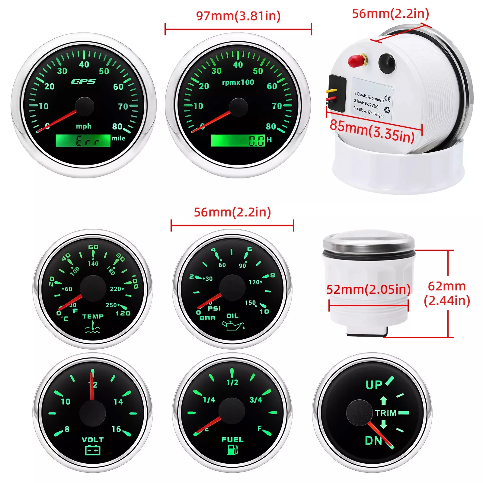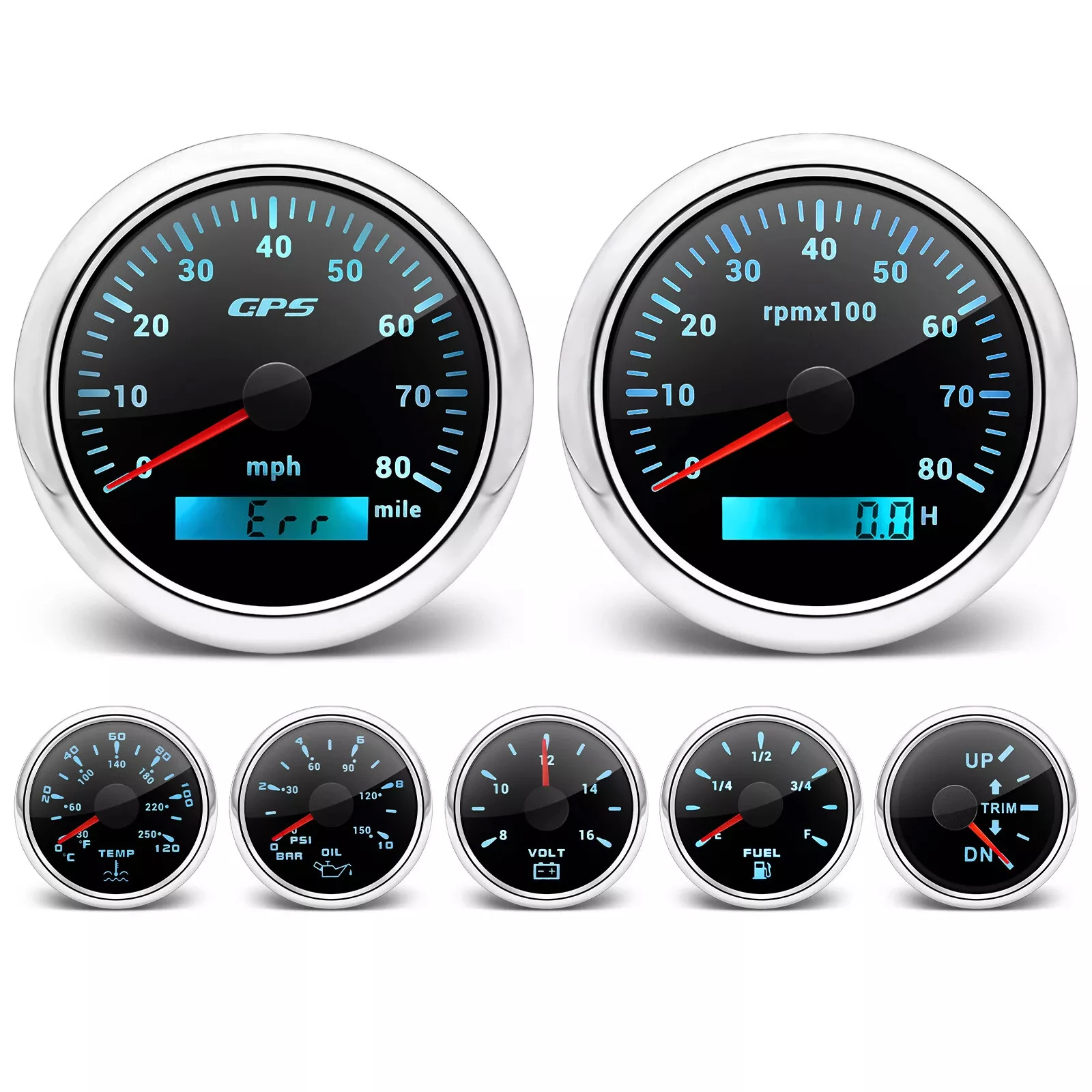 7 Gauge Set 85mm GPS Speedometer 80MPH Tachometer Fuel Level Oil Pressure Water Temp Trim Volt Gauge Fit Marine Boat Car