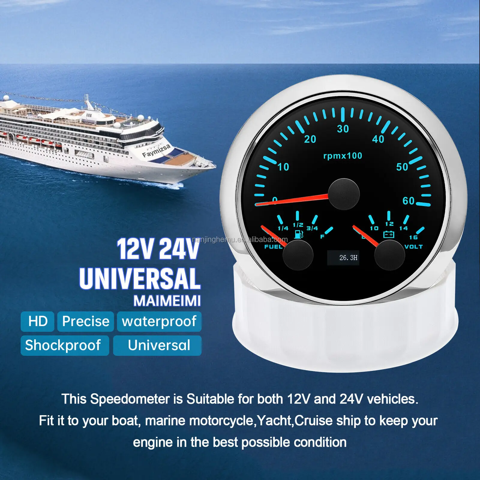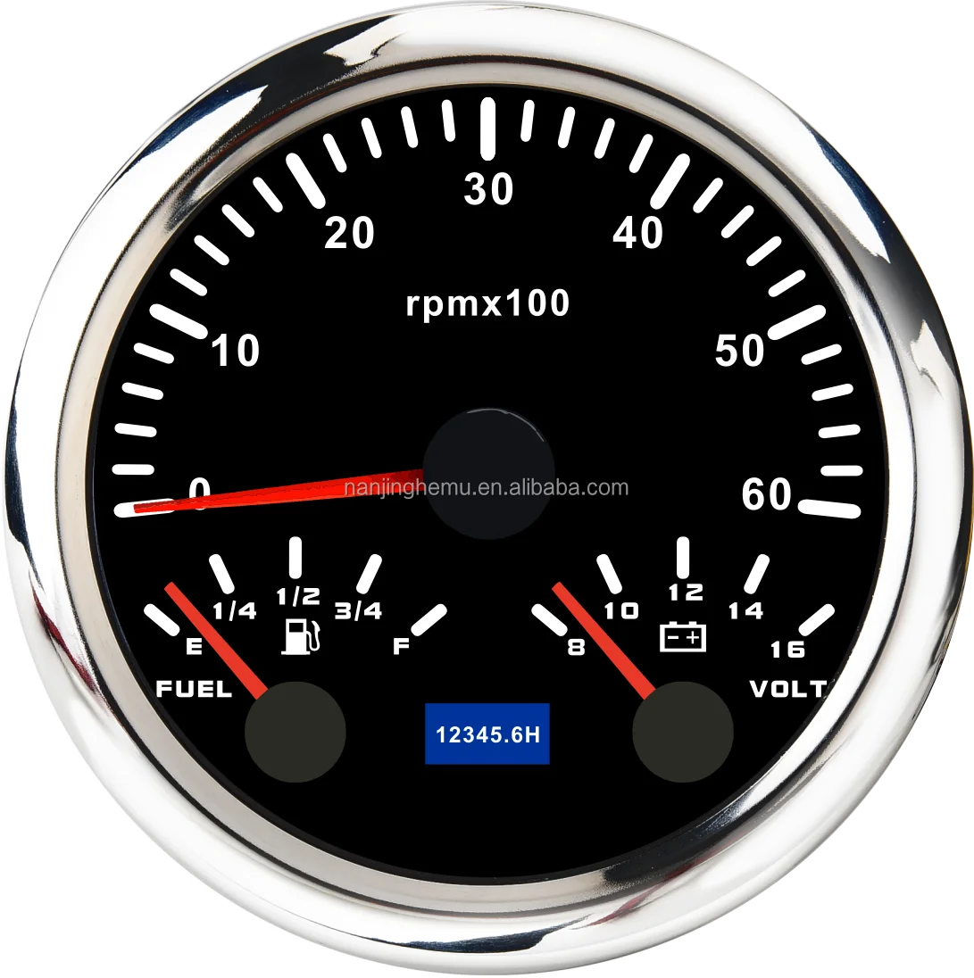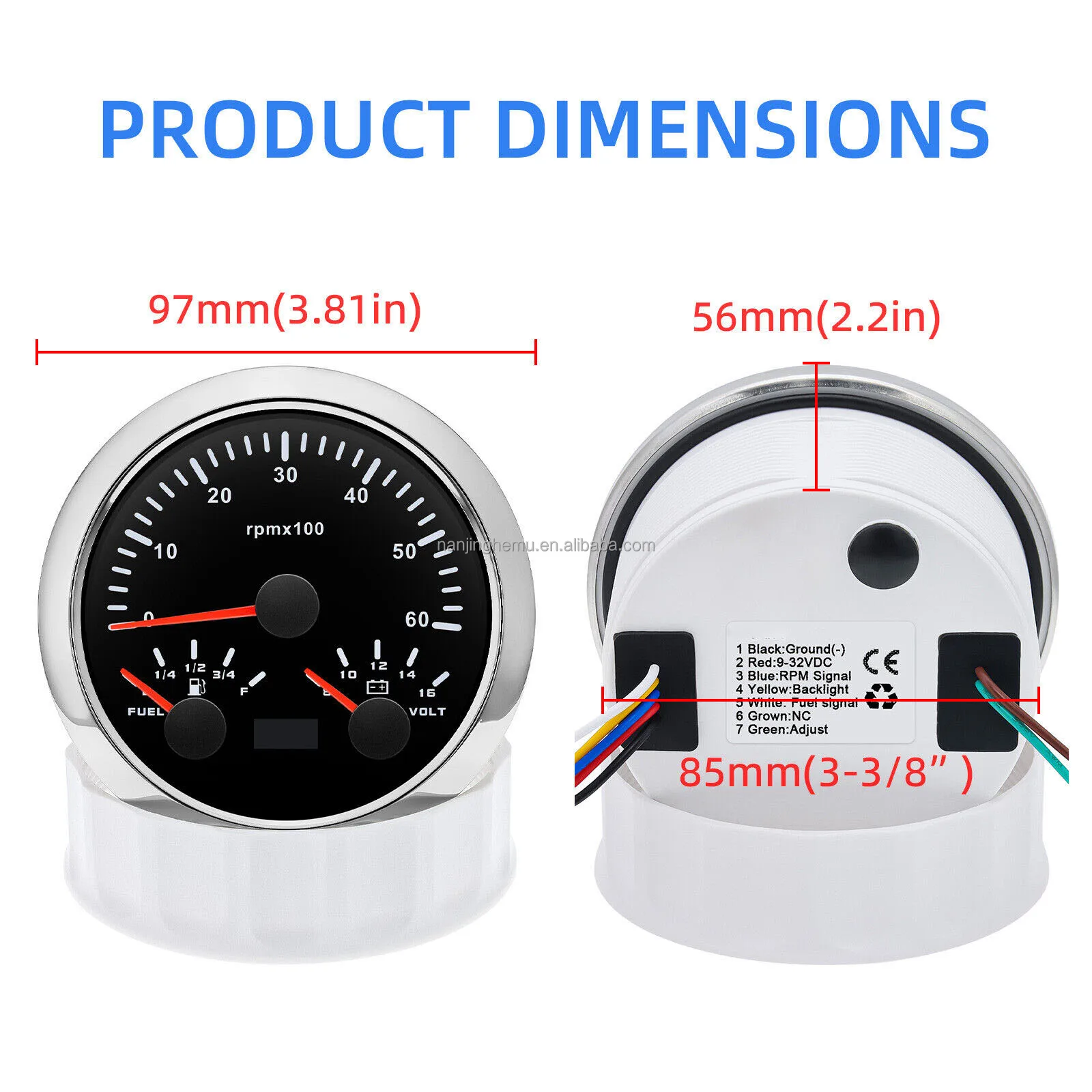 Features:RPM Tachometer Support : Car /Truck/ Boat /Diesel Generator Engine /Gasoline EngineWaterproof:IP 67Excellent anti-fogging function;316 Stainless steel bezel with curved glass;Convenient Installation by multi-plug socket connecting way;With curved glass( with anti-fog function).7 colors baclight for your choose (red (default)→green →blue →white →yellow →cyan →Purple→(automatic)).customers can adjust any color that you likeTachometer fit for Car /Truck/ Boat /Diesel Generator Engine /Gasoline EngineSpecification:Size: 85mmTachometer: 0-6000RPMFuel level: 0-190ohms. 240-33ohms(Can be adjusted)Voltage: 8-16VWorking voltage: 9-32VDCWorking current: ??100mAWorking temperature: -30-80??Storage temperature: -40-85??Backlight :7 Color backlightColor: BlackPackage Included:1 x 85mm 3 in 1 Multifunctional Gauge1 x Cable1 x Installation Instruction