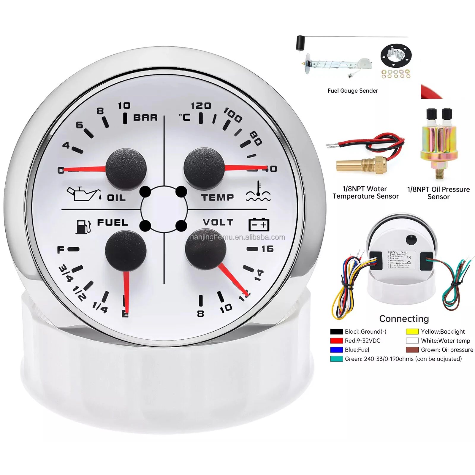 4 In 1 Gauge ConnectionBlack:Ground(-)Red: 9-32VDC(+)Blue:FuelYellow:BacklightWhite:Water tempGrown:Oil pressureGreen:Signal parameters(Can be adjusted 240-33ohms or 0-190ohms)Default input signal is 0~190ohm.when 7-Green connect to Ground.input signal change to 240~33ohm;Features:The world's newest 4 in 1 multifunction gauge.Convenient Installation by multi-plug socket connecting way.The gauge has the advantages of high precision. quick location confirmation and short start up time.Most importantly. the gauge is easy to setup. and can be used in all vehicles. boats and off-road vehiclesTechnical Data:Fixing dimension: 85mVolt GaugeMeasuring Range: 8 – 16 (VFuel Level GaugeMeasuring Range: Empty – FullResistance:240-33ohms. empty-full; (The signal can be adjusted)With Fuel SendeWater Temperature GaugeMeasuring Range: 40-120 ?? With Water Temperature Sensor 1/8NPOil Pressure GaugeMeasuring Range: 0-10Bar With Oil Pressure Sensor 1/8NPT Input Signal:10-184ohms for 0-10Bar oil pressure meter;0-190ohms for fuel level meter;(Default 240-33ohms. can adjust to 0-190ohms)8-16V voltage meter;Input Signal 320-22ohms for water temperature meterRed backlightProtection grade is IP67. the whole body is completely waterproof;Excellent antifogging function;316 Stainless steel bezel with curved glass;Convenient Installation by multi-plug socket connecting way;Accessories: matched with connectors. Installation Instruction Package Included:1 x 85mm 4 in 1 Multifunctional Gauge1 x Fuel level sending units1 x Water Temperature Sensor (Thread Size: 1/8 NPT)1 x Oil Pressure Sensor (Thread Size: 1/8 NPT)1 x Wire Cable1 x Installation Instruction
