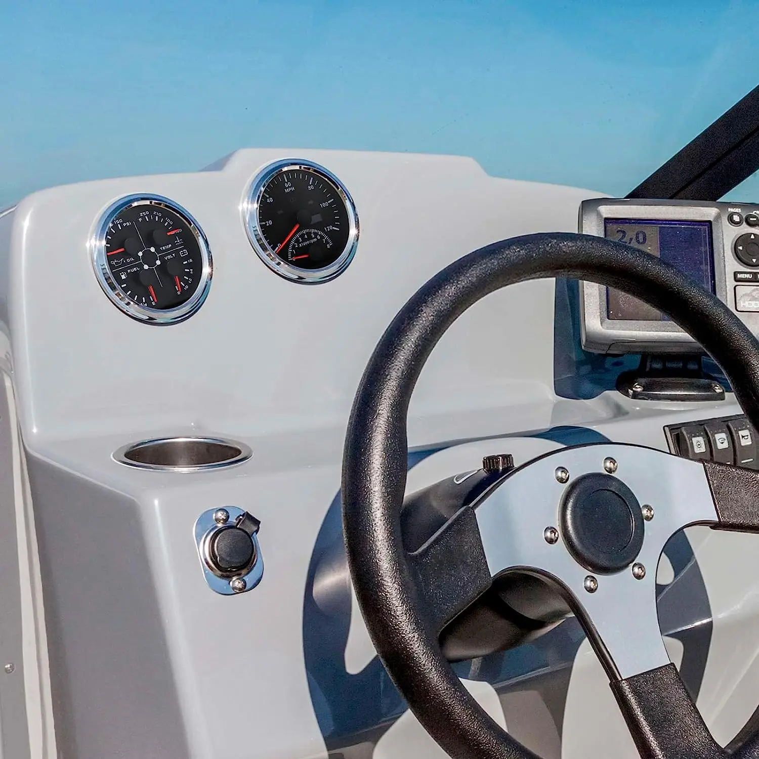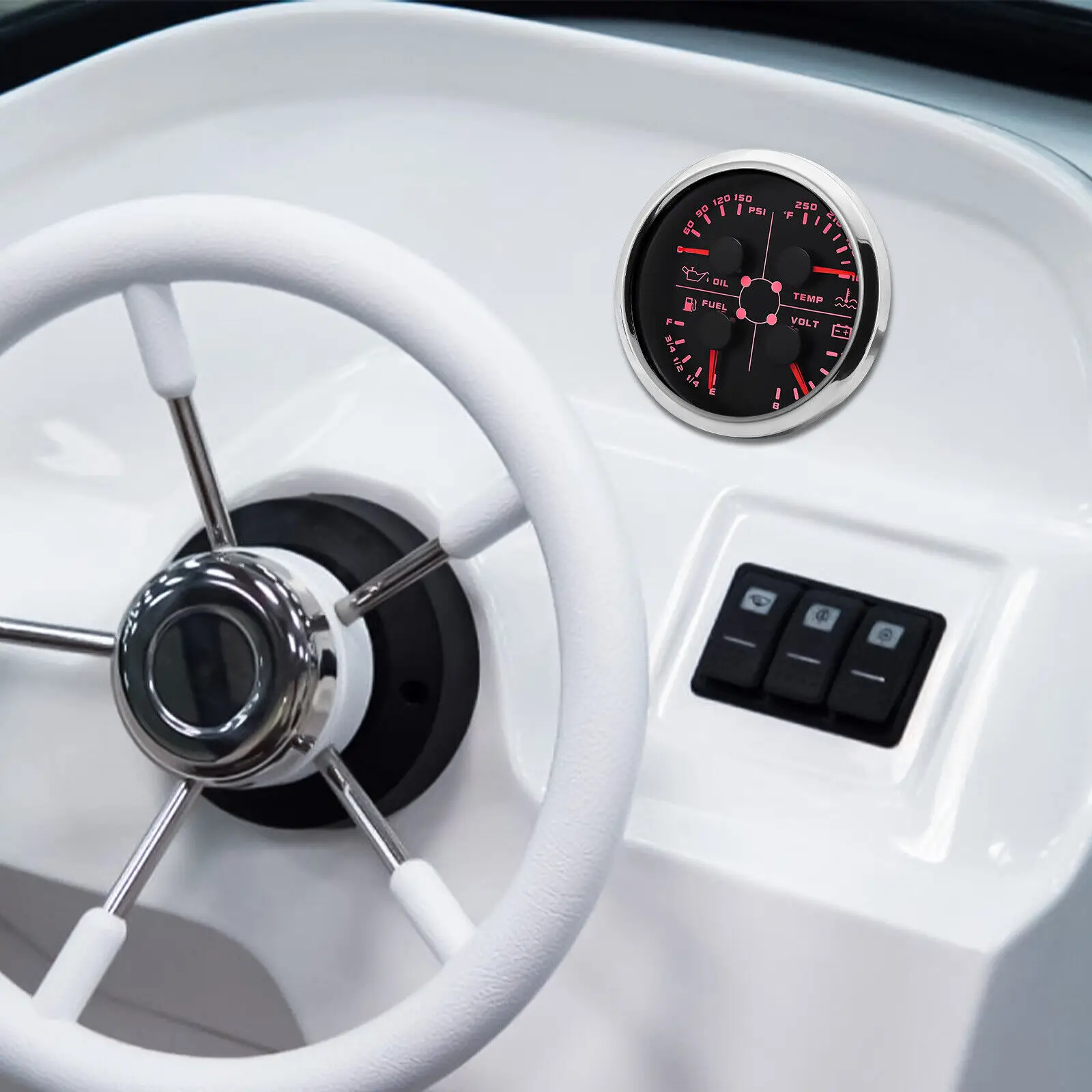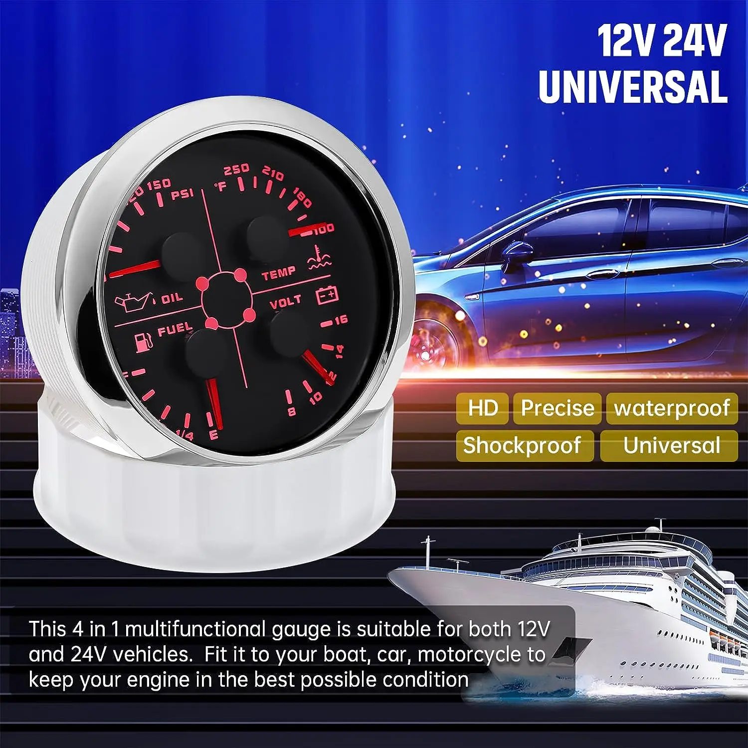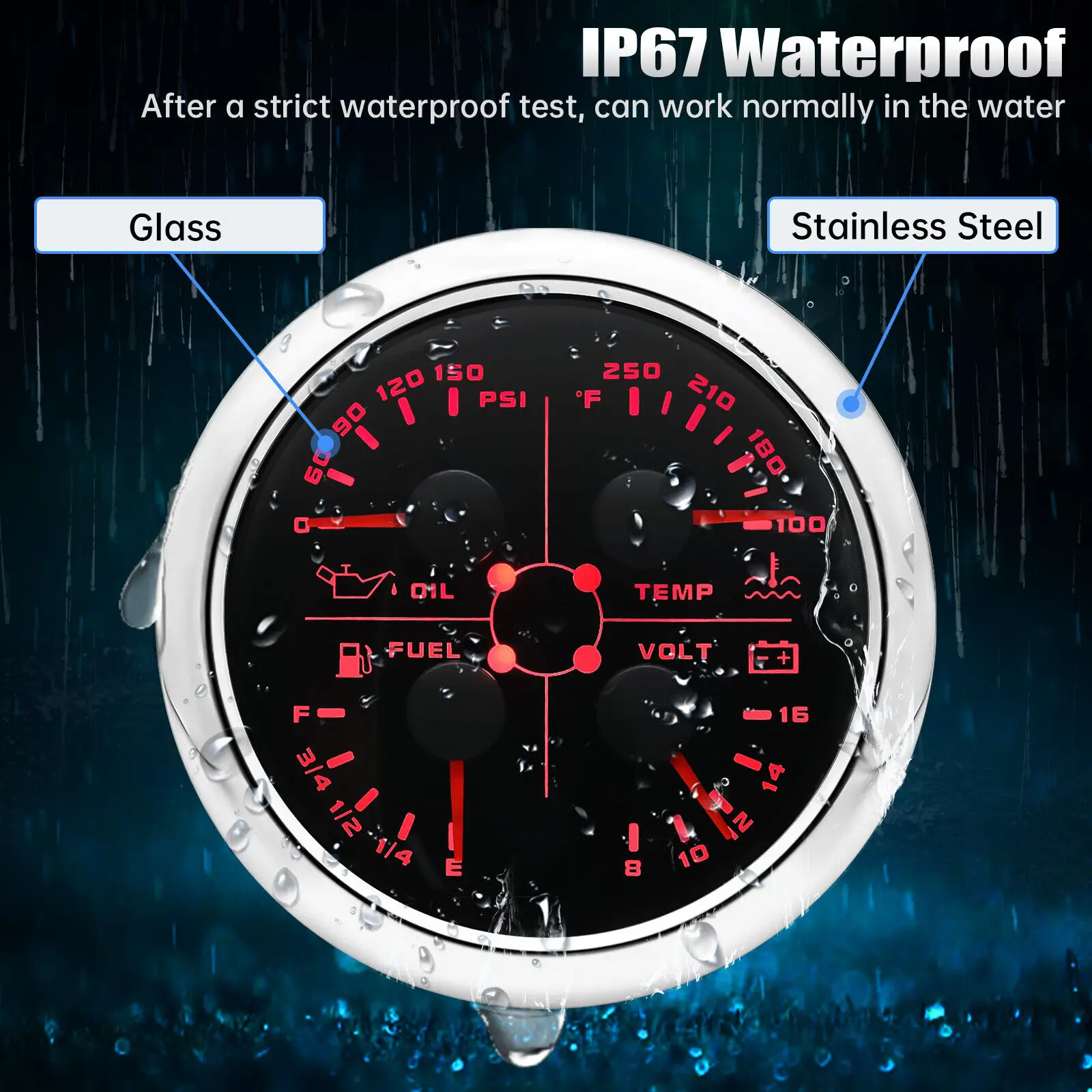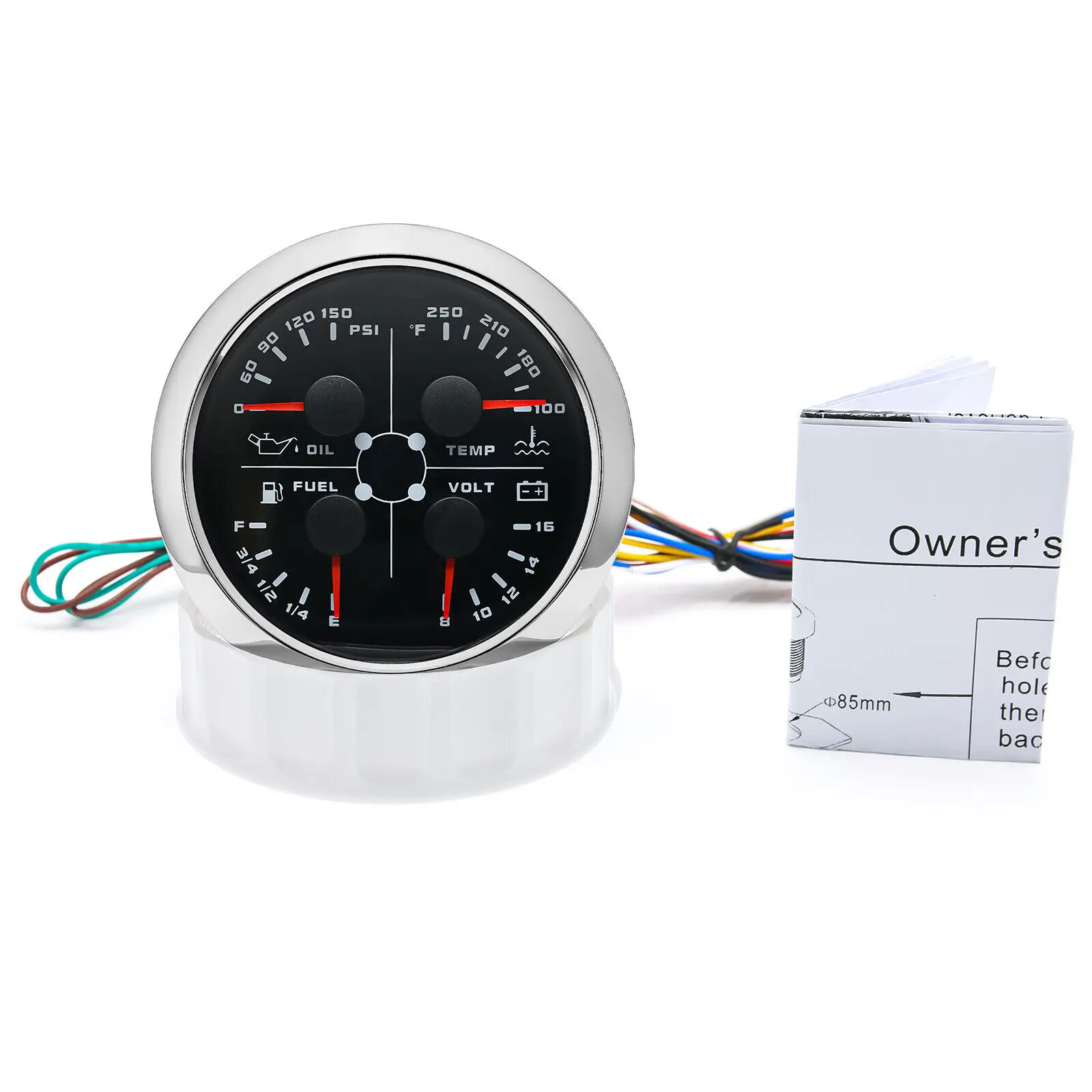 ??Multi-function ??The gauge display voltmeter. oil pressure. Fuel Level. water temperature gauge. it constantly monitors the value changes of oil and water temperature to ensure driving safety. Applicable to most car. boats. truck. and off-road vehicles.??Range??Indicating Range: Engine oil pressure: 0~150PSI. Engine temperature: 100-250°F. Battery voltage: 8-16V. Fuel level: 0~ 100%. 0-190ohms for fuel level meter;(Default 0-190ohms. can adjust to 240-33ohms)??Alarm message??Alarm message. 1.Fuel<13% alarm. 2.Oil pressure<0.8bar alarm. 3.Water temp. >95?? alarm. 4.Voltage <11.5V alarm. Input parameter(The sensor will be not included). Oil pressure sensor: 10~184ohms. Temperature sensor: 301~22ohms. Fuel level sensor: 0~190ohm or 240~33ohms.??Material?? Protection grade is IP67. the whole body is completely waterproof.Features:The world's newest 4 in 1 multifunction gauge.Convenient Installation by multi-plug socket connecting way.The gauge has the advantages of high precision. quick location confirmation and short start up time.Most importantly. the gauge is easy to setup. and can be used in all vehicles. boats and off-road vehicles.Technical Data:Fixing dimension: 85mmIndicating Range: Oil press. meter: 0-150psi;Water temp. meter: 100-250° FFuel level meter: 0-190ohms/240-33ohms. empty-full; (The signal can be adjusted)Voltmeter: 8-16VWorking Voltage: 12VBacklight: RedConnectionBlack: Ground(-)Red: 9-32VDC(+)Blue:FuelYellow: BacklightWhite: Water tempGrown: Oil pressureGreen??Signal parameters(Can be adjusted 240-33ohms or 0-190ohms)Input Signal:10-184ohms for 0-150PSI oil pressure meter;0-190ohms for fuel level meter;(Default 0-190ohms. can adjust to 240-33ohms)8-16V voltage meter;Input Signal 287.4-22.4ohms for water temperature meterRed backlightExcellent antifogging function;316 Stainless steel bezel with curved glass;Convenient Installation by multi-plug socket connecting way;Accessories: matched with connectors. Installation InstructionPackage Included:1 x 85mm 4 in 1 Multifunctional Gauge1 x Cable1 x Installation Instruction