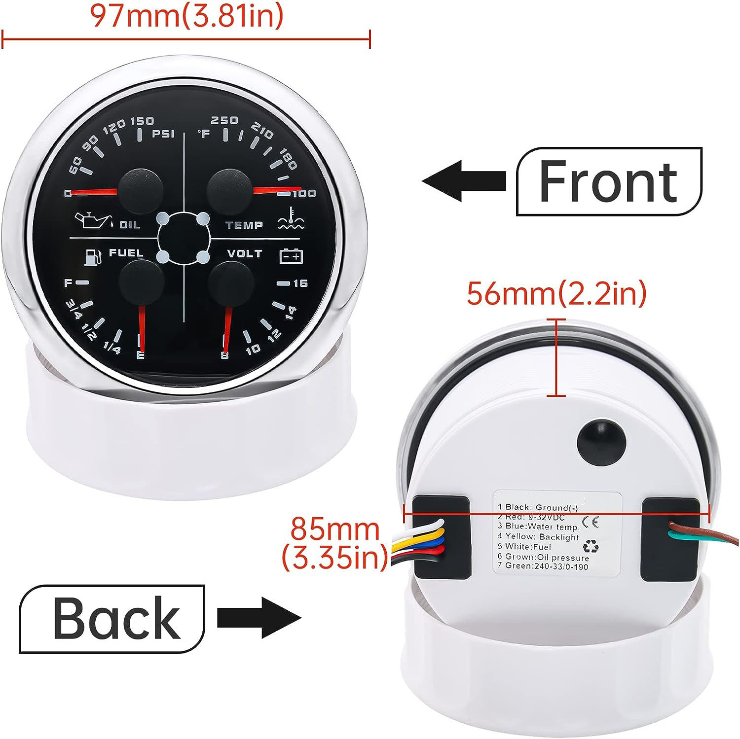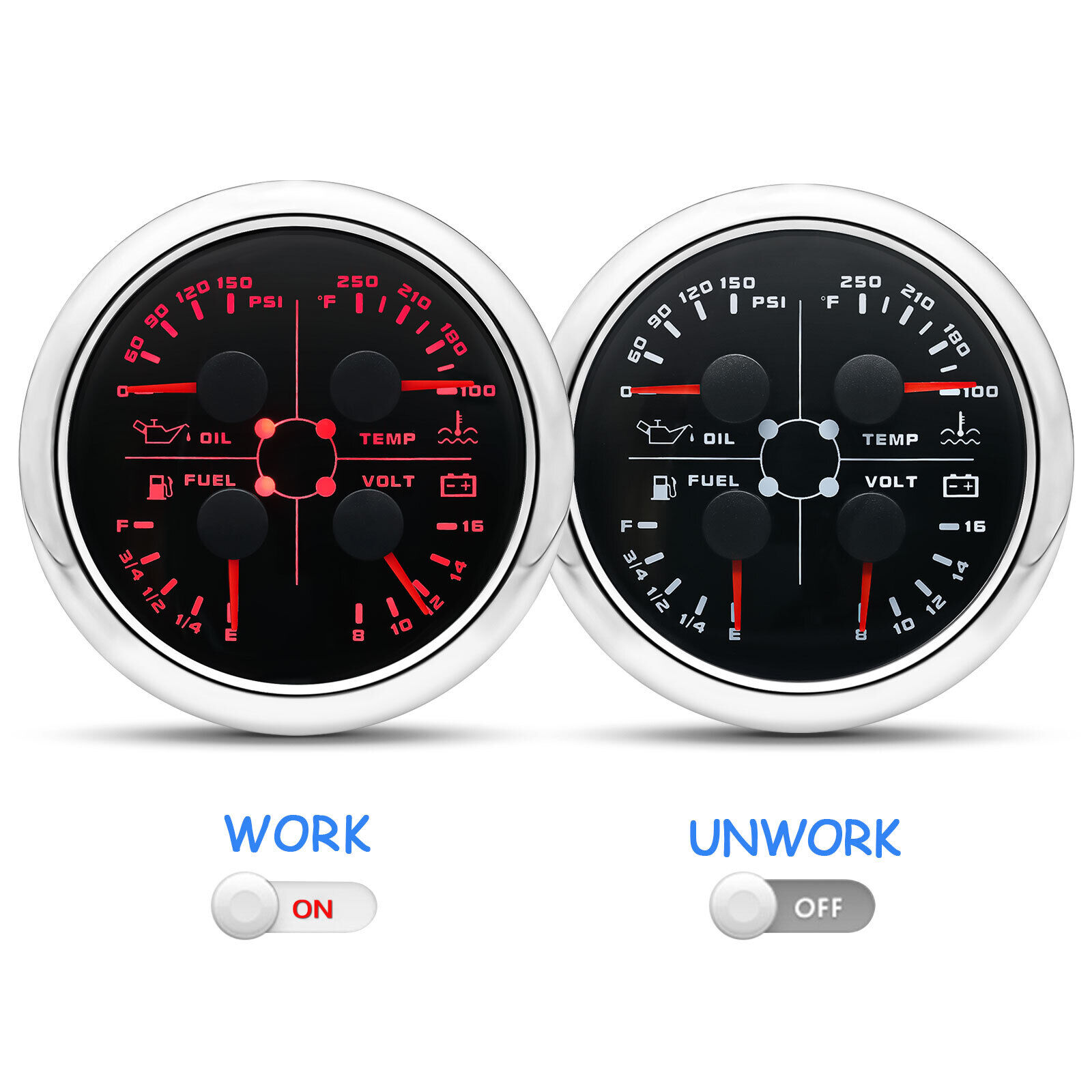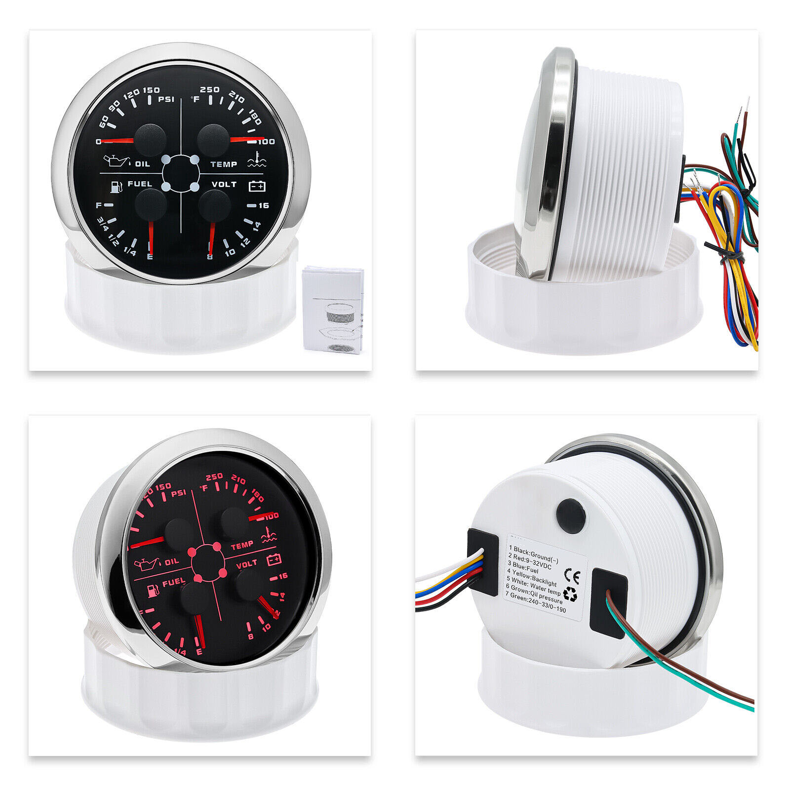??Multi-function ??The gauge display voltmeter. oil pressure. Fuel Level. water temperature gauge. it constantly monitors the value changes of oil and water temperature to ensure driving safety. Applicable to most car. boats. truck. and off-road vehicles.??Range??Indicating Range: Engine oil pressure: 0~150PSI. Engine temperature: 100-250°F. Battery voltage: 8-16V. Fuel level: 0~ 100%. 0-190ohms for fuel level meter;(Default 0-190ohms. can adjust to 240-33ohms)??Alarm message??Alarm message. 1.Fuel<13% alarm. 2.Oil pressure<0.8bar alarm. 3.Water temp. >95?? alarm. 4.Voltage <11.5V alarm. Input parameter(The sensor will be not included). Oil pressure sensor: 10~184ohms. Temperature sensor: 301~22ohms. Fuel level sensor: 0~190ohm or 240~33ohms.??Material?? Protection grade is IP67. the whole body is completely waterproof.Features:The world's newest 4 in 1 multifunction gauge.Convenient Installation by multi-plug socket connecting way.The gauge has the advantages of high precision. quick location confirmation and short start up time.Most importantly. the gauge is easy to setup. and can be used in all vehicles. boats and off-road vehicles.Technical Data:Fixing dimension: 85mmIndicating Range: Oil press. meter: 0-150psi;Water temp. meter: 100-250° FFuel level meter: 0-190ohms/240-33ohms. empty-full; (The signal can be adjusted)Voltmeter: 8-16VWorking Voltage: 12VBacklight: RedConnectionBlack: Ground(-)Red: 9-32VDC(+)Blue:FuelYellow: BacklightWhite: Water tempGrown: Oil pressureGreen??Signal parameters(Can be adjusted 240-33ohms or 0-190ohms)Input Signal:10-184ohms for 0-150PSI oil pressure meter;0-190ohms for fuel level meter;(Default 0-190ohms. can adjust to 240-33ohms)8-16V voltage meter;Input Signal 287.4-22.4ohms for water temperature meterRed backlightExcellent antifogging function;316 Stainless steel bezel with curved glass;Convenient Installation by multi-plug socket connecting way;Accessories: matched with connectors. Installation InstructionPackage Included:1 x 85mm 4 in 1 Multifunctional Gauge1 x Cable1 x Installation Instruction