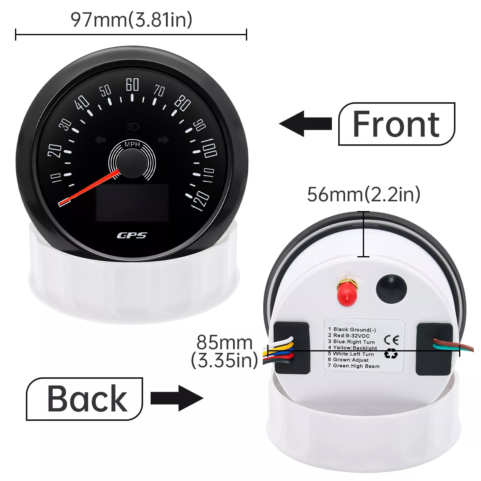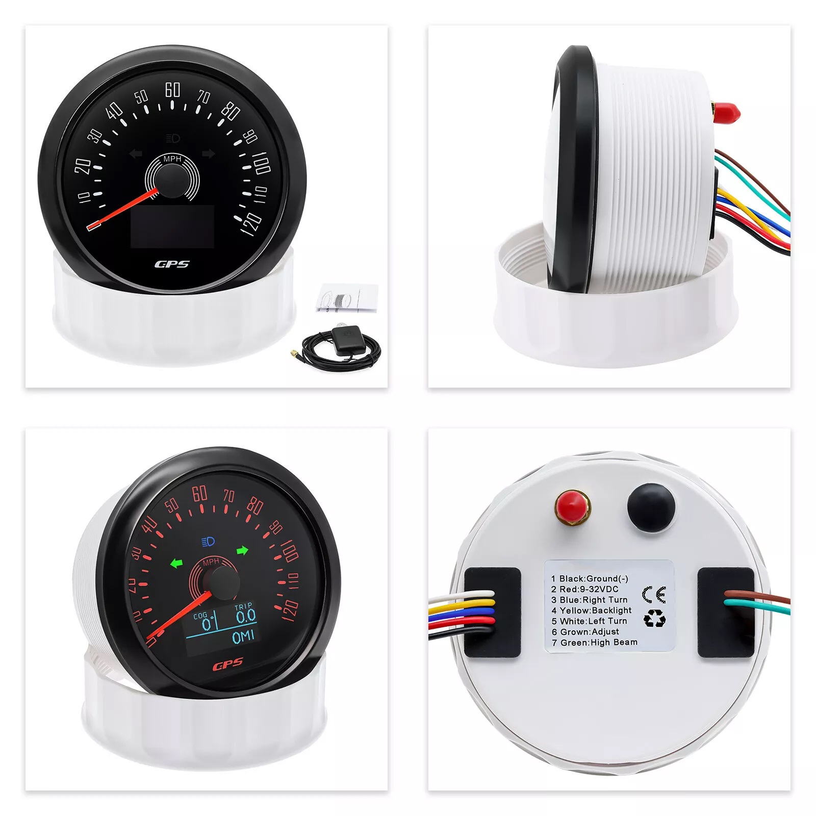 Product Features:1.Turn it on. then the meter star to search the signal and LCD will display "COG" .if there is still no GPS signal after three minute. LCD displays "Err".2.Short press the button to change the backlight color : Backlight changed in sequence: red (default) → green → blue → white → yellow → cyan →Purple → (automatic).Automatic: Automatically switch the backlight color every 1 minute. Cycle switch according to the above sequence.3.Keep on pressing the rubber button of the backside for 5 seconds. Single mileage can be cleared.Features:GPS Speedometer: 0-120MPHTRIP: Short mileage(can be adjusted )1. Save when power off2. Long press the button to resetCOG: Course Over GroundBacklight: 7 colors backlightOLED LCD screen: working temperature -40??~+80??Wiring:1.The red wire: Connect to the positive pole 9-32VDC2. The black wire: Connect to the negative pole (-)3. The blue wire: Connects the button to adjust the short mileage setting to zero4. The yellow wire: Connect backlight to the positive poleDimensions:85mm diameter (3-3/8'')Package Includes:1x GPS speedometer1x GPS Antenna