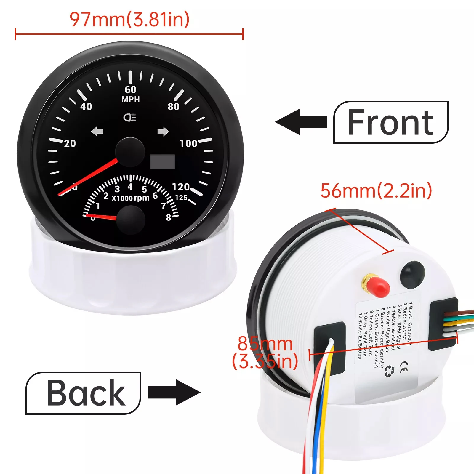 Specifications:Application: Universal fit for Motorcycle/ Boat/Truck/Bus/CarElectronic Speedometer (stepper motor)No Mechanic Sensor. get speed signal from GPSSpeed ≠0 and show accurate speed in tunnel with the help of accelerometerTotal Mileage AdjustableGPS Blind Area Odometer CompensationOverSpeed Buzzer Alarm (Value Adjustable)Indication Light (Left. Right and High BeamInstallation Diameter: 85mm (3 3/8")Speed Range: 0~125MPH/HRPM Range : 0~8000RPMMileage Range: 0-99999.9MilesWorking Voltage: 12V/24VWorking temperatures: – 40 to 85°CProtection rank: IP67 WaterproofReverse polarity protection and anti-fogging performanceBacklight: RedFeatures:Suitable for all vehicles and off-road vehiclesThe signal comes directly from the satellite signal receiver(GPS Antenna). don't need other speed sensor.The gauge has the advantages of high precision. quick location confirmation and short start up time.IP67 waterproof and dustproof gradeReverse polarity protection and anti-fogging performanceStepper motors used for full range of stepping gauges. great feature with its less power consumption. longer life. higher precision. etc.Connection:1. Black: Ground(-)2. Red: 9-32VDC(+)3. Blue: RPM Signal4. Yellow: Backlight(+)5. White: High Beam(+)6. Brown: Buzzer alarm(+)7. Green: Buzzer alarm(-)8. Yellow: Left Turn9. Gray: Right Turn10. White: Ex. Button(no need connect)==(If need to connect. please connect negative)Package Included:1x 85mm GPS speedometer1x GPS Antenna1x Wire Harness1x Installation Instruction