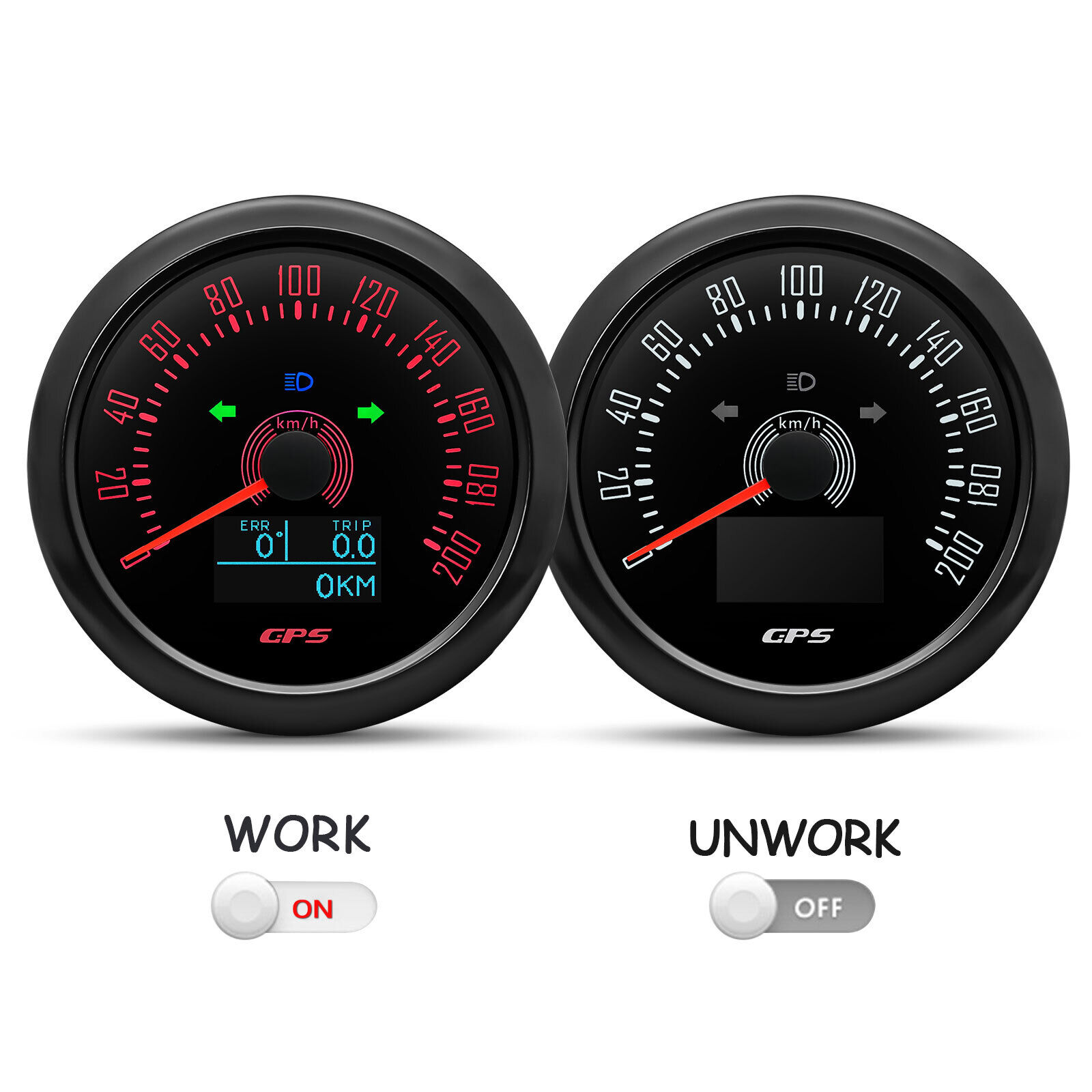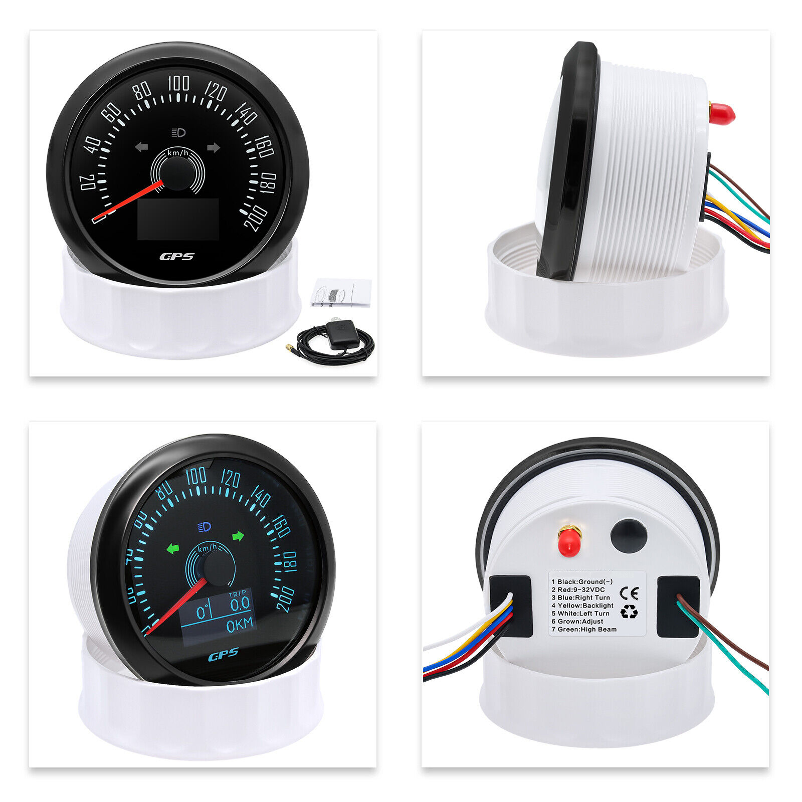 Product Features:1.Turn it on. then the meter star to search the signal and LCD will display "COG" .if there is still no GPS signal after three minute. LCD displays "Err".2.Short press the button to change the backlight color : Backlight changed in sequence: red (default) → green → blue → white → yellow → cyan →Purple → (automatic).Automatic: Automatically switch the backlight color every 1 minute. Cycle switch according to the above sequence.3.Keep on pressing the rubber button of the backside for 5 seconds. Single mileage can be cleared.Technical Data:GPS Speedometer: 0-200Km/HTotal mileage: (can't be adjusted )TRIP: Short mileage(can be adjusted )1. Save when power off2. Long press the button to resetCOG: heading. angle of navigation directionBacklight: 7 colors backlightOLED LCD screen: working temperature -40??~+80??Connection??Black: Ground(-) Red: 9-32VDCBlue: Right TurnYellow: BacklightWhite: Left TurnGrown: AdjustGreen: High BeamPackage Includes:1x GPS speedometer1x GPS Antenna