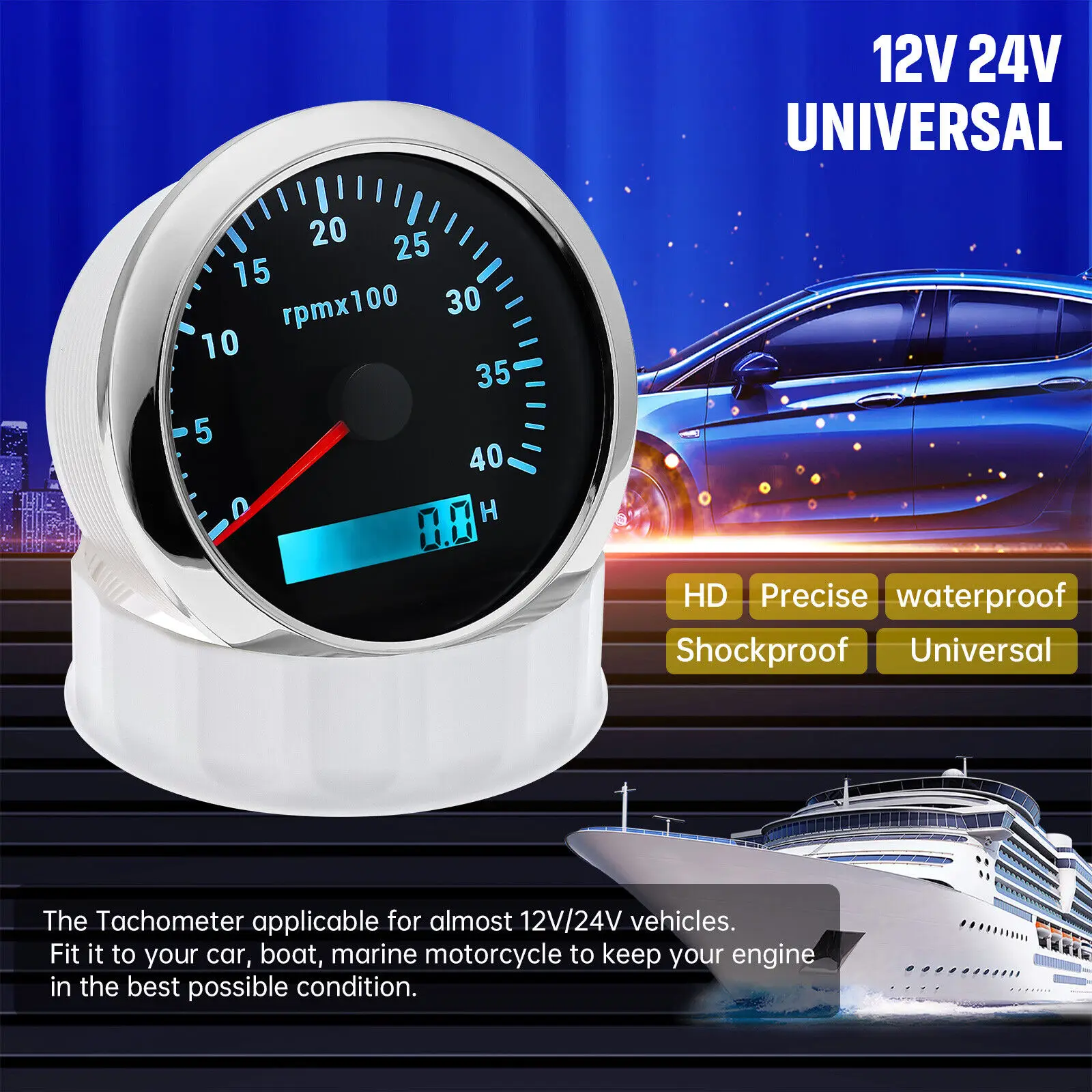 ??Function??7 Solid Color Settings will meet your requirement. The button on the lens can switch color of light you want-Colors Include Blue. Red. Green. Teal. Purple. White & Yellow. Smoked Tint lens when "off".Color LED Display when "on".??Material??85mm 3-3/8" white Face Tachoneter Gauge with a Magnified Tinted Lens. Red Illuminated needle.bright LED display during the night.??Range?? Tachometer reads from 0 to 4000 RPM. Installs to any 4.6.8.10.12 Cylinder Gas Powered Engine for 9-32V vehicles.??Stability??Boat Tachoneter Meter compatible for all kinds of tacho RPM sensors. and display the rotation speed of the engine.??After-Sale Guarantee??1 x Tachometer Gauge. 1x Cable. 1 x Instruction manual. Please contact us if you are dissatisfied with our products. the response will be taken in 24 hours and provide proper solutions.