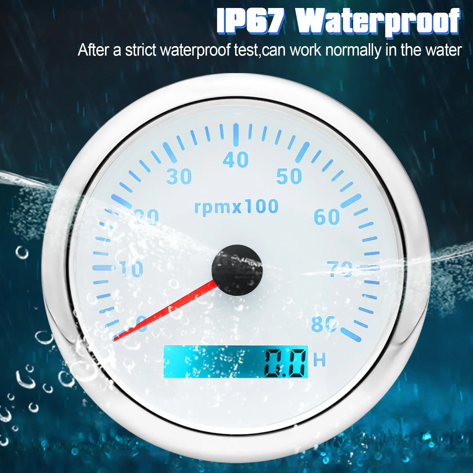 Features:RPM Tachometer Support : Car /Truck/ Boat /Diesel Generator EngineWaterproof:IP67Excellent anti-fogging function;316 Stainless steel bezel with curved glass;Convenient Installation by multi-plug socket connecting way;With curved glass( with anti-fog function).7colors Backlight (red.yellow.orange.green.blue.purple.white).customers can adjust any color that you like.Specification:Size:85mmEngine hours: 0.0-99999.9HWorking voltage: 9-32VDCWaterproof and dustproof grade IP67.Working current:??120mAWorking temperature: -30-70??Storage temperature: -40-85??Backlight: 7 Color backlight(red.yellow.orange.green.blue.purple.white).customers can adjust any color that you like)Indicating Range: 0-8000RPMSignal:Pulse Package Includes:1x Tachometer1X Cable1x Installation Instruction