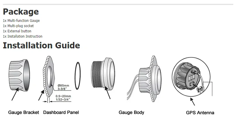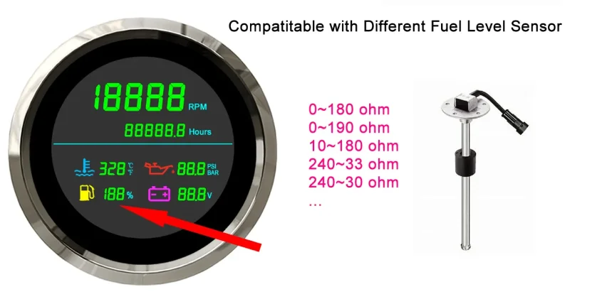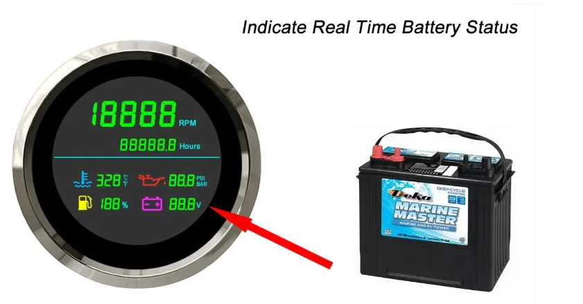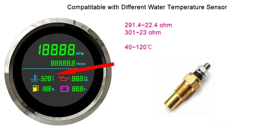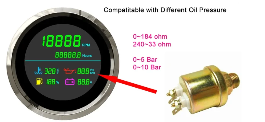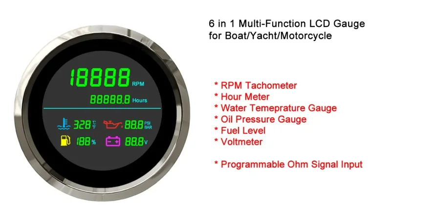 Description: | Working Voltage: 12V/24V Tachometer RPM Range: 0~199999 RPM Working temperatures: – 40 to 85°C Hour Meter Range: 0-99999.9 hours Installation Diameter: 85mm (3 3/8") Water Temperature Gauge: 0~399 ??/ ?H Face: Black. White Oil Pressure Gauge: 0~99.9 PSI/BAR Waterproof: IP66 Voltmeter Range: 0~99.9V DC |