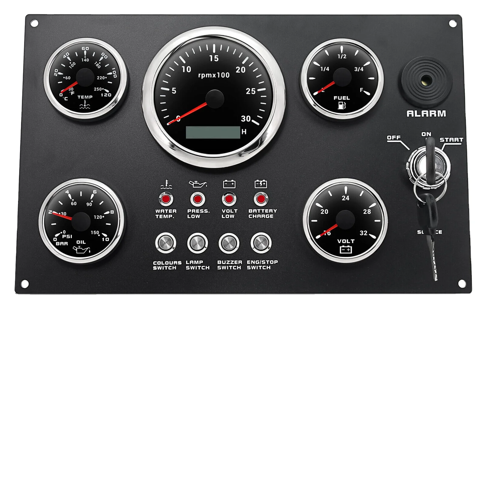 Features: | The gauge can be change: Tachometer with Digital Hour Meter:0-3000/4000/6000/7000/8000RPM Water Temperature gauge:40-120degree Oil Pressure gauge:0-5bar/0-10bar Volt meter:8-16V/16-32V Fuel Level gauge:0-190ohm/240-330hm Marine grade push button Switch (Engine Stop or Pre-heat) Marine grade Ignition key Sealed Key Switch. 4-position With Anti-restart 10A at 12V Four positions: Accessory – Off – Ignition/Accessory – Start. Spring return to Off. Key switch is constructed from engineering thermoplastic and is fully sealed using O-rings and ultrasonic welding to protect switch to ip67 (with connector installed). Plastic face nut and nickel-plated brass backing nut. Supplied with two matching keys. and with protective key boot. 2 tone Alarm Pizzo Siren |