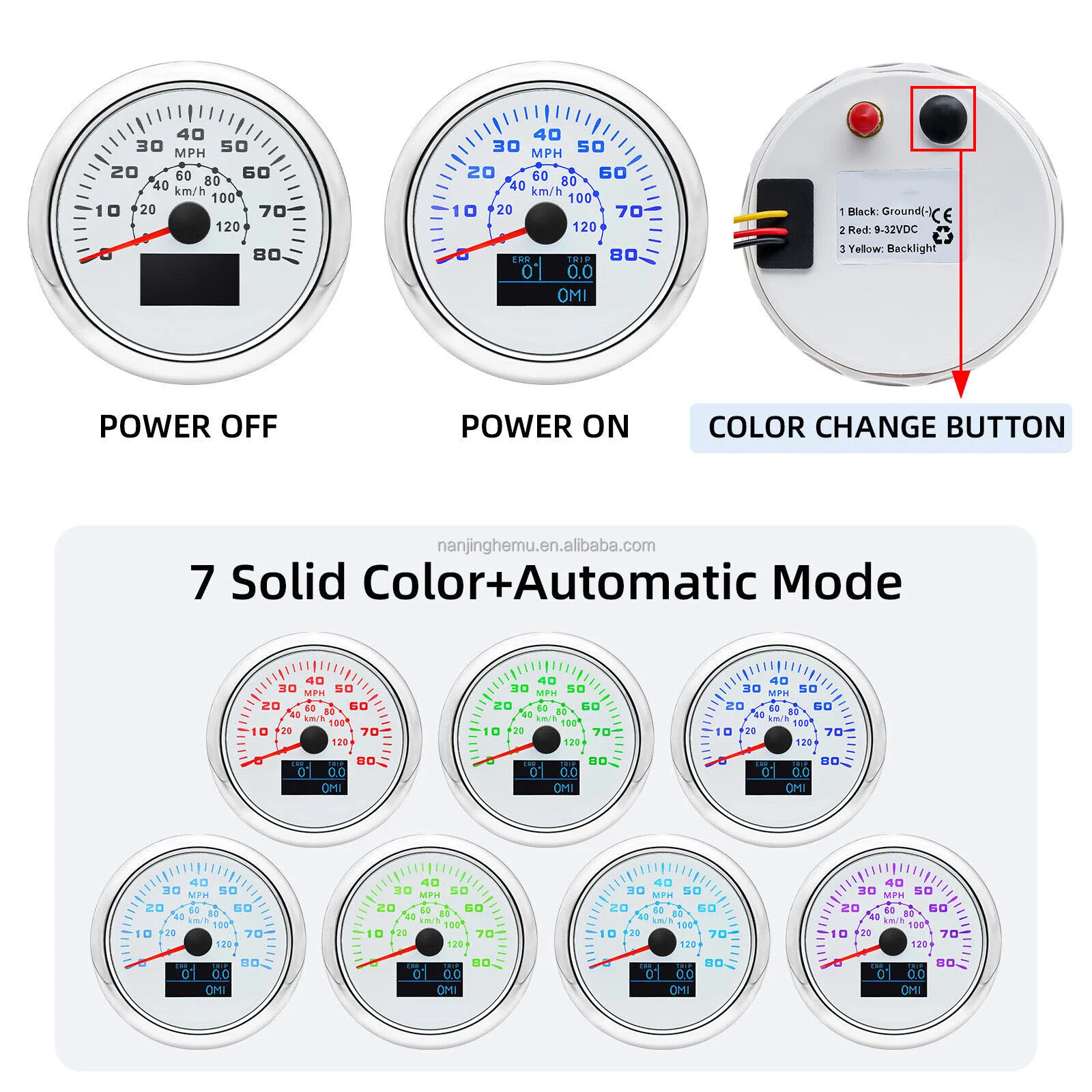 Features:Suitable for all cars. tractors. vans. vessels. boats. yachts. etc.The signal comes directly from the satellite signal receiver (GPS Speed Sensor)The gauge has the advantages of high precision. quick location confirmation and short start up time.IP67 waterproof and dustproof gradeStepper motors used for full range of stepping gauges. great feature with its less power consumption. longer life. higher precision. etc.With curved glass (with anti-fogging function)With ultra-wide working voltage design( long-term operating voltage: 9-32V. Maximum up to: 36V (≤ 1 min)) Technical Data:Fixing dimension: 85mm(3-3/8 inches)Indicating Range: 0-80MPH 0-120KM/HFaceplate Color: white faceplate with Stainless Steel.Working Voltage: 9-32VDC(12VDC/24VDC)7 Backlight color: red. green. blue. white. yellow. cyan. purple(automatic) Functions:1. The dial is printed with double units. the outer ring is English units (MPH). and the inner ring is metric units (km / h)2. COG is used to display the navigation course and orientation of the ship. and the orientation is displayed on the car3. Trip displays short mileage. which can be saved in case of power failure. Long press the key to reset. and the total mileage can also be displayed. which can be saved in case of power failure.4. Displays the total mileage. which is not adjustable.5. LED LCD. working temperature – 40 ?? ~ + 80 ??