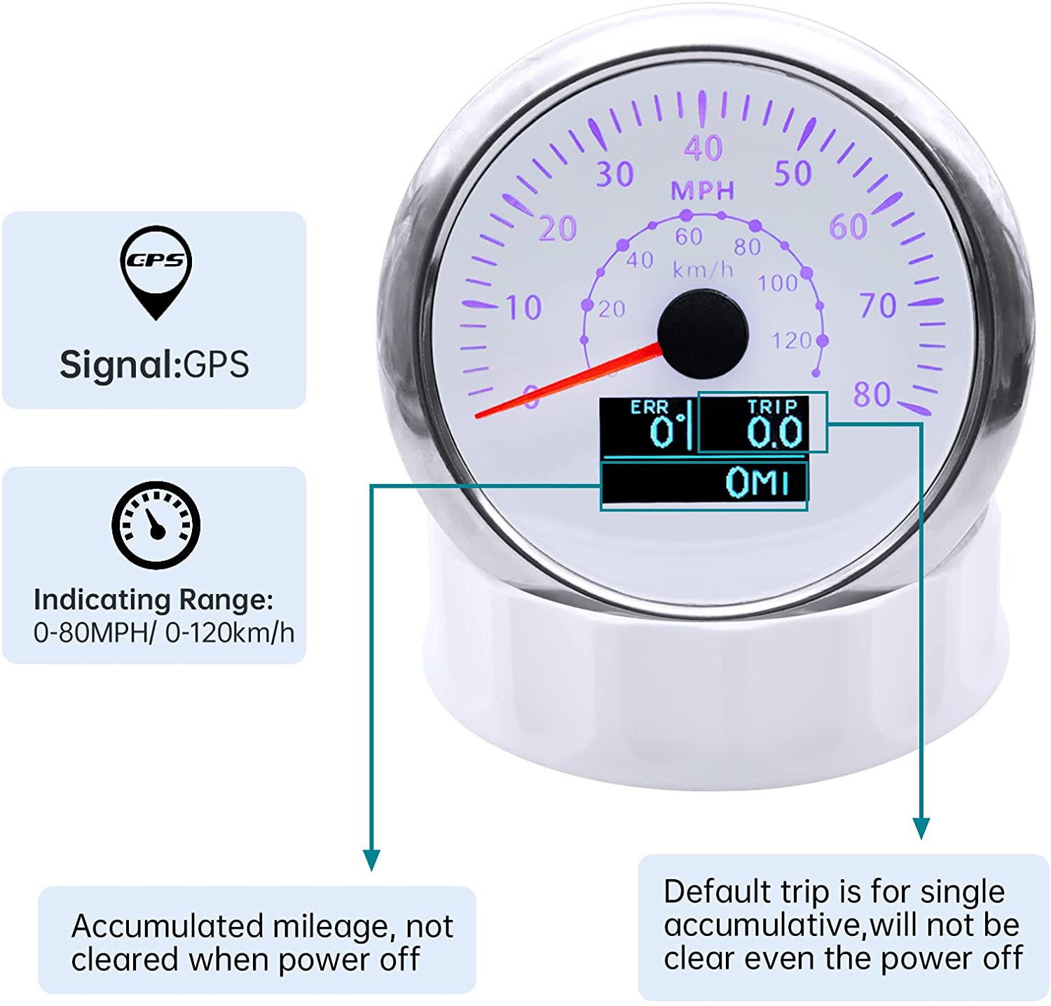 Features:Suitable for all cars. tractors. vans. vessels. boats. yachts. etc.The signal comes directly from the satellite signal receiver (GPS Speed Sensor)The gauge has the advantages of high precision. quick location confirmation and short start up time.IP67 waterproof and dustproof gradeStepper motors used for full range of stepping gauges. great feature with its less power consumption. longer life. higher precision. etc.With curved glass (with anti-fogging function)With ultra-wide working voltage design( long-term operating voltage: 9-32V. Maximum up to: 36V (≤ 1 min)) Technical Data:Fixing dimension: 85mm(3-3/8 inches)Indicating Range: 0-80MPH 0-120KM/HFaceplate Color: white faceplate with Stainless Steel.Working Voltage: 9-32VDC(12VDC/24VDC)7 Backlight color: red. green. blue. white. yellow. cyan. purple(automatic) Functions:1. The dial is printed with double units. the outer ring is English units (MPH). and the inner ring is metric units (km / h)2. COG is used to display the navigation course and orientation of the ship. and the orientation is displayed on the car3. Trip displays short mileage. which can be saved in case of power failure. Long press the key to reset. and the total mileage can also be displayed. which can be saved in case of power failure.4. Displays the total mileage. which is not adjustable.5. LED LCD. working temperature – 40 ?? ~ + 80 ??