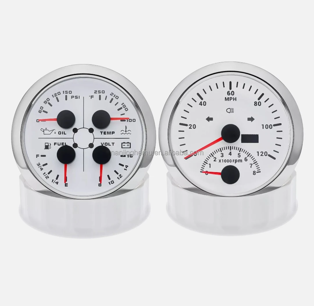 Features:The world's newest 4 in 1 multifunction gauge.Convenient Installation by multi-plug socket connecting way.The gauge has the advantages of high precision. quick location confirmation and short start up time.Most importantly. the gauge is easy to setup. and can be used in all vehicles. boats and off-road vehicles.4in 1 Mulfifunctional gauge Technical Data:Fixing dimension: 85mmIndicating Range: Oil press. meter: 0-150psi;Water temp. meter: 100-250° FFuel level meter: 0-190ohms/240-33ohms. empty-full; (The signal can be adjusted)Voltmeter: 8-16VWorking Voltage: 12VBacklight: RedInput Signal:10-184ohms for 0-150PSI oil pressure meter;0-190ohms for fuel level meter;(Default 0-190ohms. can adjust to 240-33ohms)8-16V voltage meter;Input Signal 287.4-22.4ohms for water temperature meterRed backlightProtection grade is IP67. the whole body is completely waterproof;Excellent antifogging function;316 Stainless steel bezel with curved glass;Convenient Installation by multi-plug socket connecting way;Accessories: matched with connectors. Installation InstructionGPS Speedometer Specifications:Application: Universal fit for Motorcycle/ Boat/Truck/Bus/CarElectronic Speedometer (stepper motor)No Mechanic Sensor. get speed signal from GPSSpeed ≠0 and show accurate speed in tunnel with the help of accelerometerTotal Mileage AdjustableGPS Blind Area Odometer CompensationOverSpeed Buzzer Alarm (Value Adjustable)Indication Light (Left. Right and High Beam)Installation Diameter: 85mm (3 3/8")Speed Range: 0~200MPHRPM Range : 0~8000RPMMileage Range: 0-99999.9milesWorking Voltage: 12V/24VWorking temperatures: – 40 to 85°CProtection rank: IP67 WaterproofReverse polarity protection and anti-fogging performancePackage Included:1 x 85mm 4 in 1 Multifunctional Gauge1 x 85mm GPS Speedometer2 x Cable2 x Installation Instruction