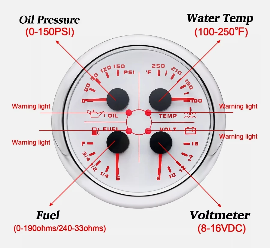 Features:The world's newest 4 in 1 multifunction gauge.Convenient Installation by multi-plug socket connecting way.The gauge has the advantages of high precision. quick location confirmation and short start up time.Most importantly. the gauge is easy to setup. and can be used in all vehicles. boats and off-road vehicles.4in 1 Mulfifunctional gauge Technical Data:Fixing dimension: 85mmIndicating Range: Oil press. meter: 0-150psi;Water temp. meter: 100-250° FFuel level meter: 0-190ohms/240-33ohms. empty-full; (The signal can be adjusted)Voltmeter: 8-16VWorking Voltage: 12VBacklight: RedInput Signal:10-184ohms for 0-150PSI oil pressure meter;0-190ohms for fuel level meter;(Default 0-190ohms. can adjust to 240-33ohms)8-16V voltage meter;Input Signal 287.4-22.4ohms for water temperature meterRed backlightProtection grade is IP67. the whole body is completely waterproof;Excellent antifogging function;316 Stainless steel bezel with curved glass;Convenient Installation by multi-plug socket connecting way;Accessories: matched with connectors. Installation InstructionGPS Speedometer Specifications:Application: Universal fit for Motorcycle/ Boat/Truck/Bus/CarElectronic Speedometer (stepper motor)No Mechanic Sensor. get speed signal from GPSSpeed ≠0 and show accurate speed in tunnel with the help of accelerometerTotal Mileage AdjustableGPS Blind Area Odometer CompensationOverSpeed Buzzer Alarm (Value Adjustable)Indication Light (Left. Right and High Beam)Installation Diameter: 85mm (3 3/8")Speed Range: 0~200MPHRPM Range : 0~8000RPMMileage Range: 0-99999.9milesWorking Voltage: 12V/24VWorking temperatures: – 40 to 85°CProtection rank: IP67 WaterproofReverse polarity protection and anti-fogging performancePackage Included:1 x 85mm 4 in 1 Multifunctional Gauge1 x 85mm GPS Speedometer2 x Cable2 x Installation Instruction