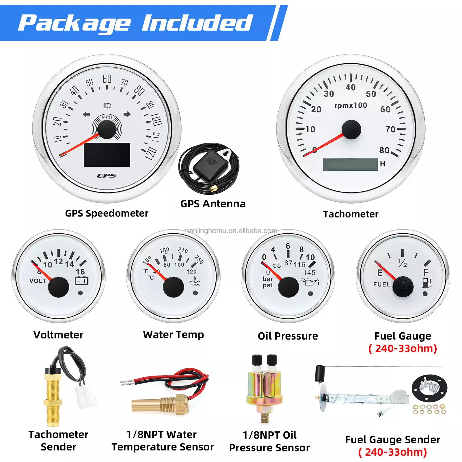 GPS Speedometer:Fixing dimension:85mm(3-3/8 inches)Indicating Range:0-120MPHItem: White&SiliverWorking Voltage:9-32VDC(12VDC/24VDC)7 Backlight color:red.green.blue.white.yellow.cyan.purpleTachometer Engine hours:0.0-99999.9HBacklight:7 Color backlightIndicating Range:0~8000 RPMSignal:PulseFor Tachometer.you can substitute for different unit. please contact us before / after purchase or note on the order.Tachometer: 0-3000rpm/0-4000RPM/6000RPM/7000RPMVolt GaugeSizes:52 mm (2-1/16")Measuring Range:8-16 (V)Backlight: 7 ColorsFuel Level GaugeSizes:52 mm (2-1/16")Measuring Range:Empty – FullResistance: 240 (E)-33 (F) ohmsBacklight:7 ColorsWater Temperature GaugeInstall diameter: Φ52mmIndication range: 0~120??/100-250?HInput signal: 287.4~22.4 ohmStorage temperature: -40~+85Backlight: 7 ColorsOil Pressure GaugeInstall diameter:Φ52mm or 2-1/16"Indication range:0~10bar/0-145 PSIOperating temperature:-30~+75Storage temperature:-40~+85Backlight: 7 ColorsPackage Includes:1X 85MM Digital GPS Speedometer Gauge1X GPS Antenna1X Tachometer1X Voltmeter1X Fuel level gauge1X Water temp gauge1X Oil pressure gauge 1x Fuel level Sending Units (240-33ohms)1X Oil pressure Sensor (1/8NPT)1X water temp Sensor (1/8NPT) 1X Tachometer Sensor(M16*1.5)Installation InstructionNOTES: The Sending units will be included