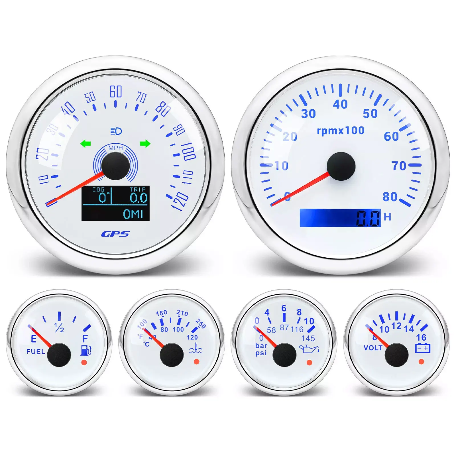 GPS Speedometer:Fixing dimension:85mm(3-3/8 inches)Indicating Range:0-120MPHItem: White&SiliverWorking Voltage:9-32VDC(12VDC/24VDC)7 Backlight color:red.green.blue.white.yellow.cyan.purpleTachometer Engine hours:0.0-99999.9HBacklight:7 Color backlightIndicating Range:0~8000 RPMSignal:PulseFor Tachometer.you can substitute for different unit. please contact us before / after purchase or note on the order.Tachometer: 0-3000rpm/0-4000RPM/6000RPM/7000RPMVolt GaugeSizes:52 mm (2-1/16")Measuring Range:8-16 (V)Backlight: 7 ColorsFuel Level GaugeSizes:52 mm (2-1/16")Measuring Range:Empty – FullResistance: 240 (E)-33 (F) ohmsBacklight:7 ColorsWater Temperature GaugeInstall diameter: Φ52mmIndication range: 0~120??/100-250?HInput signal: 287.4~22.4 ohmStorage temperature: -40~+85Backlight: 7 ColorsOil Pressure GaugeInstall diameter:Φ52mm or 2-1/16"Indication range:0~10bar/0-145 PSIOperating temperature:-30~+75Storage temperature:-40~+85Backlight: 7 ColorsPackage Includes:1X 85MM Digital GPS Speedometer Gauge1X GPS Antenna1X Tachometer1X Voltmeter1X Fuel level gauge1X Water temp gauge1X Oil pressure gauge 1x Fuel level Sending Units (240-33ohms)1X Oil pressure Sensor (1/8NPT)1X water temp Sensor (1/8NPT) 1X Tachometer Sensor(M16*1.5)Installation InstructionNOTES: The Sending units will be included