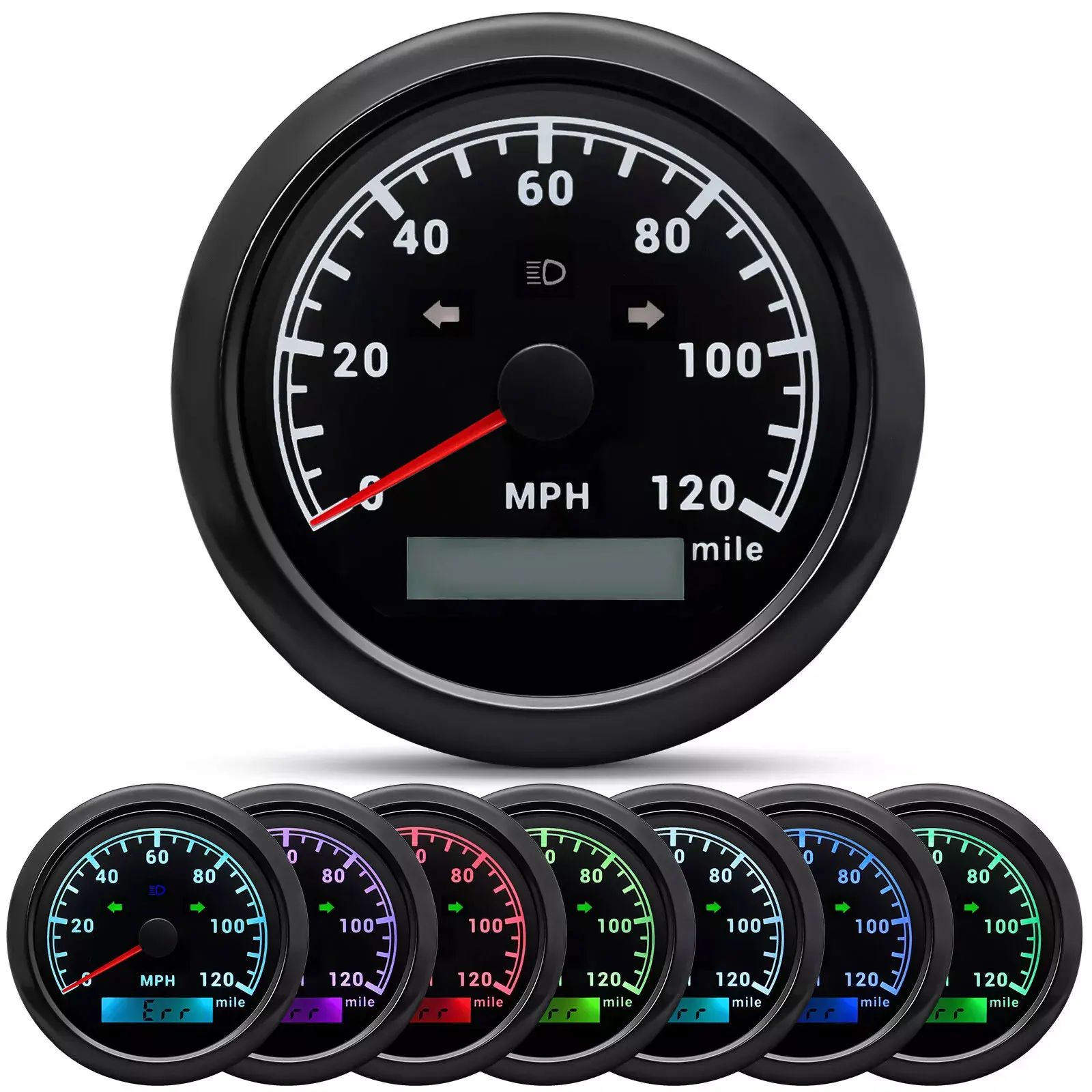 Feature:High-brightness LED backlight.316 stainless steel for long-term use even in acid-base. humid environment.IP67 waterproof and dust-proof grade.With curved glass( with anti-fog function).Suitable for all kinds of vehicle modification.Using stepper motor drive pointer. accurate display of the engine speed. and with the LCD display clear display mileage.Gauges have many kinds backlight color (red.yellow.orange.green.blue.purple.white).customers can adjust any color that you likeProduct Detail Speedometer GaugeCondition: 100% Brand NewItem Type: GPS SpeedometerInstallation Size: 85mm/3.3inchWorking Voltage: 9-32V (12V/24V)Protection Grade:IP67Mileage Range: 0-999999 milesIndicative Range: 0-120MPHGPS Blind Area Odometer CompensationOverSpeed Buzzer Alarm (Value Adjustable)Indication Light: LEFT. HIGH BEAM. RIGHTBacklight: 7 Colors LEDWorking Temperatures: -40 ~ 85°COperation mode: LCD Display. Stepper MotorTachometer Engine hours: 0.0-99999.9HBacklight :7 Color backlightIndicating Range: 0~8000 RPMSignal : PulseFor Tachometer. you can substitute for different unit. please contact us before / after purchase or note on the order.Tachometer: 0-3000rpm/0-4000RPM/6000RPM/7000RPMVolt GaugeSizes: 52 mm (2-1/16")Measuring Range: 8 -16 (V)Backlight: 7 ColorsFuel Level GaugeSizes: 52 mm (2-1/16")Measuring Range: Empty – FullResistance: 240 (E) – 33 (F) ohmsBacklight: 7 ColorsWater Temperature GaugeInstall diameter: Φ52mmIndication range: 0~120??/30-250?HInput signal: 287.4~22.4 ohmsStorage temperature: -40~+85?? Backlight: 7 ColorsOil Pressure GaugeInstall diameter:Φ52mm or 2-1/16"Indication range:0~10bar / 0-150 PSIOperating temperature:-30~+75?? Storage temperature:-40~+85?? Backlight: 7 ColorsPackage Includes:1X 85MM GPS Speedometer Gauge1X GPS Antenna1x 85MM Tachometer1x 52MM Fuel level gauge1X 52MM Voltmeter1X 52MM Water temp gauge1X 52MM Oil pressure gauge 1x Fuel level Sending Units1X Oil pressure Sensor (1/8NPT)1X water temp Sensor (1/8NPT) 1X Tachometer Sensor(M16*1.5)6X Installation Instruction