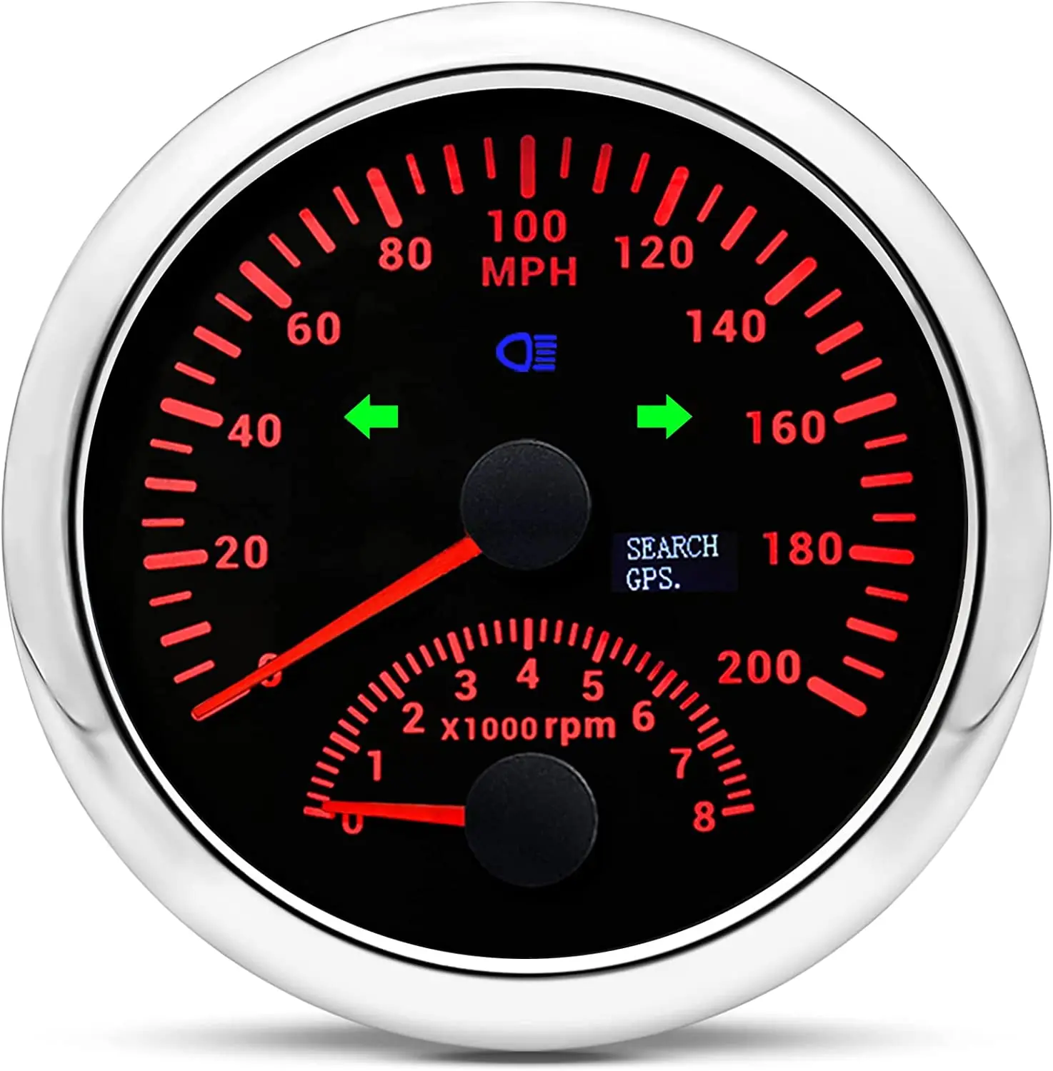 ??GPS Speedometer with Tachometer Wide Applicability?? The speedometer gauge indicating Range: 0-120MPH and 0-8000rpm. Indication light: LEFT. HIGH BEAM. RIGHT. Suitable for all vehicles Motorcycle/ Boat/Truck/Bus/Car and off-road vehicles.