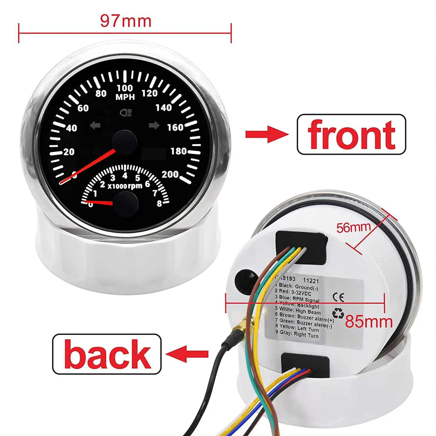 ??Function??The GPS speedometer gauge indicating Range: 0-200MPH. tachometer: 0-8000rpm. Indication light: LEFT. HIGH BEAM. RIGHT.Mileage Range: 0-99999.9miles. OverSpeed Buzzer Alarm (Value Adjustable).??Material??85mm(3 3/8") GPS speedometer is made of Stainless Steel 316L Bezel. Rubber. Anti-fog Glass. IP67 waterproof and dustproof grade.??Wide Applicability??Suitable for all vehicles Motorcycle/ Boat/Truck/Bus/Car and off-road vehicles. It gets quicker under a clear view of the sky. The signal comes directly from the satellite signal receiver(GPS Antenna). don't need other speed sensor.??Stability??The universal gps speedometer gauge has the advantages of high precision. quick location confirmation and short start up time.??After-Sale Guarantee??Included 1x GPS speedometer with tachometer. 1x GPS Antenna. 1x Multi-plug socket. 1x Installation Instruction. Please contact us if you are dissatisfied with our products. the response will be taken in 24 hours and provide proper solutions.