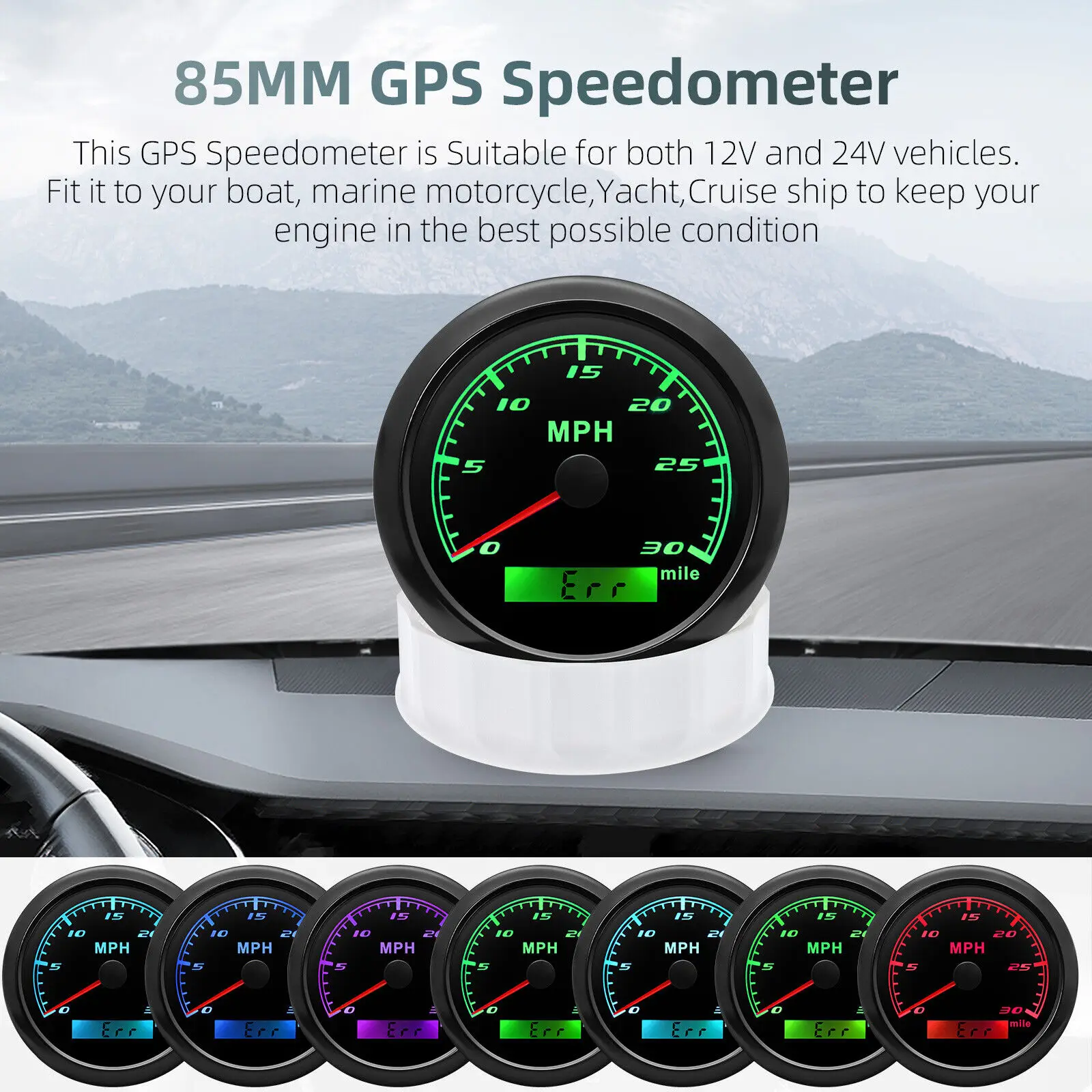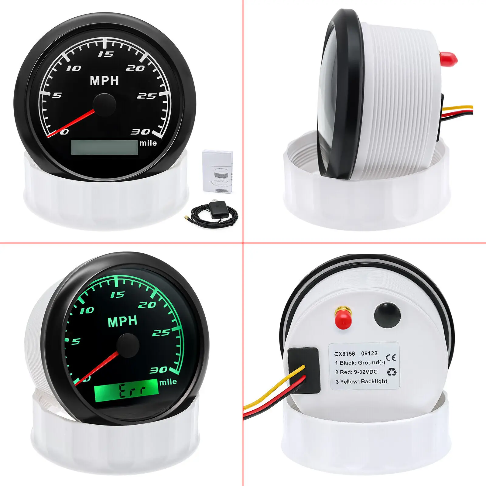 DescriptionsHigh-brightness LED backlight.316 stainless steel for long-term use even in acid-base. humid environment.IP67 waterproof and dust-proof grade.With curved glass( with anti-fog function).Suitable for all kinds of vehicle modification.Using stepper motor drive pointer. accurate display of the engine speed. and with the LCD display clear display mileage.Gauges have many kinds backlight color (red. green. blue. white. yellow. cyan. purple(automatic)).customers can adjust any color that you likeSpecification:- Material: Stainless Steel 316L Bezel + Anti-fog Glass- Install Diameter: Φ85mm or 3-3/8"- Signal: GPS- Indication Range: 0-30mph- Working Voltage: 9~32V DC- Working Current: ≤100mA- Operating Temperature: -30?? ~ 75??- Storage Temperature: -40?? ~ 85??- IP67 waterproof and dustproof grade Connection:Black: Ground(-)Red: 9-32VDCYellow: Backlight Package Includes:1 x GPS Speedometer Gauge1x GPS Antenna1 x Wire Harness1 x Instruction