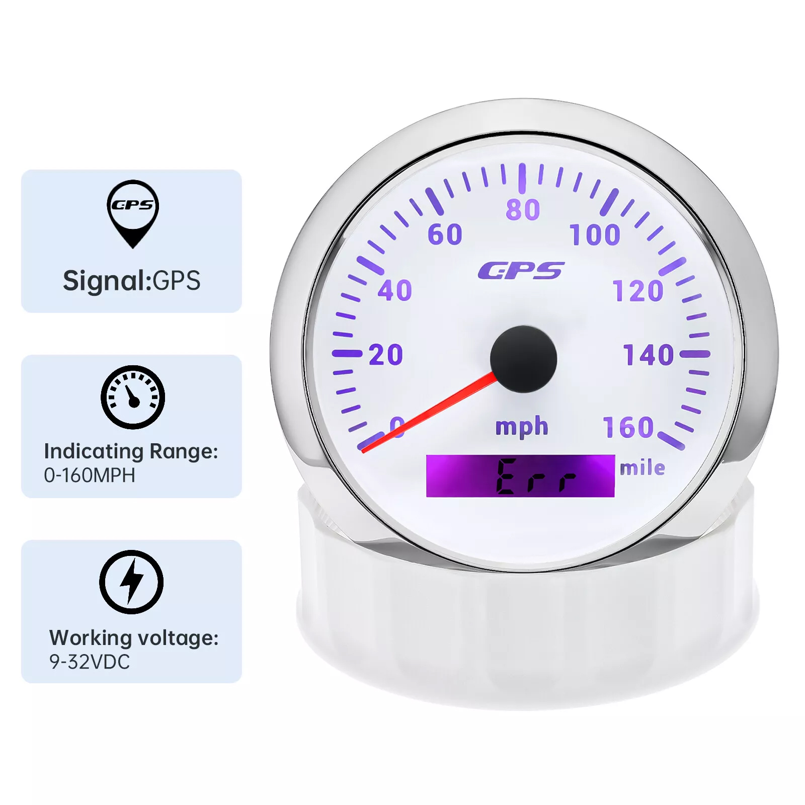 Feature:IP67 waterproof and dust-proof grade.With curved glass( with anti-fog function).Suitable for all kinds of vehicle modification.316 stainless steel for long-term use even in acid-base.humid environment.Using stepper motor drive pointer.accurate display of the engine speed.and with the LCD display clear display mileage.Gauges have many kinds backlight color(red.yellow.orange.green.blue.purple. white).customers can adjust any color that you like.Specification:Material:Stainless Steel 316L Bezel+Anti-fog GlassInstall Diameter:Φ85mm or 3-3/8"Signal:GPSWorking Voltage:9~32V DCWorking Current: ≤100mAOperating Temperature:-30?? ~ 75??Storage Temperature:-40?? ~ 85??P67 waterproof and dustproof gradeIndication Range:0-160MPHBacklight:7 Colors BackligtPackage Included: (as the picture shows)1 X 85MM Digital GPS Speedometer Gauge1 X Instruction1 X Wire Harness1 X GPS Antenna