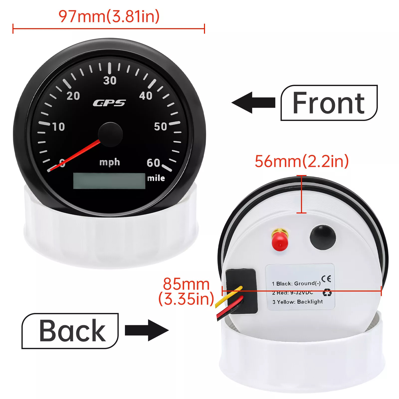 Feature:IP67 waterproof and dust-proof grade.With curved glass( with anti-fog function).Suitable for all kinds of vehicle modification.316 stainless steel for long-term use even in acid-base.humid environment.Using stepper motor drive pointer.accurate display of the engine speed.and with the LCD display clear display mileage.Gauges have many kinds backlight color(red.yellow.orange.green.blue.purple. white).customers can adjust any color that you like.Specification:Material:Stainless Steel 316L Bezel+Anti-fog GlassInstall Diameter:Φ85mm or 3-3/8"Signal:GPSWorking Voltage:9~32V DCWorking Current: ≤100mAOperating Temperature:-30?? ~ 75??Storage Temperature:-40?? ~ 85??P67 waterproof and dustproof gradeIndication Range:0-60MPHBacklight:7 Colors BacklightPackage Included: (as the picture shows)1 X 85MM Digital GPS Speedometer Gauge1 X Instruction1 X Wire Harness1 X GPS Antenna