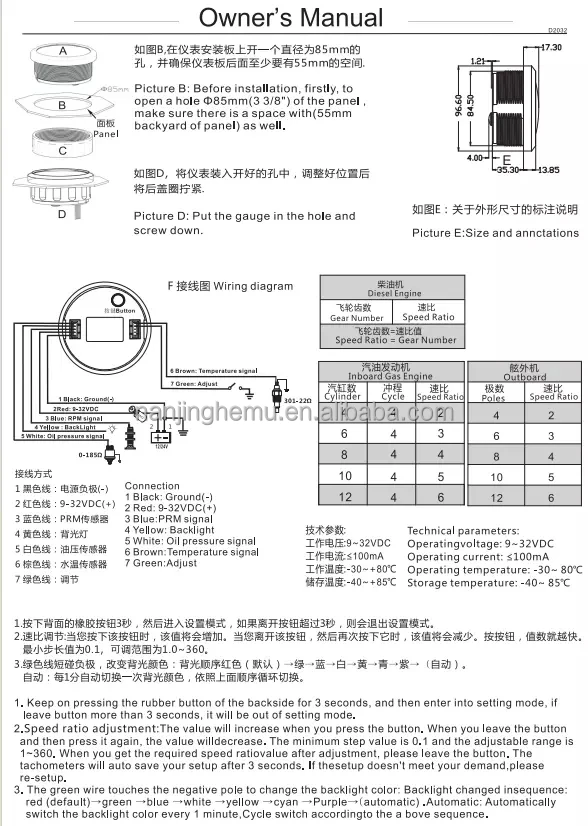 Features:RPM Tachometer Support:Car /Truck/ Boat /Diesel Generator Engine /Gasoline EngineWaterproof:IP 67Excellent anti-fogging function;316 Stainless steel bezel with curved glass;Convenient Installation by multi-plug socket connecting way;With curved glass( with anti-fog function).7 colors baclight for your choose (red (default)→green →blue →white →yellow →cyan →Purple→(automatic)).customers can adjust any color that you likeTachometer fit for Car /Truck/ Boat /Diesel Generator Engine /Gasoline EngineSpecification: Size:85mmTachometer:0-6000RPMOil pressure:0~10BarWater temperature:40-120??Engine hours:0.0-99999.9HWorking voltage:9-32VDCWorking current:??100mAWorking temperature: 30-80??Storage temperature:-40-85??Backlight :7 Color backlightColor:White&SilverInput parameter(The sensor will be not included)Oil pressure sensor: 10~184ohmsTemperature sensor: 301~22ohmsConnection1 Black:Ground(-)2 Red:9-32vDC(+)3 Blue:PRM signal4 Yellow:Backlight5 White:Oil pressure signal6 Brown:Temperature signal7 Green:AdjustPackage Included:1 x 85mm 3 in 1 Multifunctional Gauge1 x Cable1 x Installation Instruction