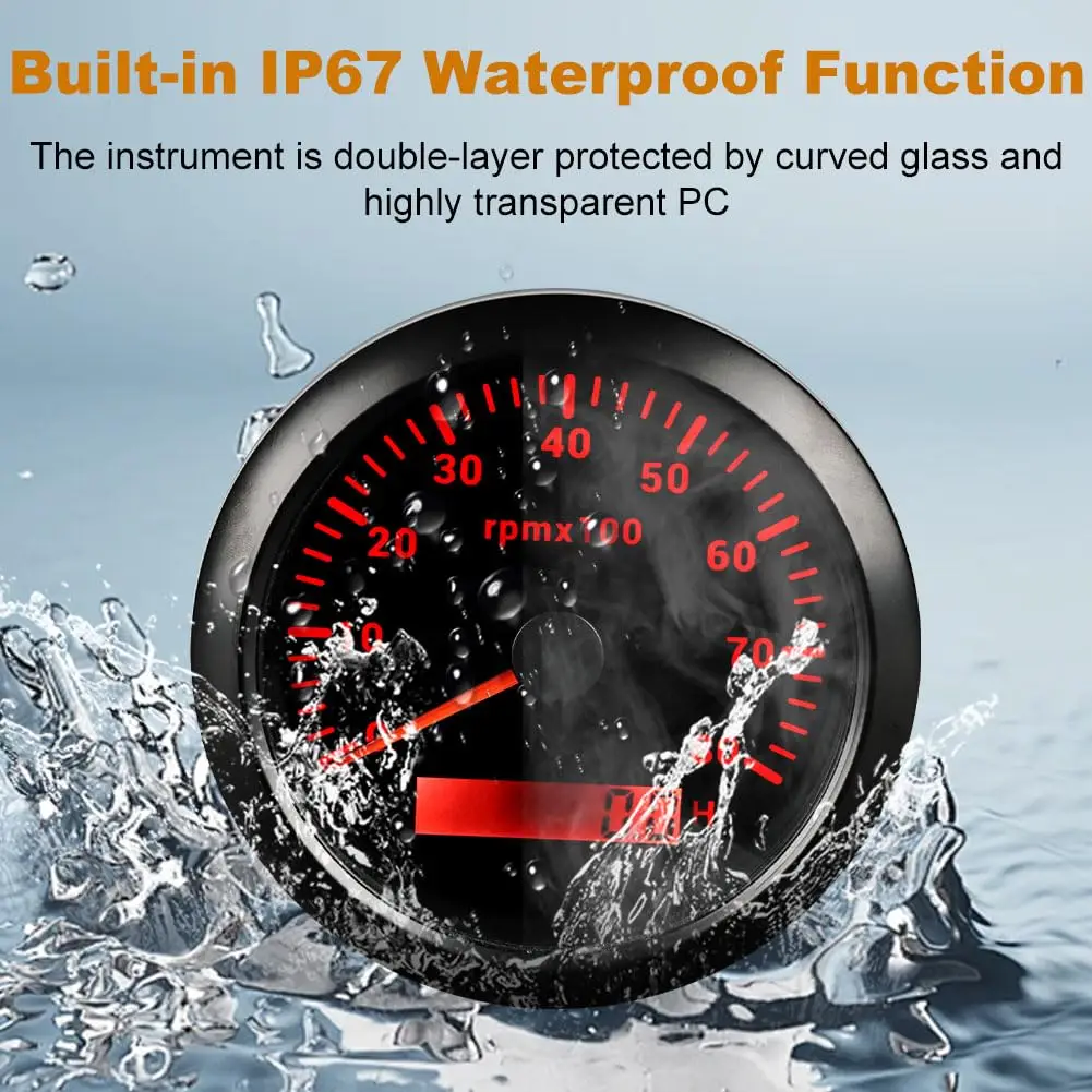 1.Be suitable for all kinds of tacho RPM sensors. and display the rotation speed of the engine.2.Use moving-magnet principle to drive the needle. featuring good endurance and anti-vibration.3.IP67 waterproof and dustproof grade4.Stepper motors used for full range of stepping gauges. great feature with its less power consumption. longer life. higher precision. etc.5.With curved glass (with anti-fogging function)6.With ultra-wide working voltage design( long-term operating voltage: 9-32V. Maximum up to: 36V (≤ 1 min)).